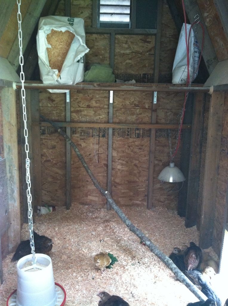 Here's the inside of my coop. The current roosts and the hanging feeder are temporary since I plan to keep the feed/water outside. See the shelf in the back of the coop? I was thinking about making the roosts above the shelf (since it is closer to the top of the coop, heat rises and we live in chilly climate). The shelf has linoleum on it now and I could dust it with DE or some sand to make scooping up the poop easier. I'd probably do that 2-3x a week...ish? I could put a 2x4 across the front to keep droppings and sand from spilling down below onto the litter. Their roosting boxes will be under the shelf, raised up about 18", also creating more floor space instead of taking up precious room for them to walk around. My question is how will the girls get up to their roosts and get down again? I want something installed in the coop that can be moved around or taken out so cleaning out the litter will be easy (as will spreading more litter and DE). I guess I just need some suggestions on placement of a ladder for them to climb or something of the sort. If you look at the left wall of the coop, there is a piece of board attached to the wall with hinges, and it can be swung upward; if something were placed underneath it, like a pole, I think it would be a nice halfway point for the girls to jump to and then jump up top, but I don't know if full size birds can jump and flap up that high safely. Help!
