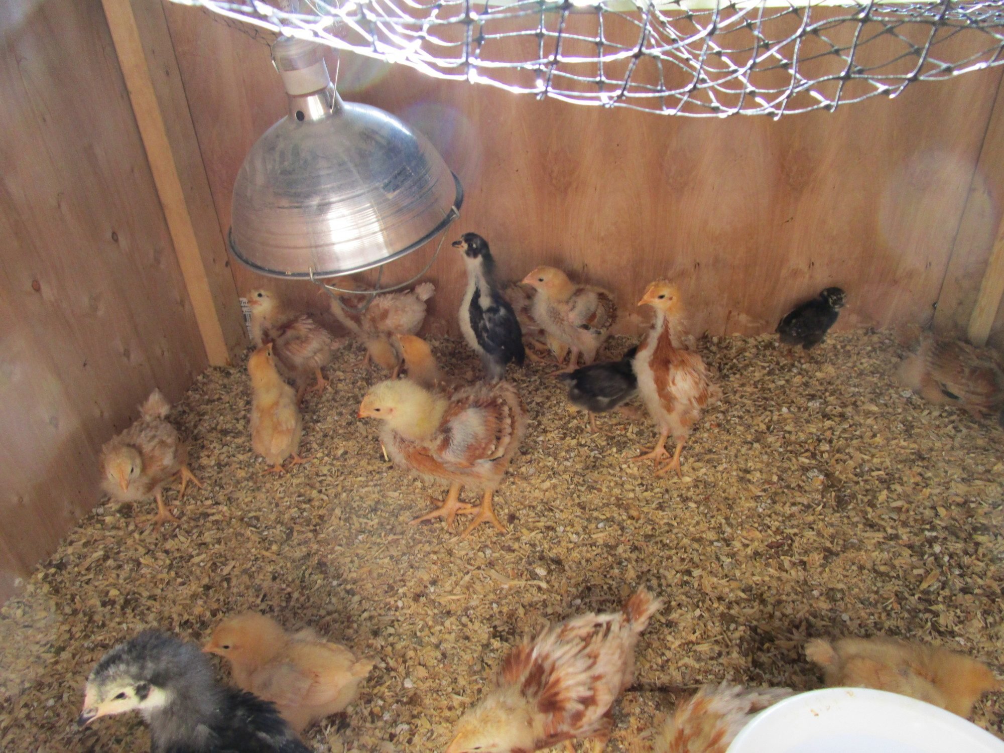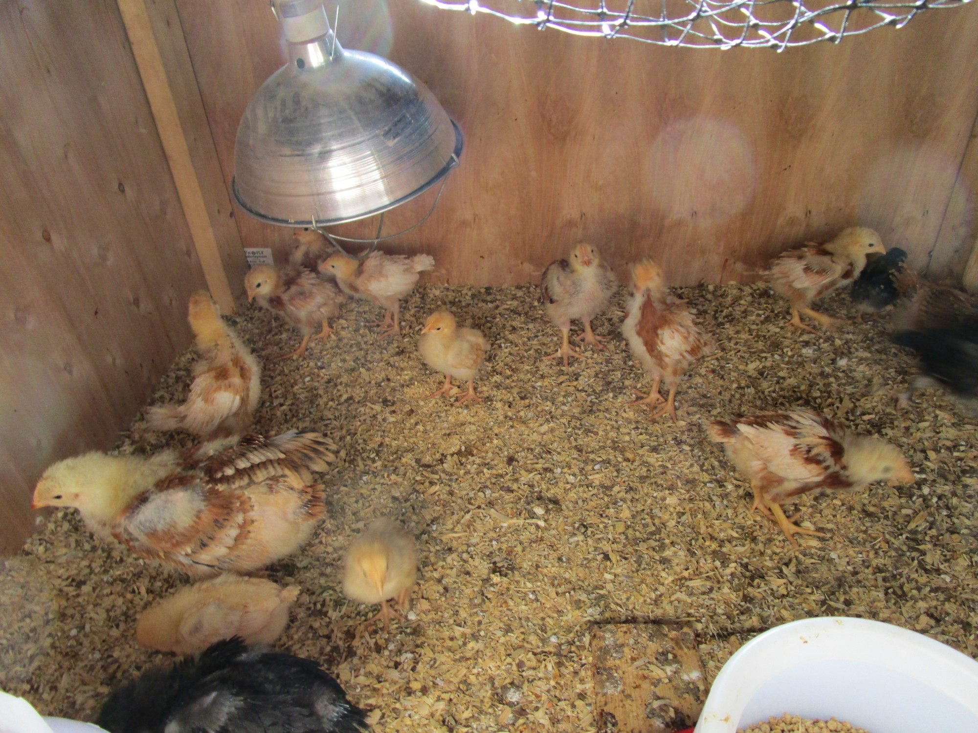 As can be seen in the preceding photographs, our chicks have quite a disparity in both age and size. In the second picture for example, the little Orpington is almost the exact same size as the head and neck of the sex-link to her immediate left.