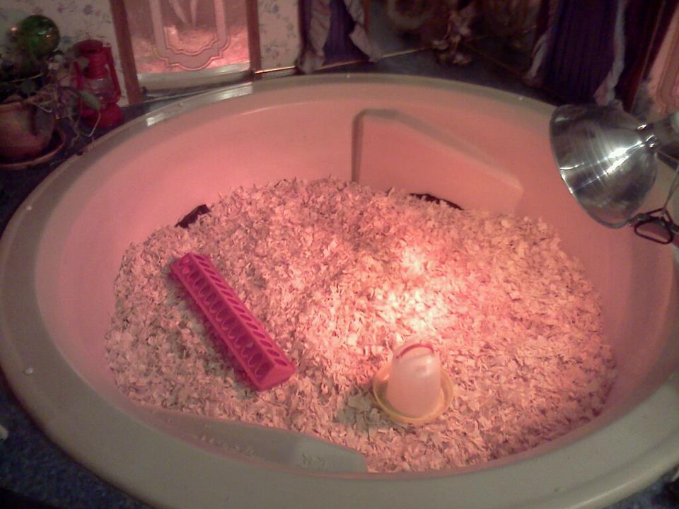 Just a suggestion--I'd angle that heat lamp straight down so in heats a smaller area. In a heated house you need to be sure they can get away from the heat more than you need to warm them up. The majority of the brooder space should be ambient temp, not heated by the lamp.