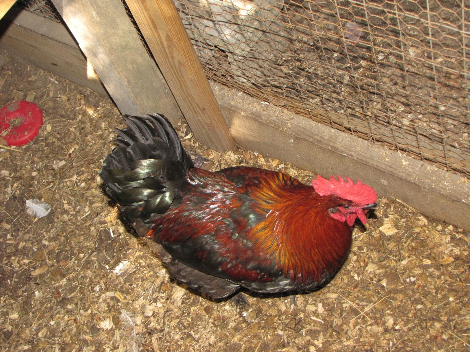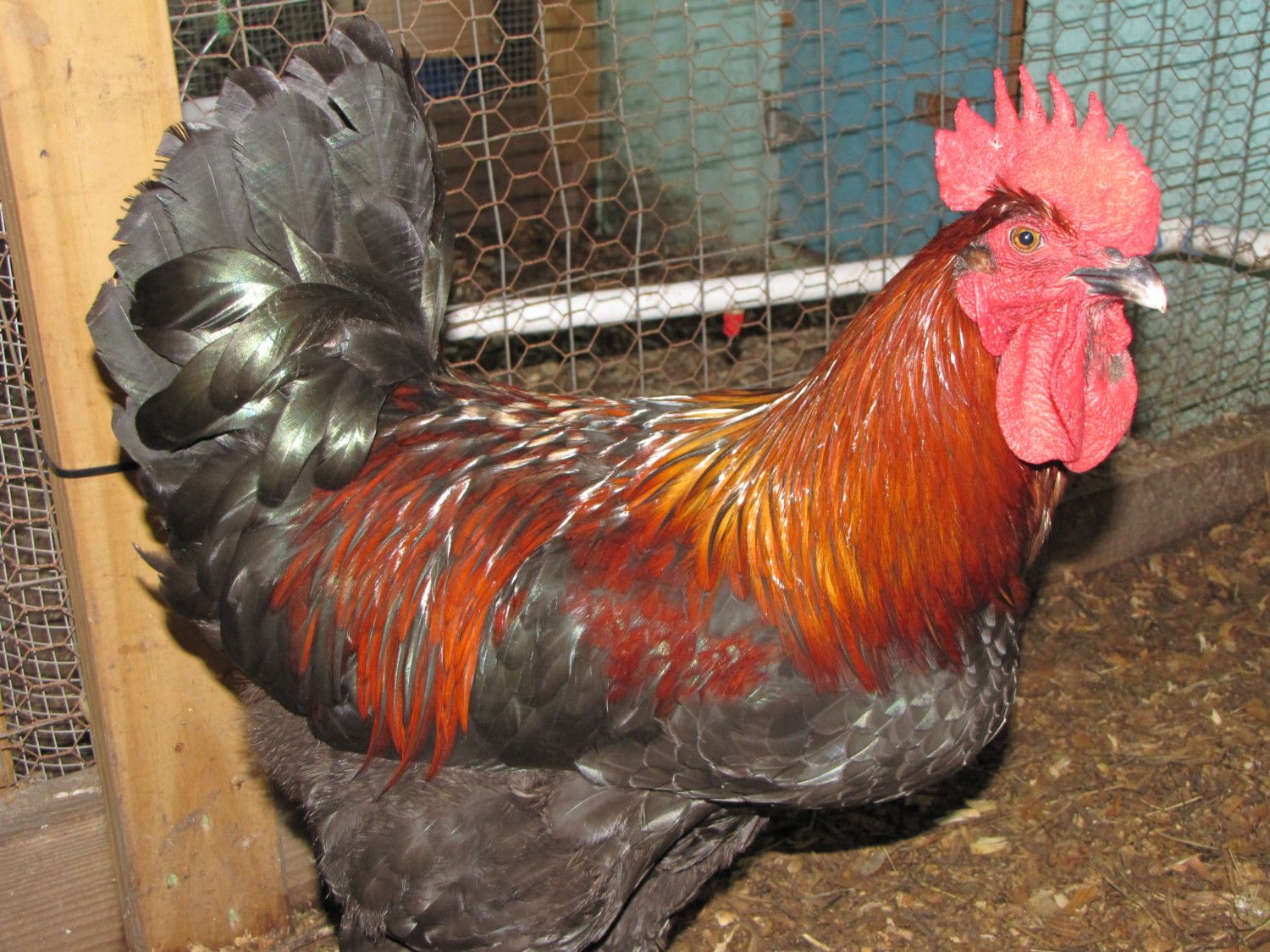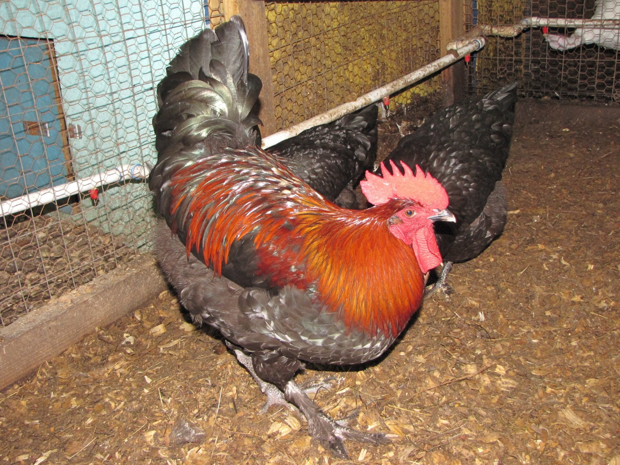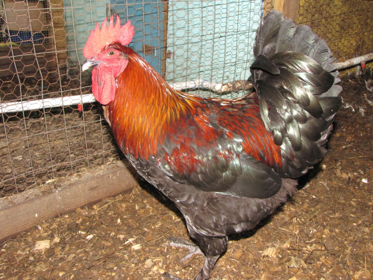 here father and son . What did we gain from the mama hen and what we lost. 1) father had a great tail shape ,form and Angle / the son has a light long tail = mam carry the high tail gene = do no mate him back to her. 2)father had a darker copper / son has a correct copper = mama hen did magic ( she must carry more gold than Mahogany) = could be mated back to her to establish the color. 3) Father had a short back / son have a correct back = mama hen must had a long correct back =could be mated back to her to reinforce the back. Comb Father and son almost the same = mama hen hasn t got the great comb to correct the fault. 4) father had a good mass /son too tall and slim = mama hen didn t had a great mass = not to be mated back to her. chooks man