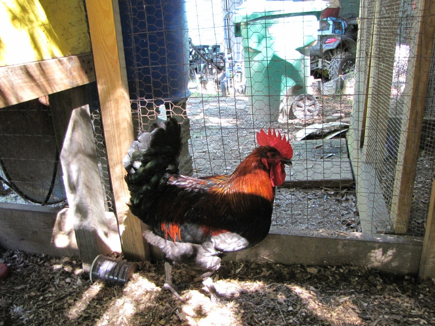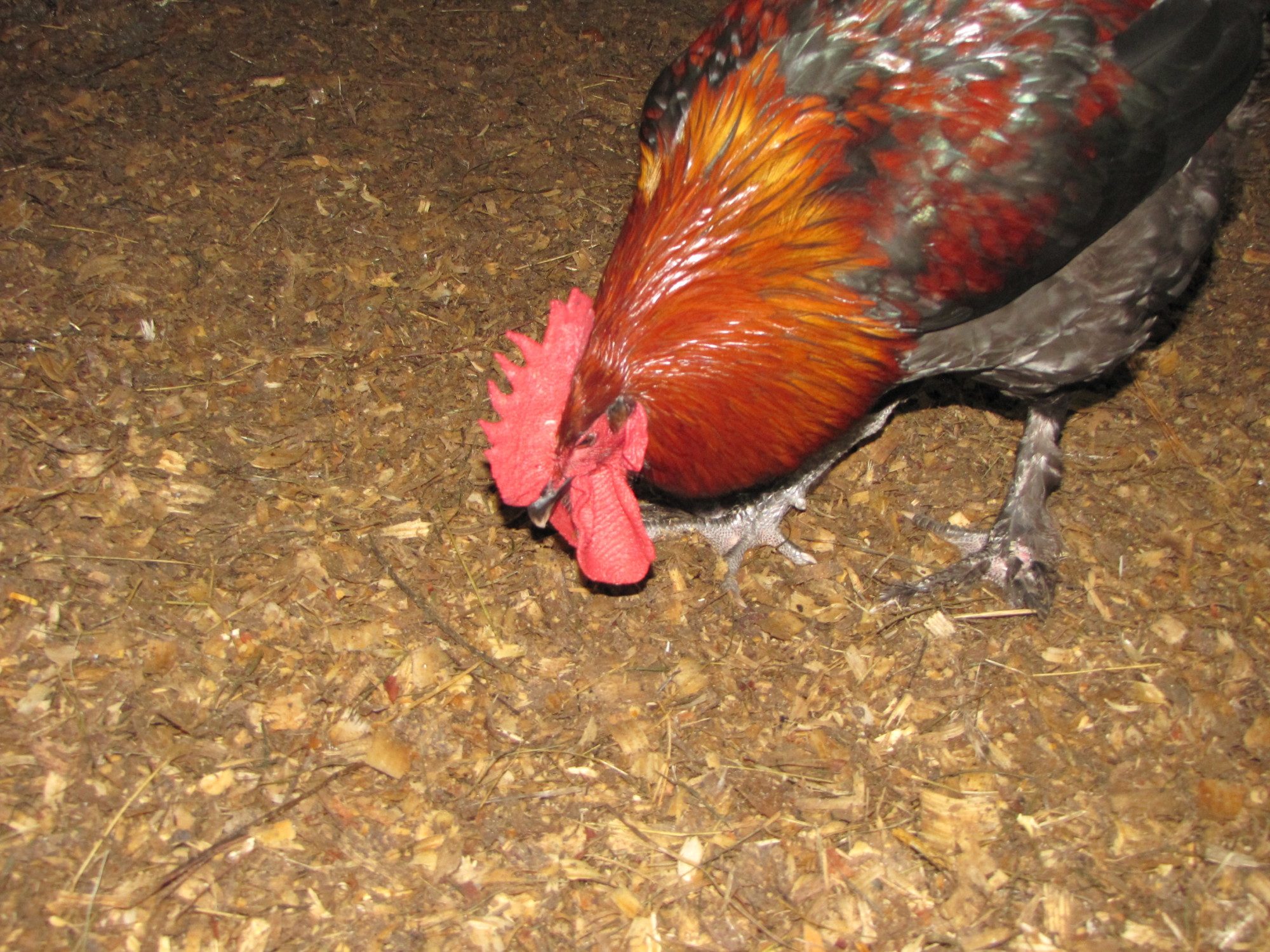 Good day to you all! I spent the morning sitting in chicken poop and behaving like the paparazzi. :sick He is a ham! This is the same boy that was posted on the other thread. I figured I will show and tell one at a time. I am embarrassed to say that they are all battling fowl pox we have had an awfully wet summer and mosquitoes the size of small dogs. I shot a bunch of pics in their pen which is under a big oak tree for shade which is why I had to use a flash. The photos without the flash are pretty grainy. I think I kept one. So without further ado meet 5 1/2 month old Henri again in all his glory. :fl