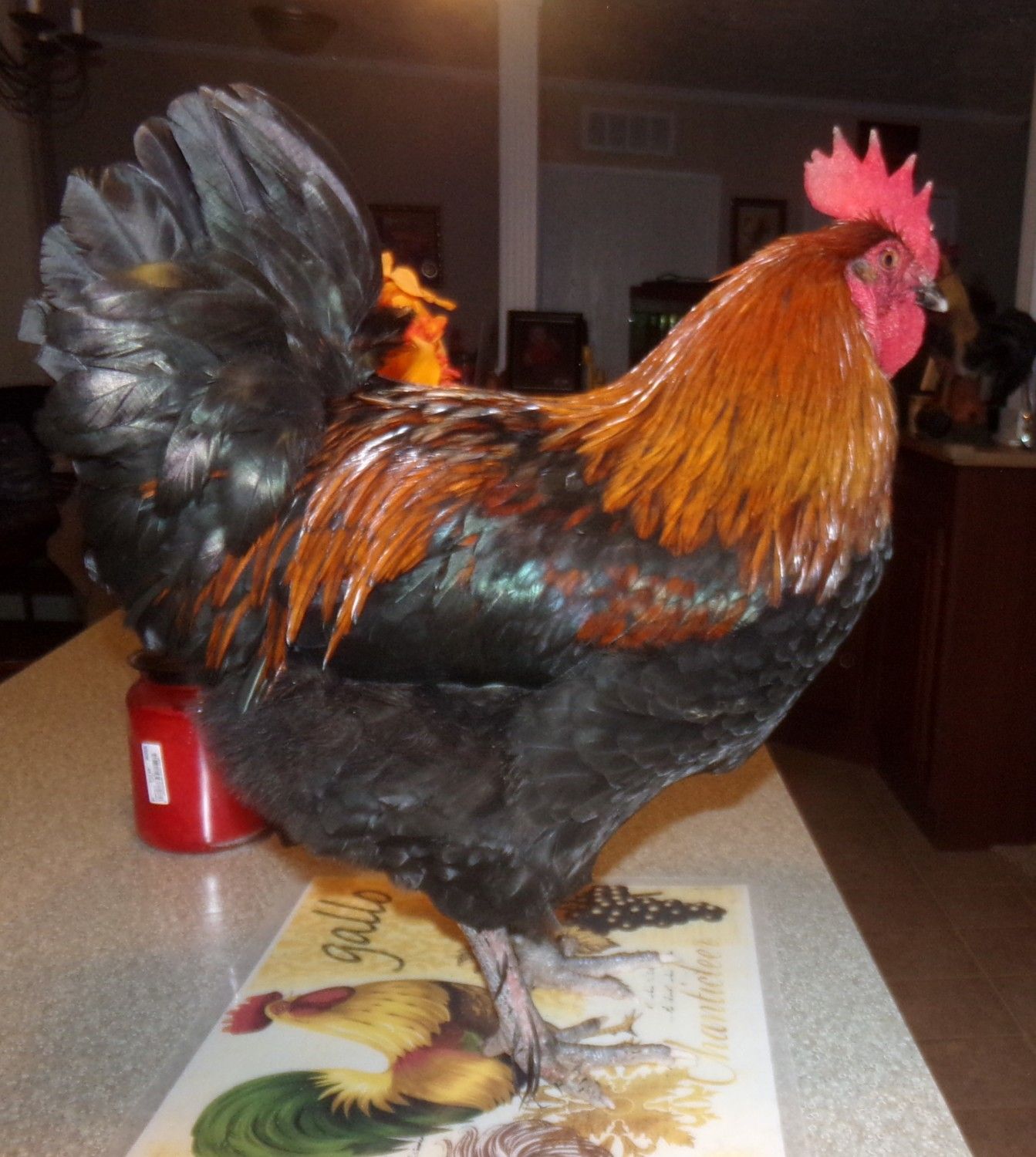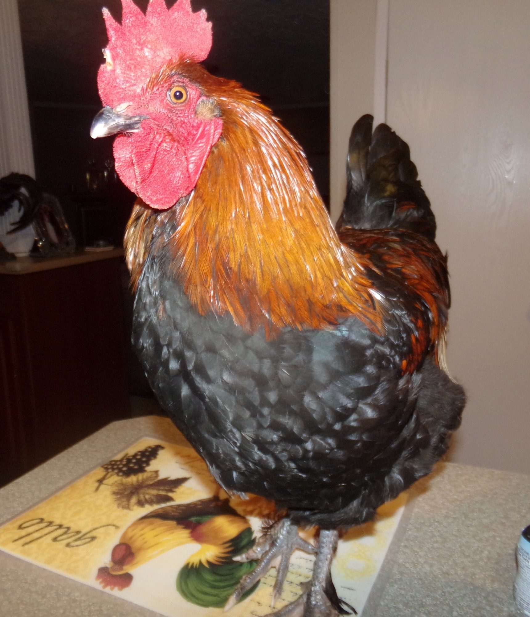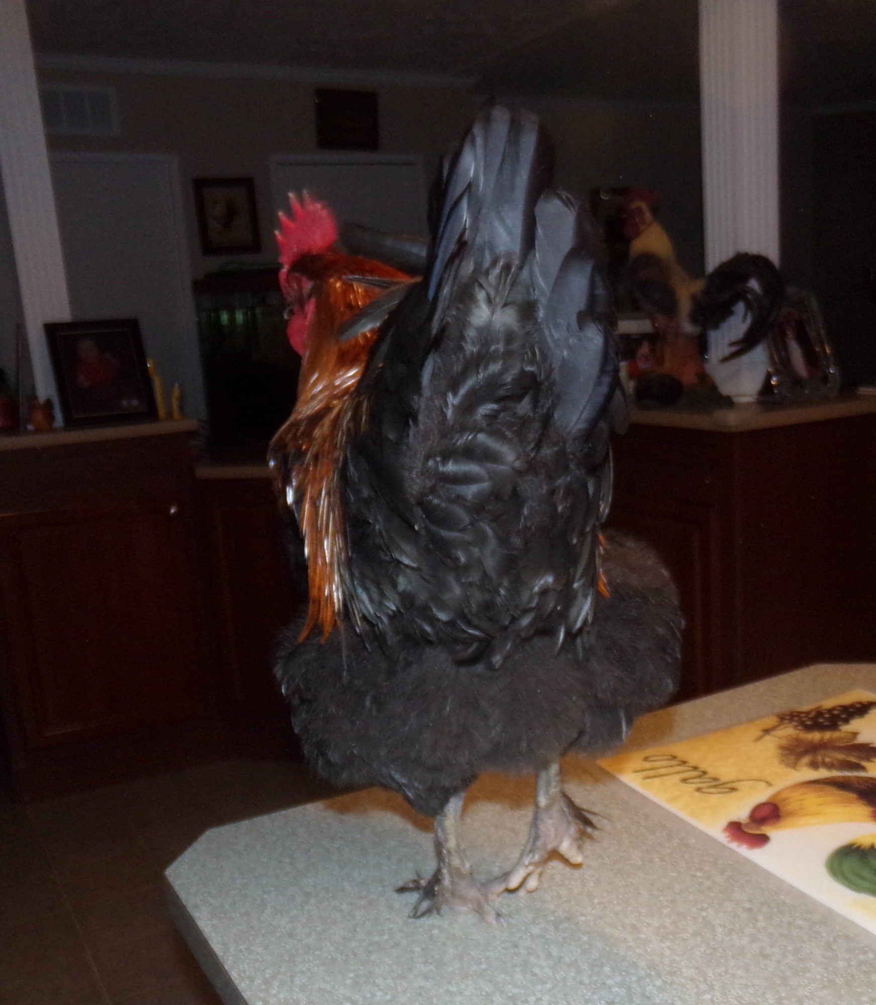 Went out and got Mud off the roost and brought him in for a photo shoot. He is the most well behaved rooster I have ever handled. Such a good boy. My son was feeding him bread and Mud walked around like it was the most natural thing in the world. I am very proud to call him mine. He was born mid June making him about 7 months old now. He has a little nick to the front of his comb that looks like he bumped it on something and took a tiny chunk off. Or maybe my grumpy oldest splash hen gave him a run for his money. I call her Big Broody Judy. lol