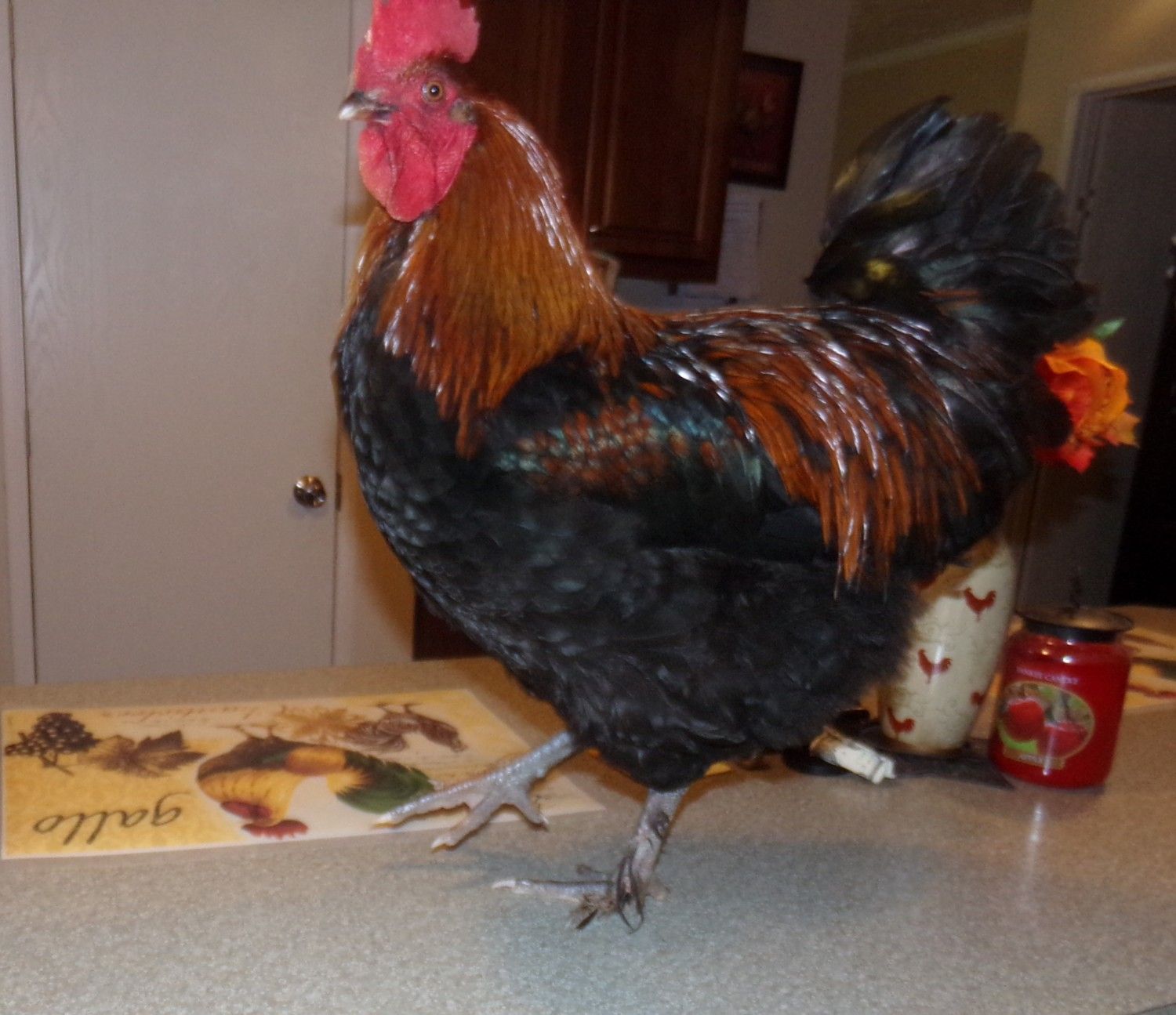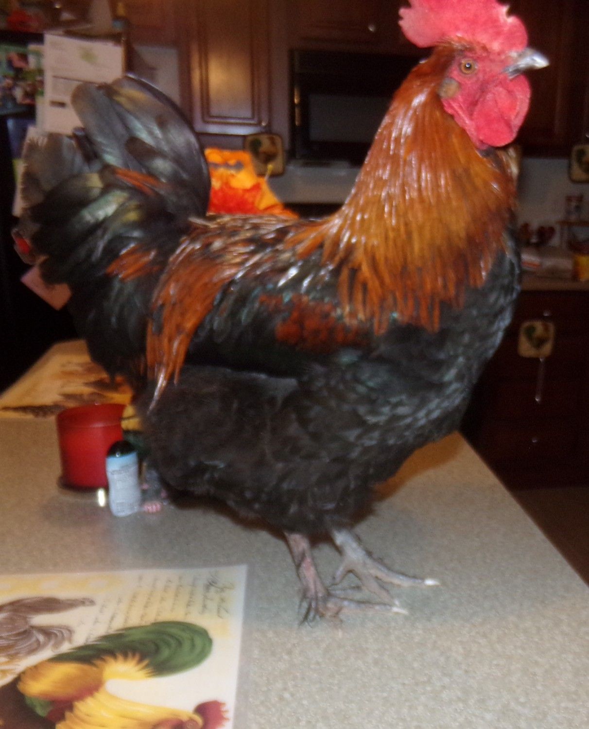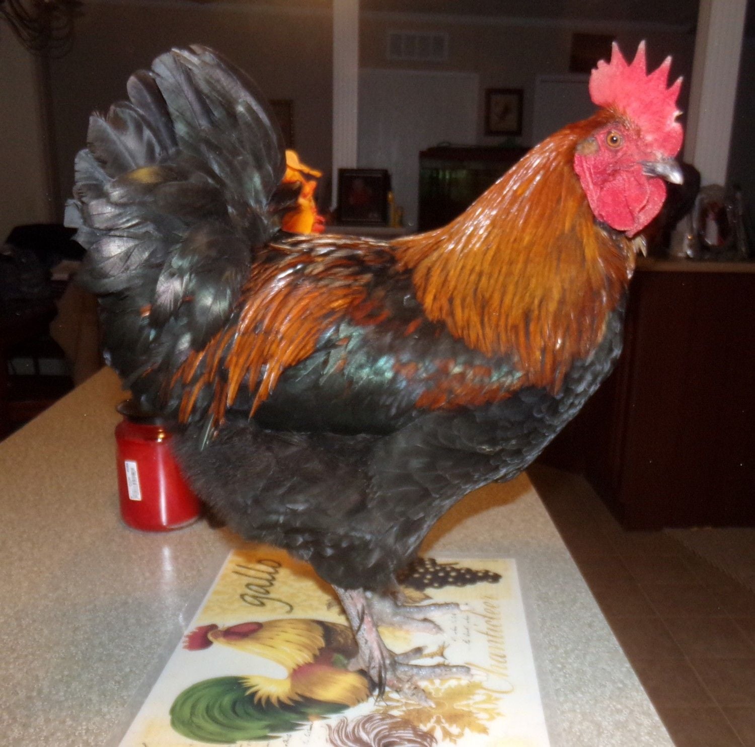 Went out and got Mud off the roost and brought him in for a photo shoot. He is the most well behaved rooster I have ever handled. Such a good boy. My son was feeding him bread and Mud walked around like it was the most natural thing in the world. I am very proud to call him mine. He was born mid June making him about 7 months old now. He has a little nick to the front of his comb that looks like he bumped it on something and took a tiny chunk off. Or maybe my grumpy oldest splash hen gave him a run for his money. I call her Big Broody Judy. lol