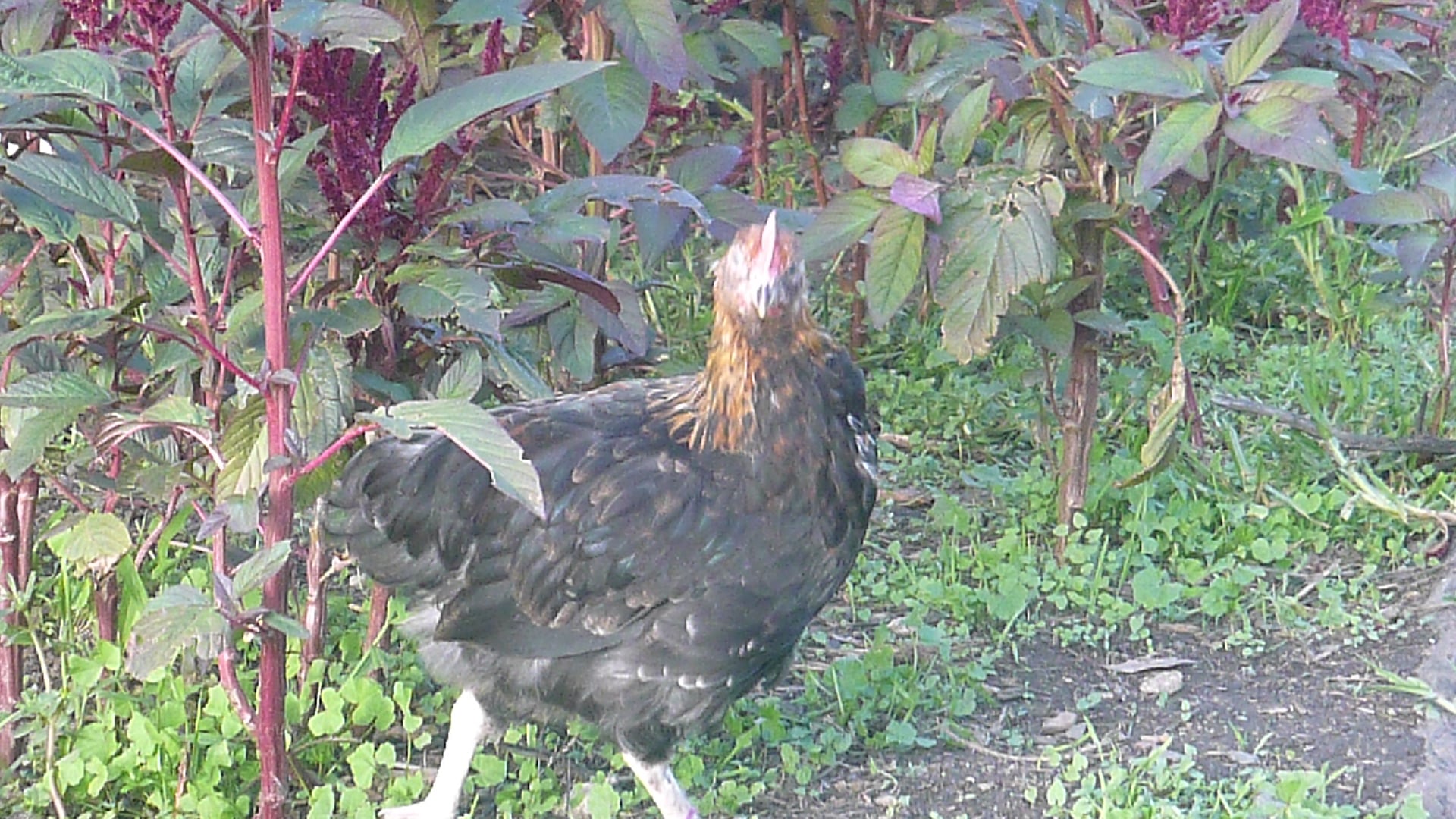 Golden Salmon cockerel 8 weeks old . this guy goes every where , he blend well with a vegetation in the back ground . wild type. son of Massoud over Missu.