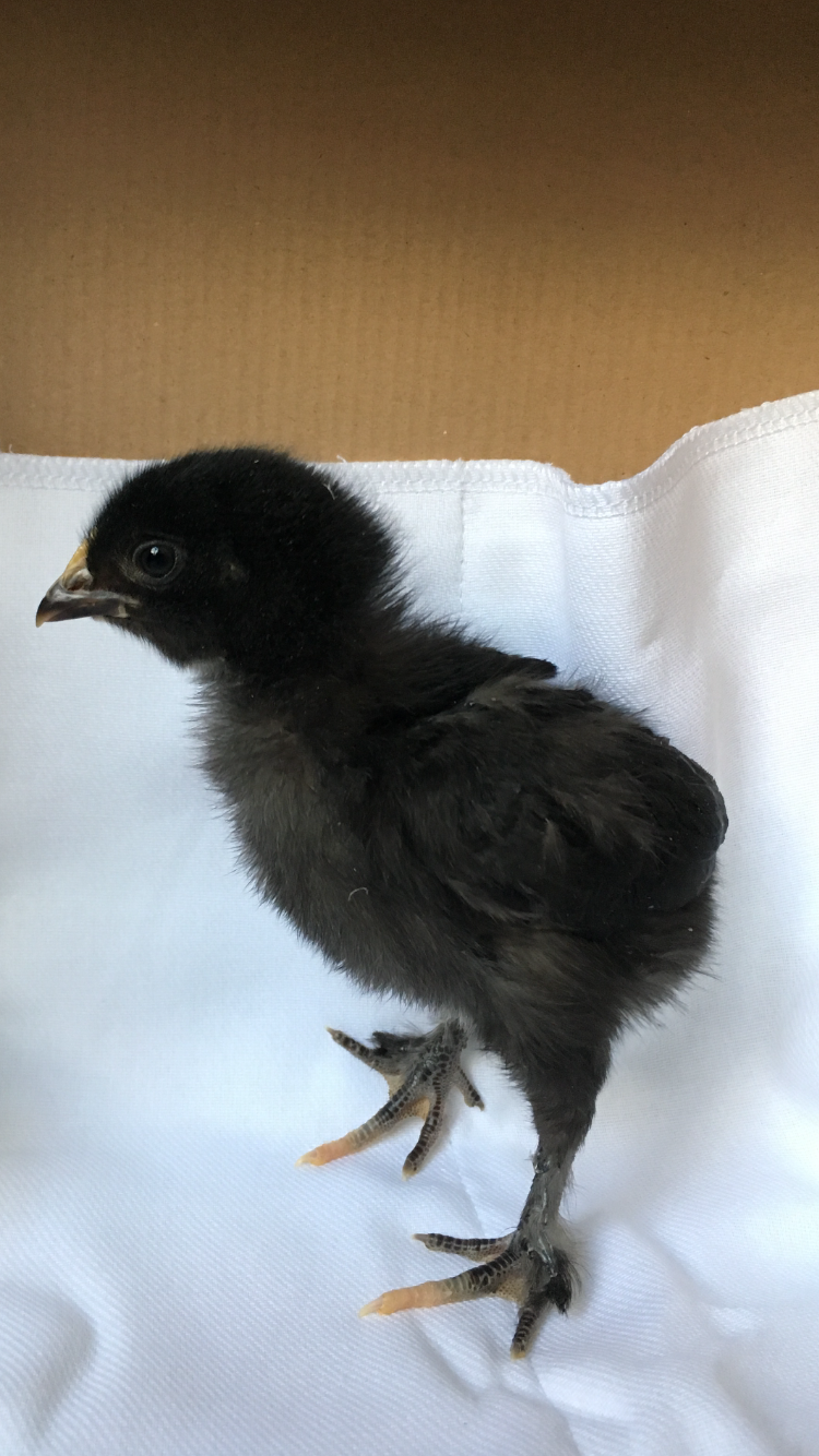 This is my FBCM chick. I only have one and I'm hoping for a pullet. She is 4 1/2 weeks old. She was a mostly black chick with a small bit of white under her belly. She is starting to get a few copper feathers around her neck. I'll post an older pic first then the picture from this morning. She supposedly come from Little Pedler line. I got her as a pet so really didn't even know what that meant. I think I now see one white feather.