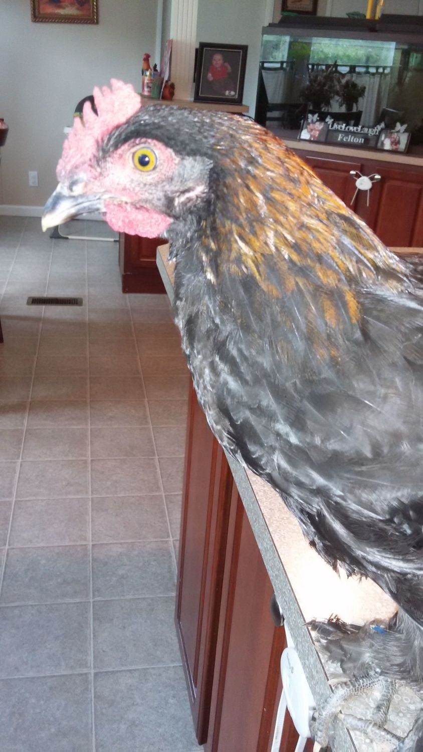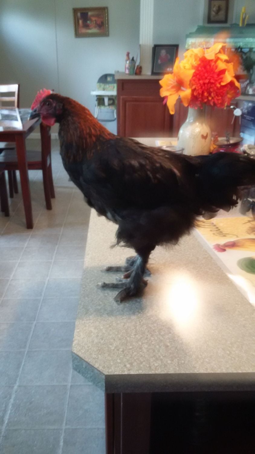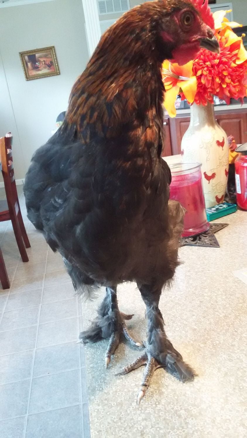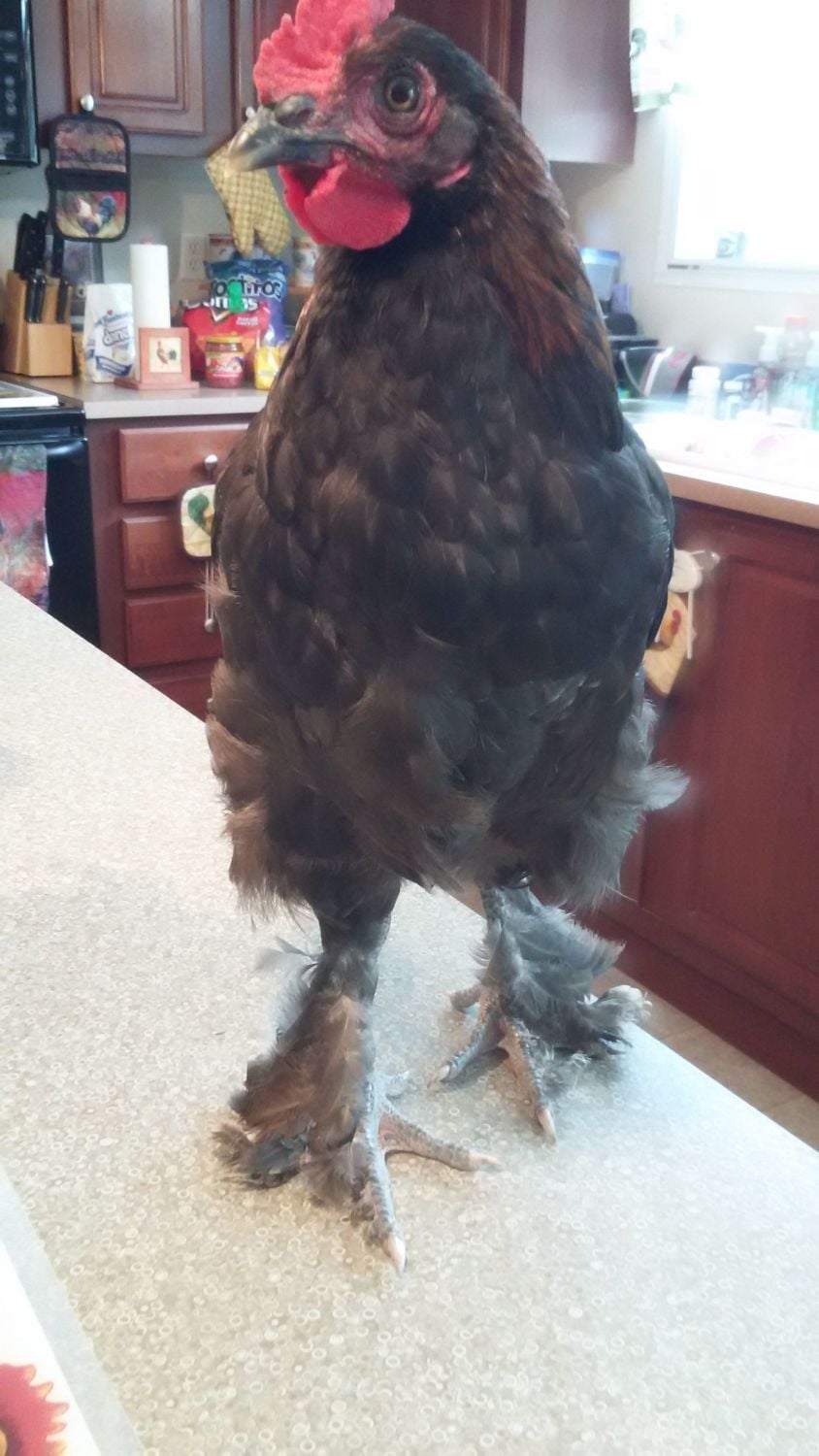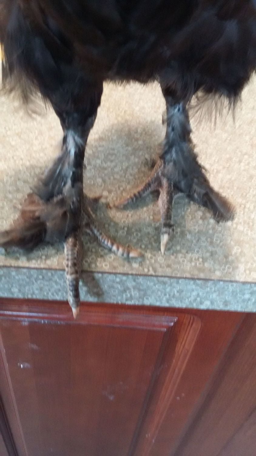 1st roo: hatched from #5 colored egg, has some middle toe feathering. And yes he is on my counter. Had to bring him in to put a bigger zip tie on him.![]()