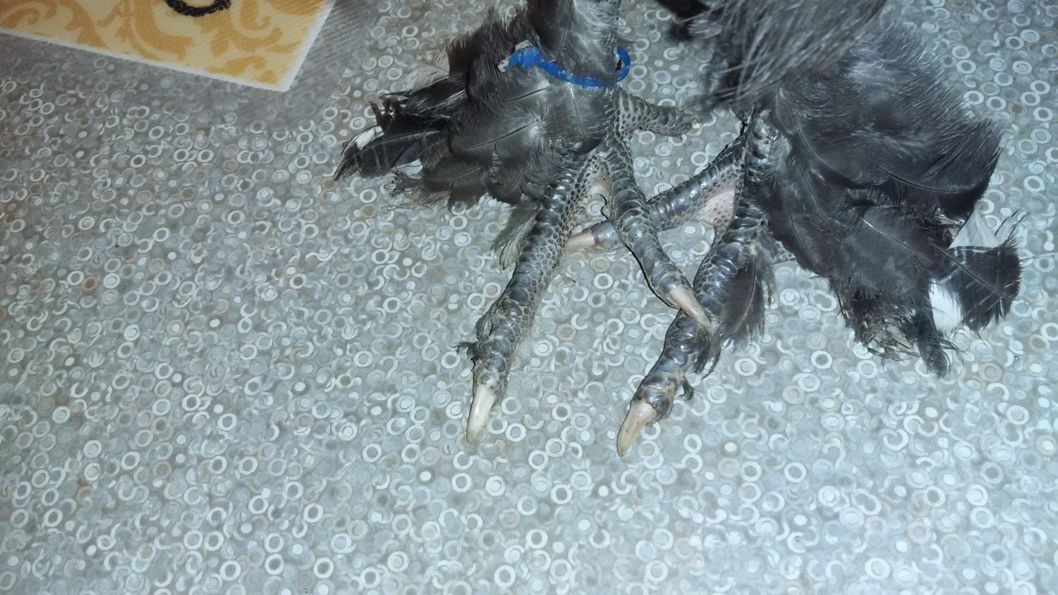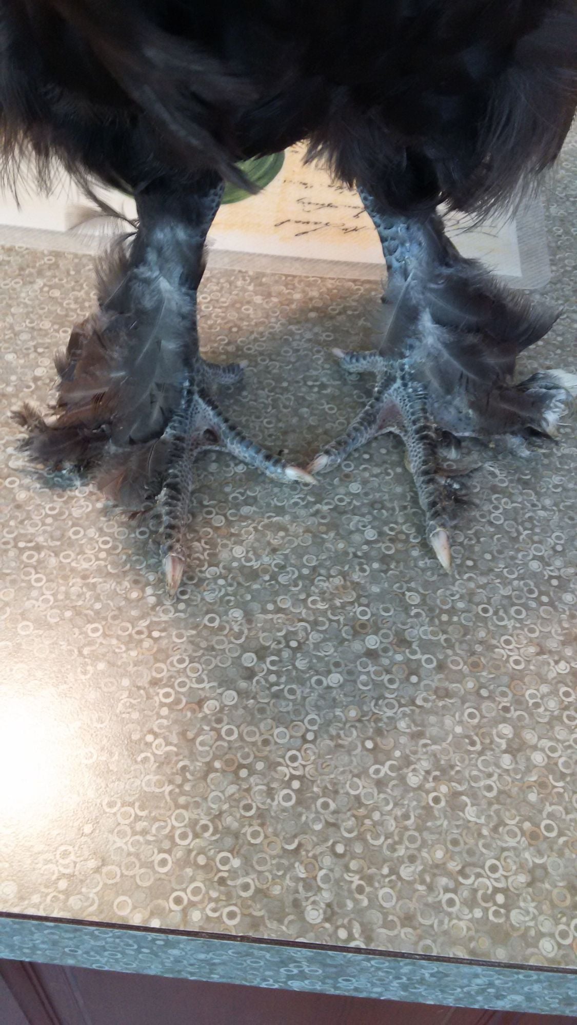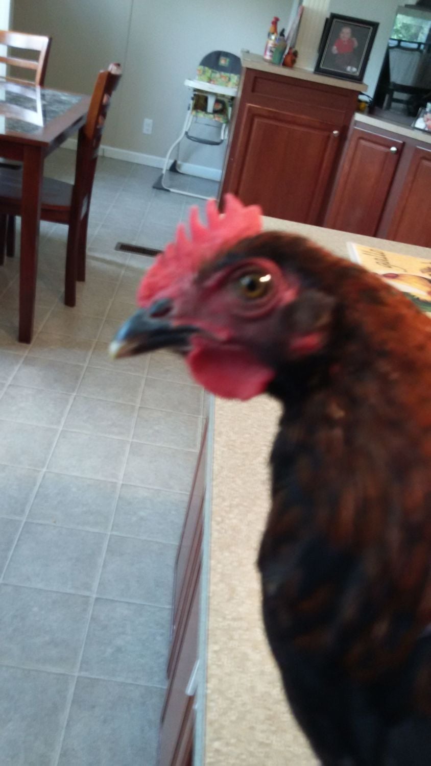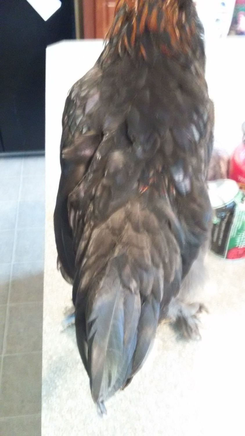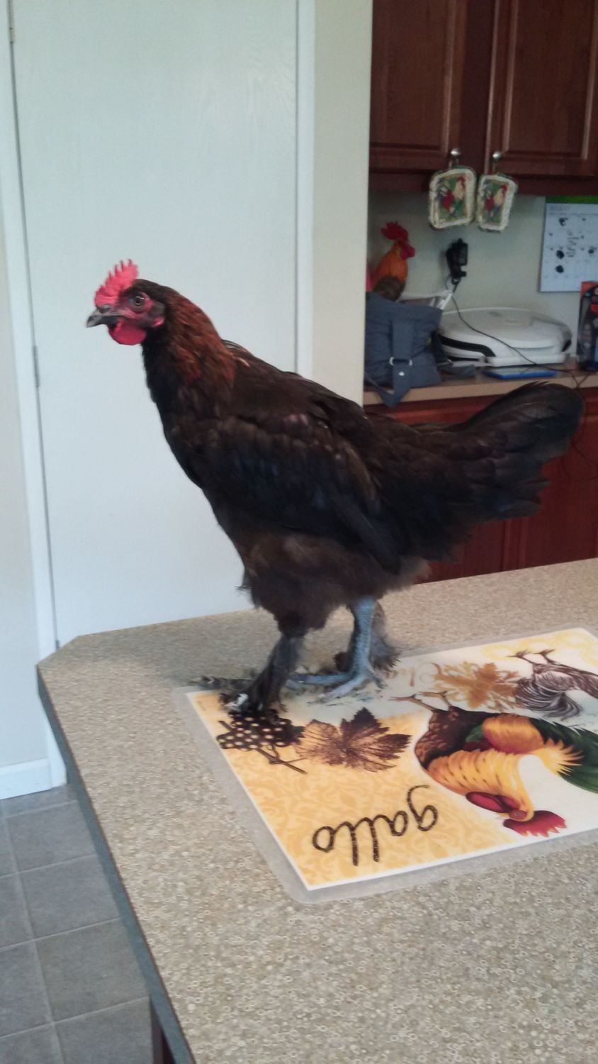 1st roo: hatched from #5 colored egg, has some middle toe feathering. And yes he is on my counter. Had to bring him in to put a bigger zip tie on him.![]()