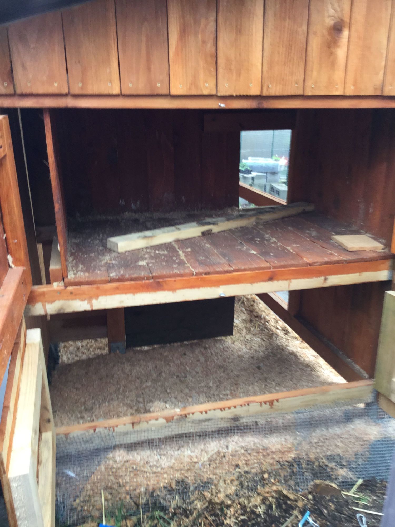 Here's a close-up of the side with the duck house (on bottom) and chicken house (on top, no nest boxes or roosts added yet):