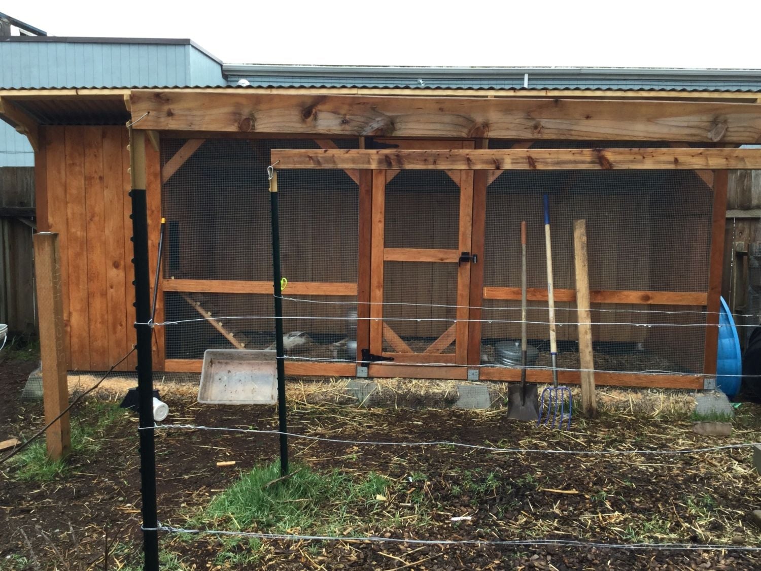 Below are photos of the whole set-up. Right now, the ducks get let out a couple times a week to play in a kiddy pool (under supervision). We used to keep a tub of water in the run for them, but it just made the run too wet, so now they only get free access to their waterer. If the run winds up being too small, I can build a little additional run onto it, but would prefer not to. Since we live in urban Seattle, there is a huge population of rats and raccoons and, surprisingly, local bald eagles (who eat neighborhood free-range chickens). The entire coop and run right now are completely rat- and raccoon-proof.