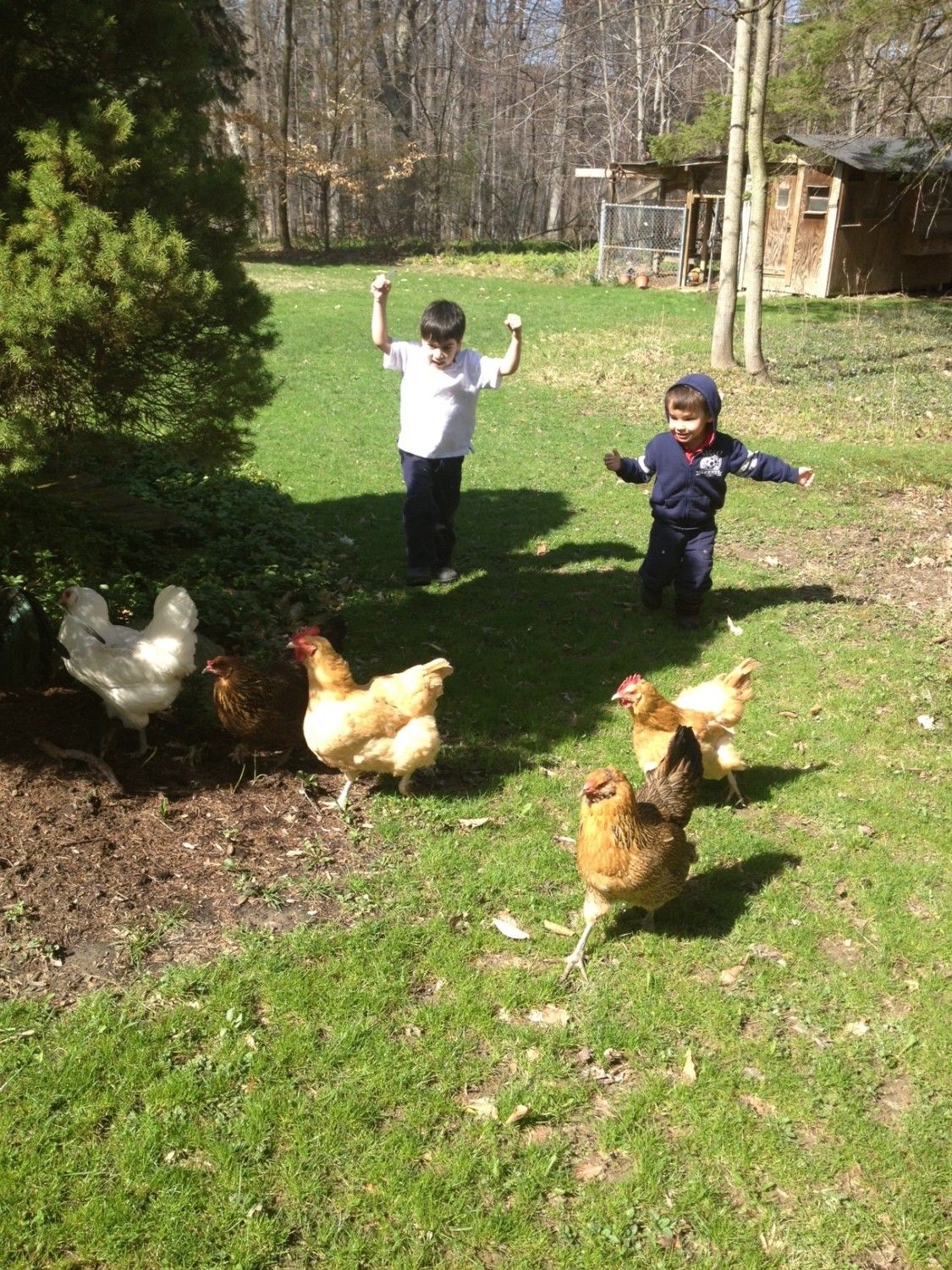 These are my original hens, 2 Buff Orpingtons, Americanas and roo (ran away before pic), with my sons playing!
