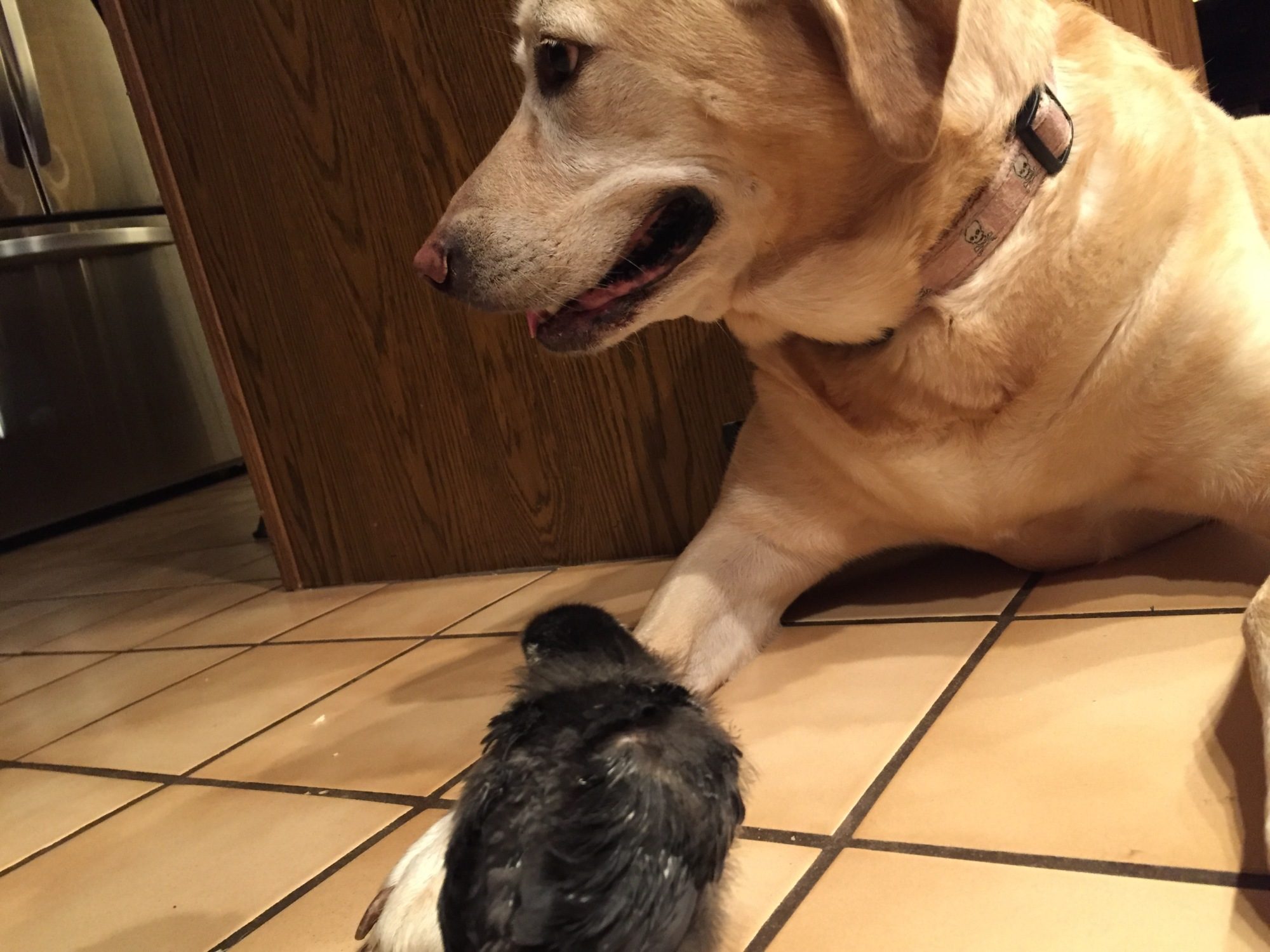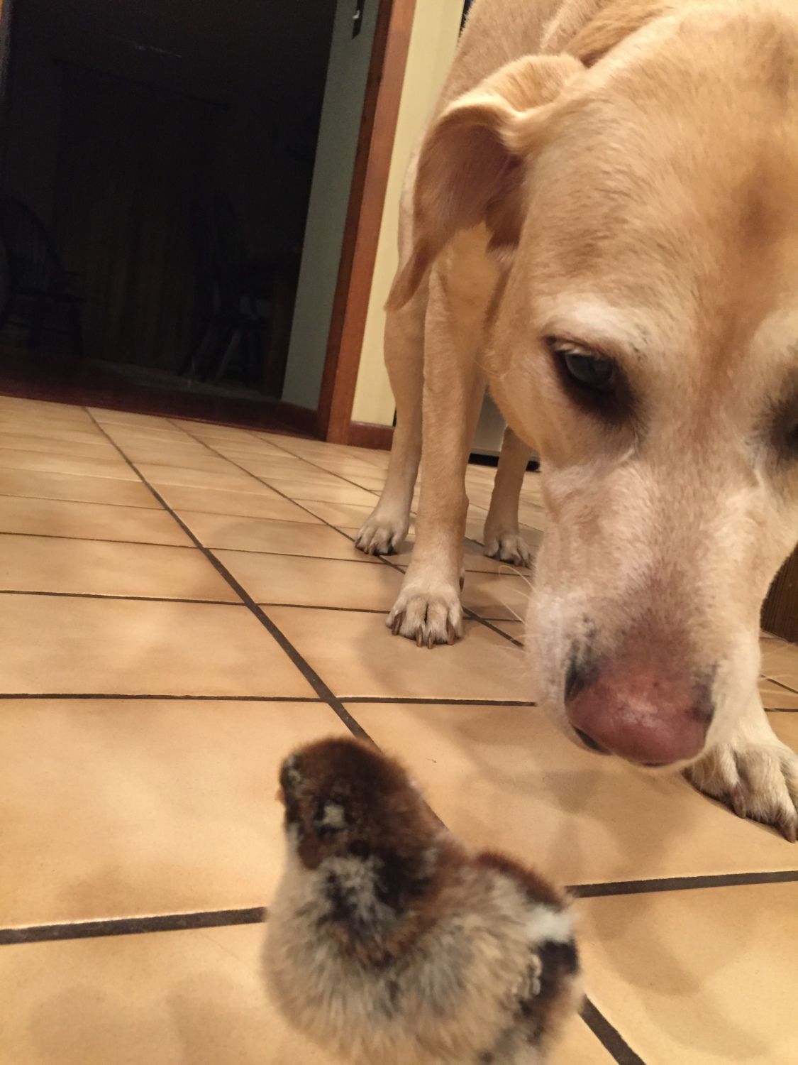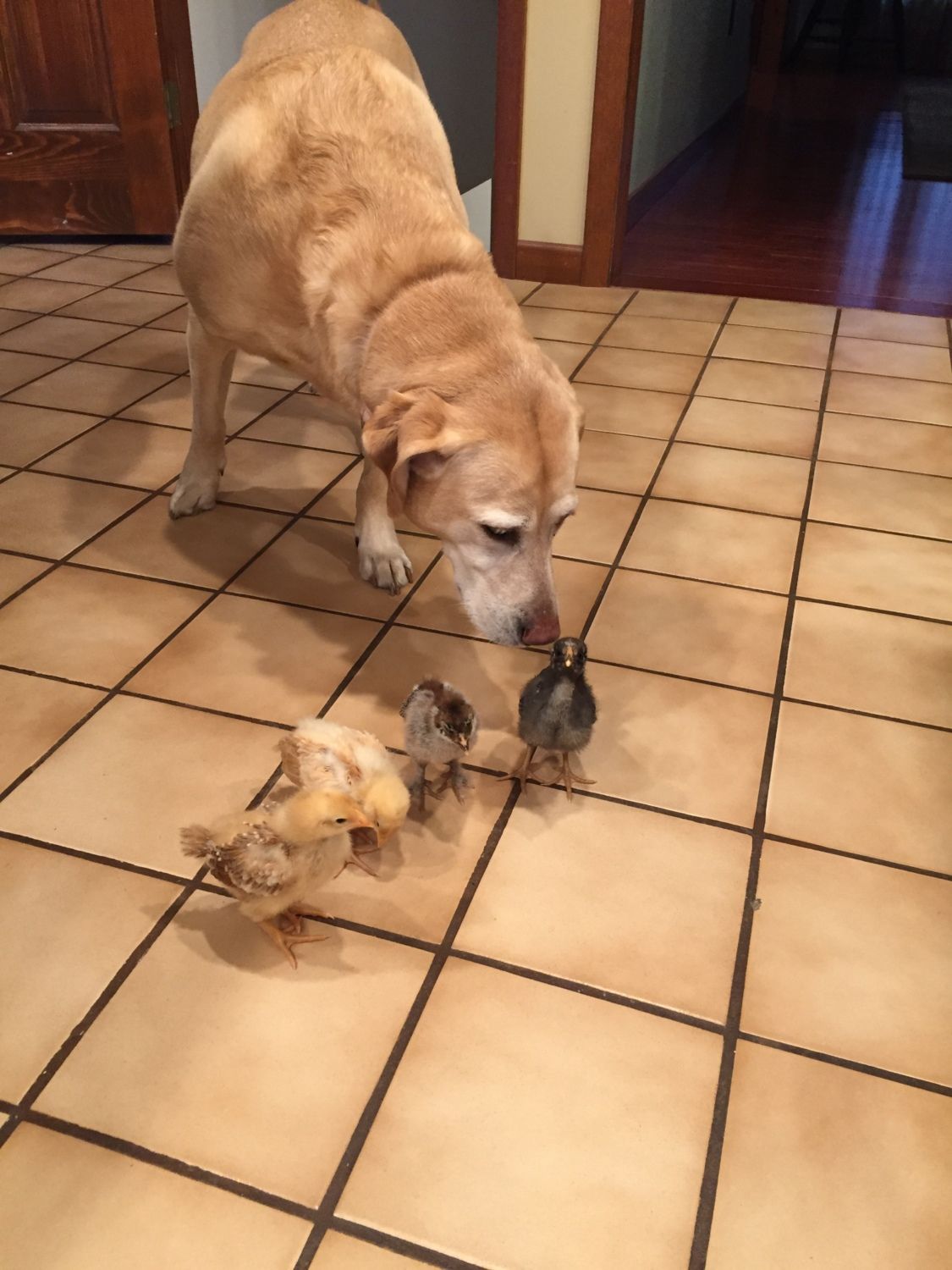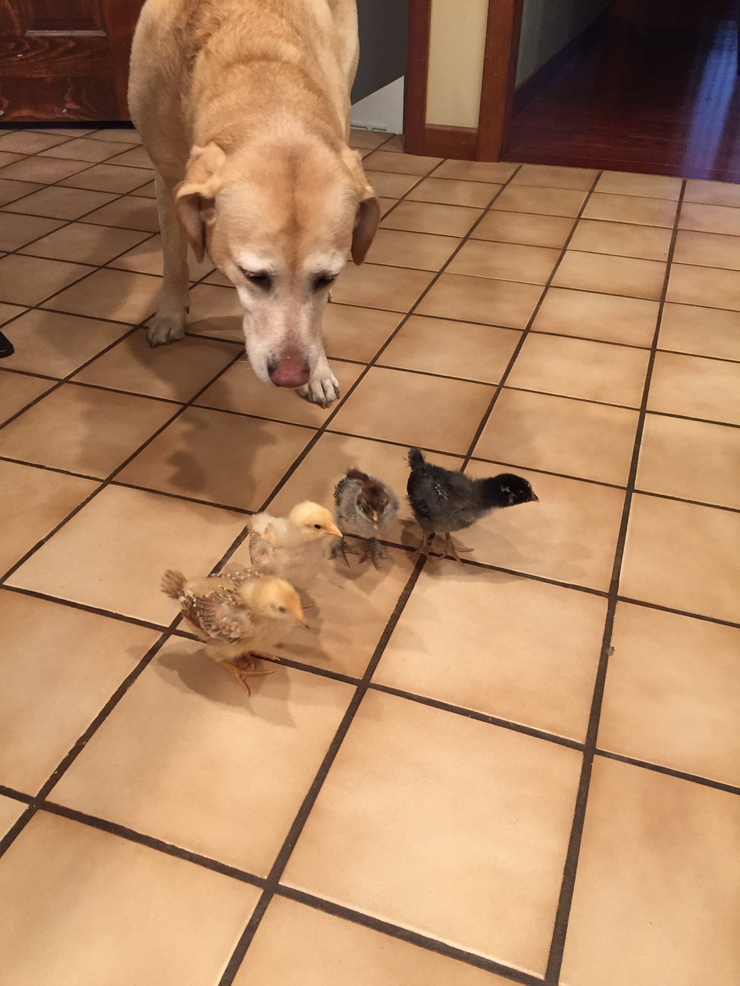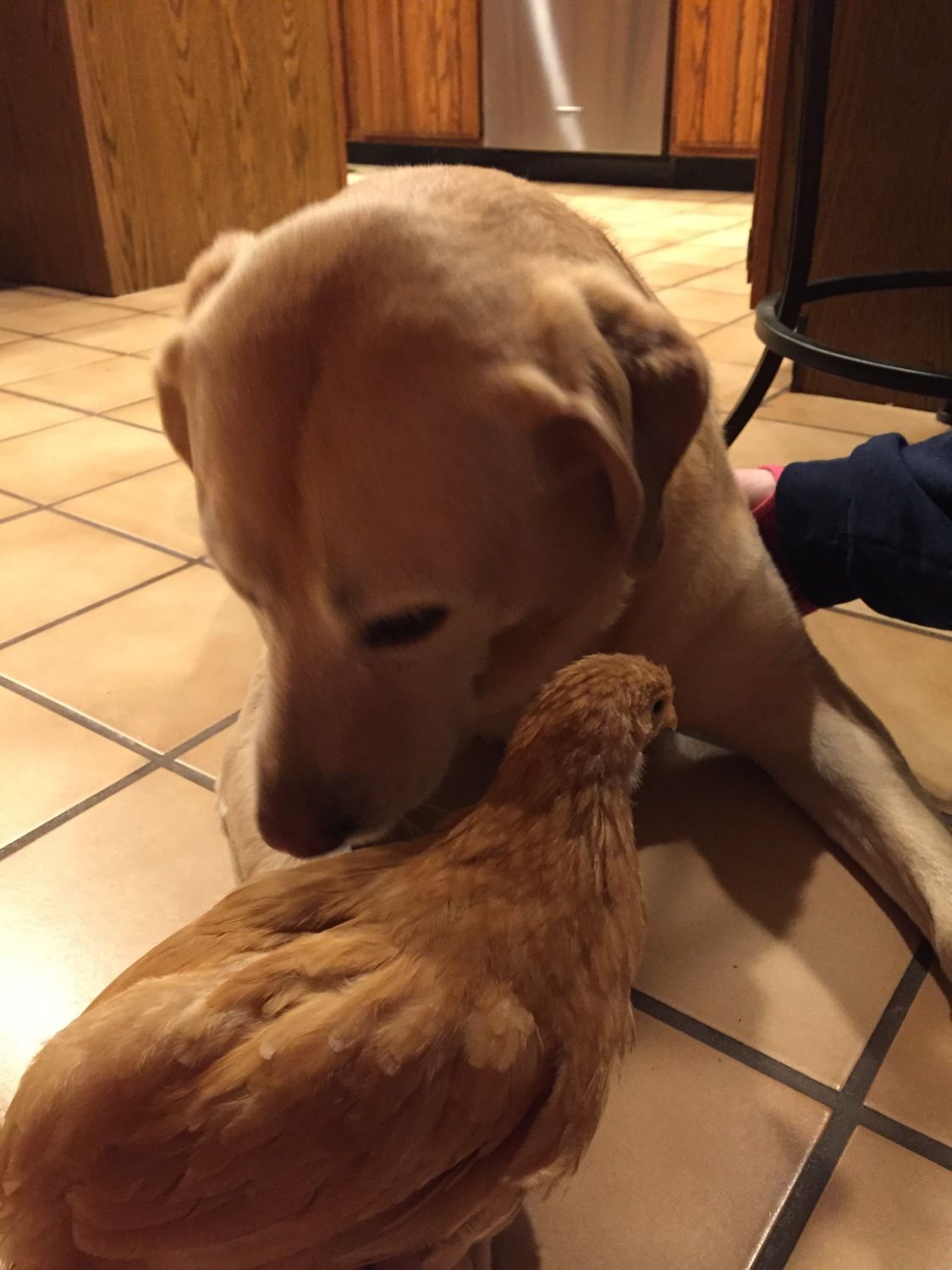 We have a seven year old lab that still thinks she's a puppy. One of our large concerns was how she would be around the chickens...the last thing we wanted was for her to think they were a new toy and start chewing on them!