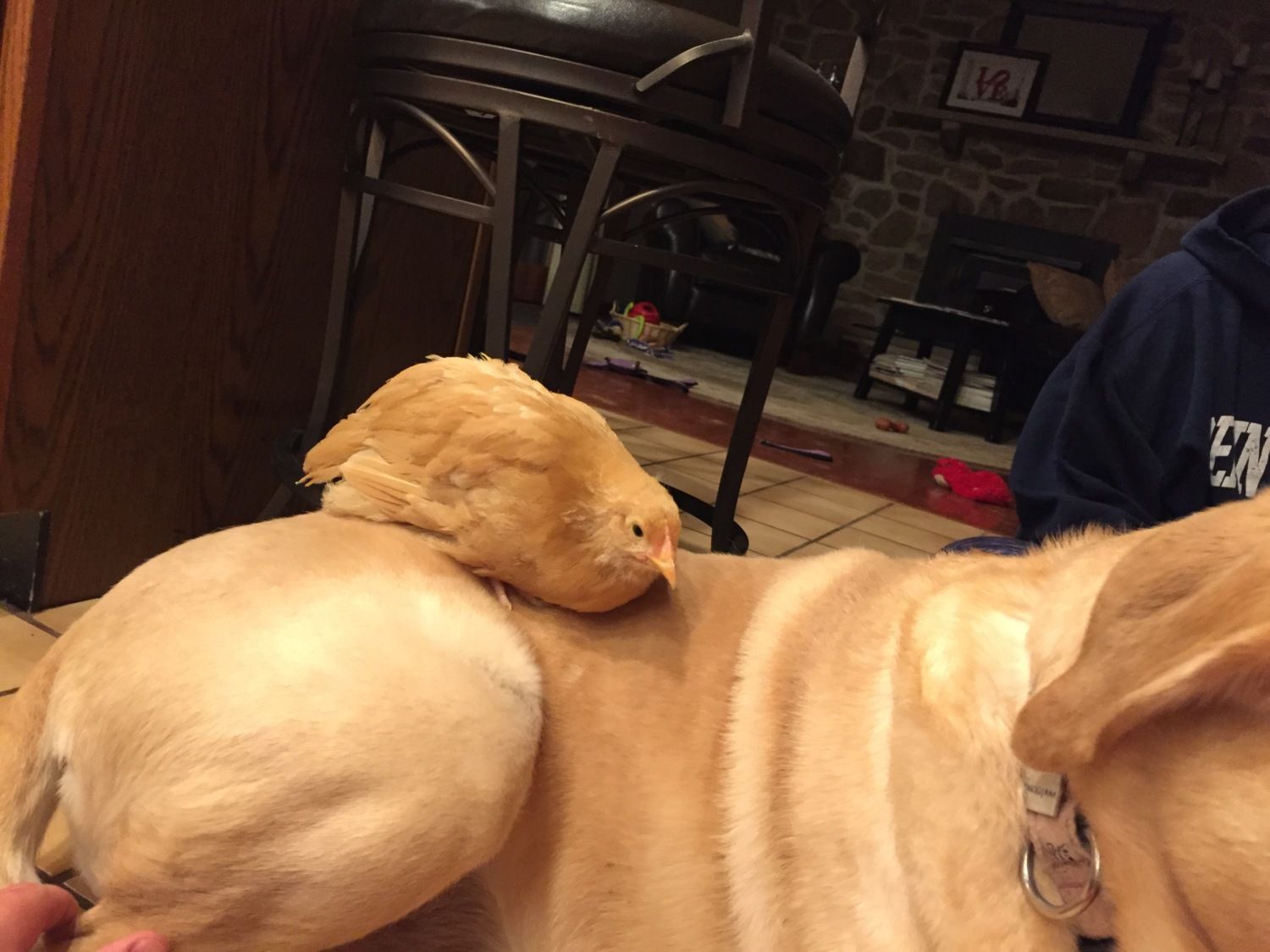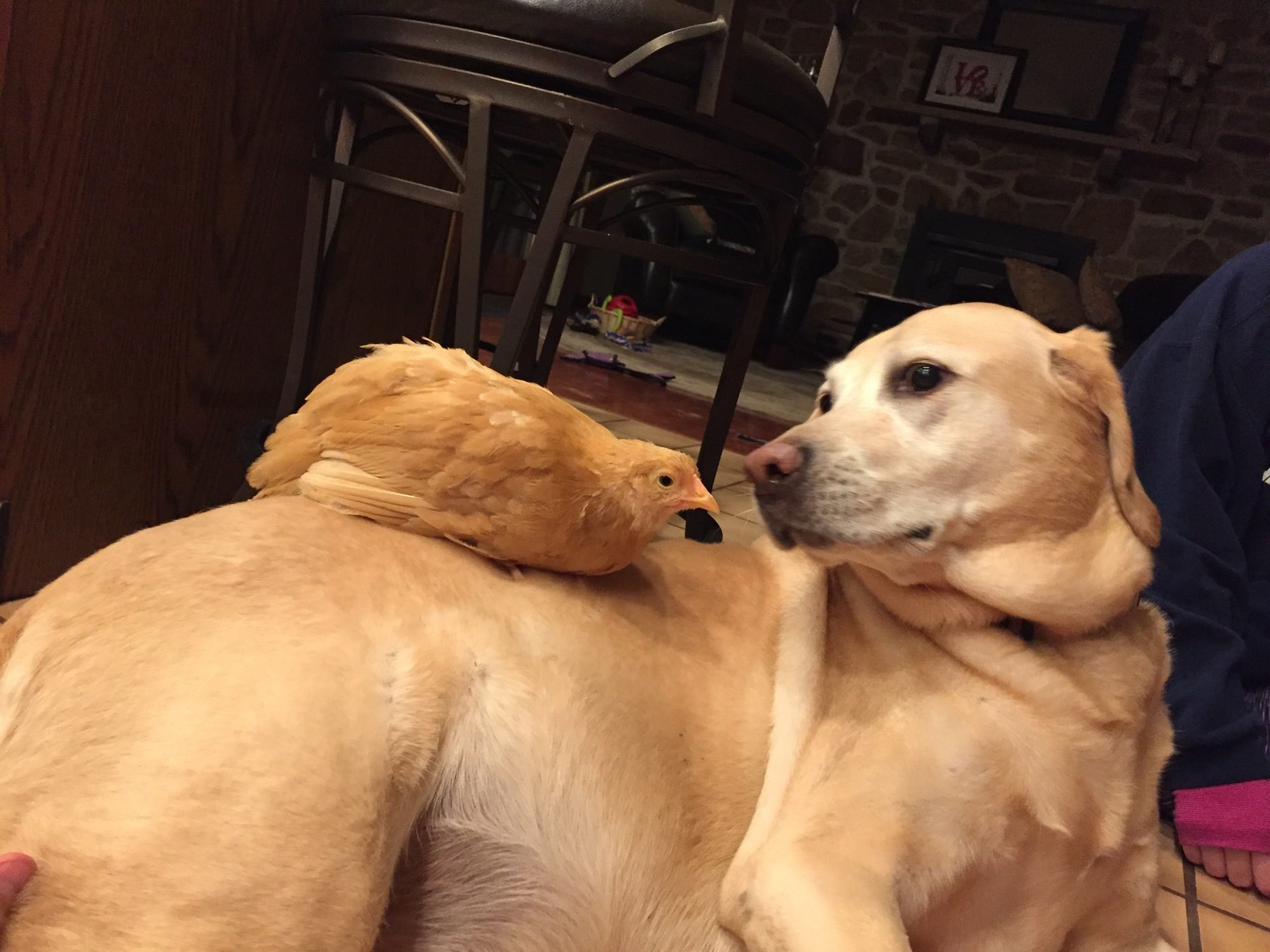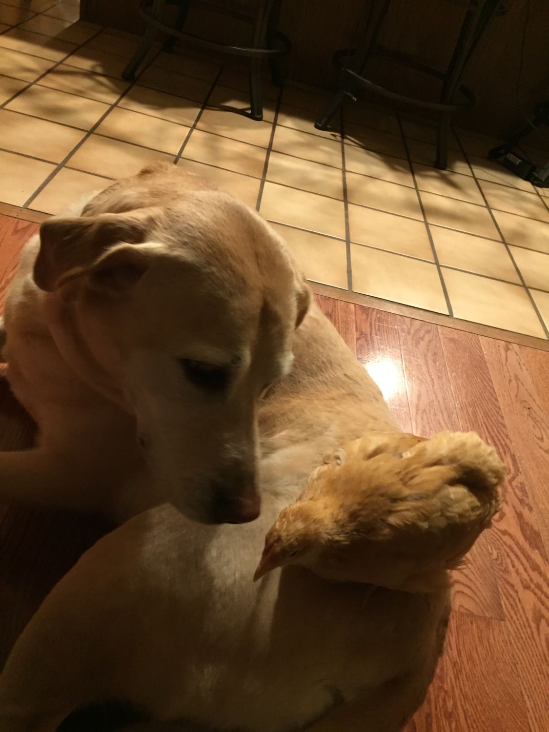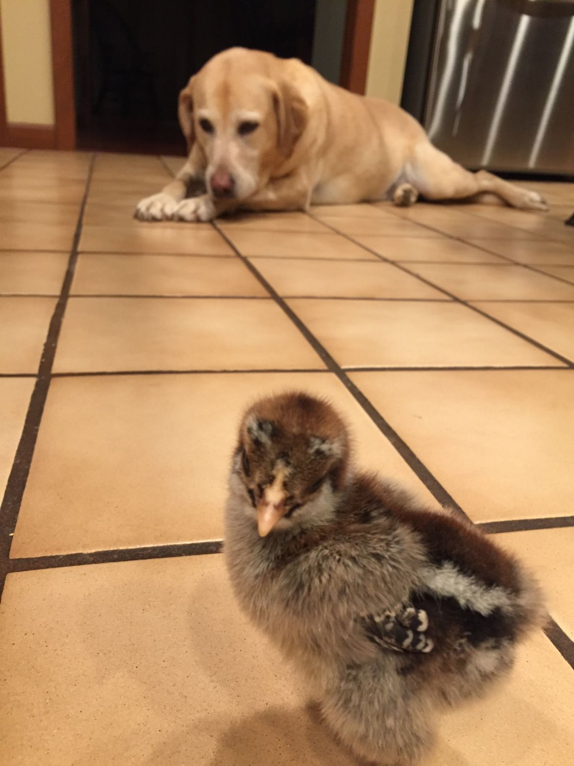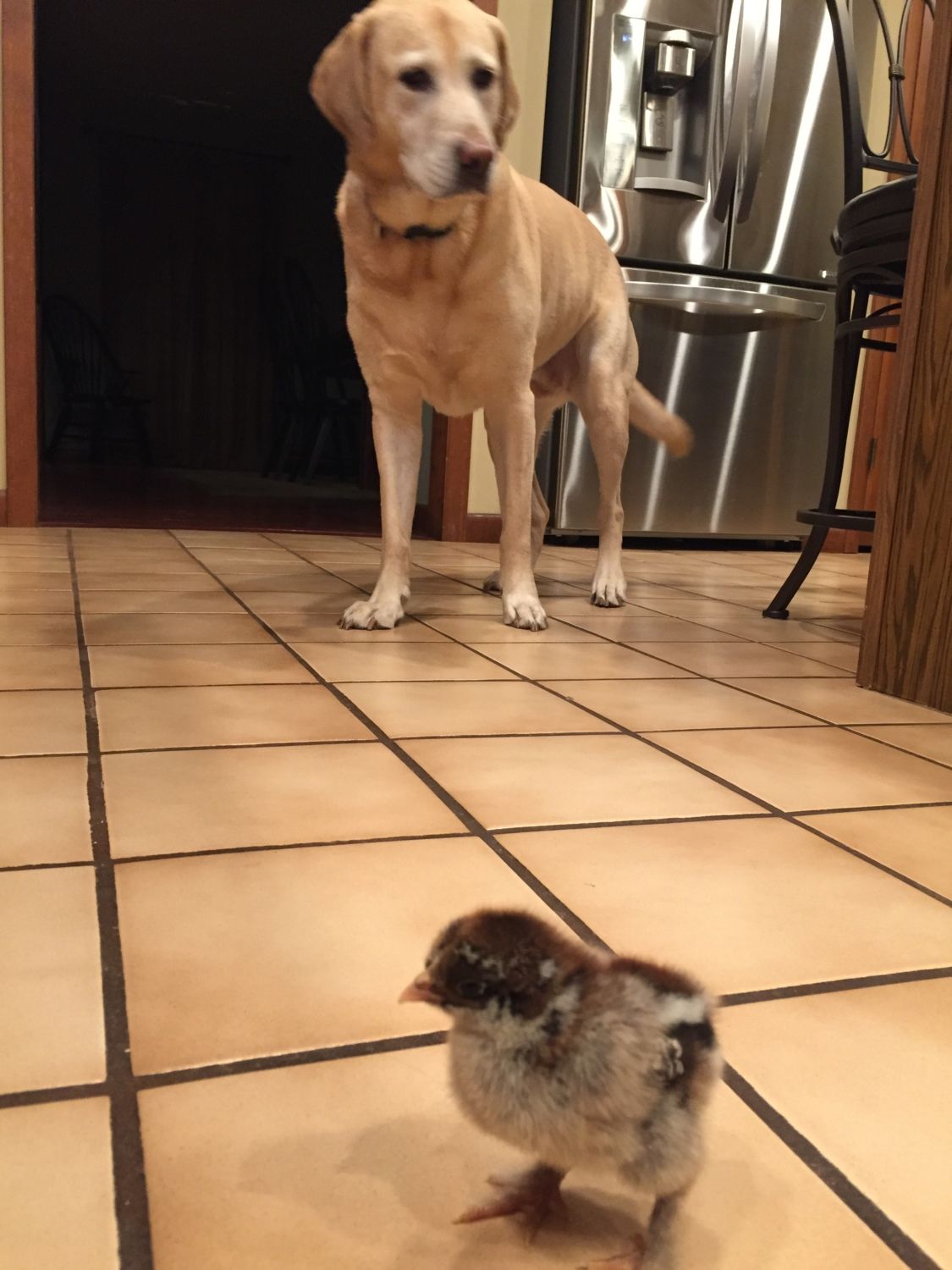 We have a seven year old lab that still thinks she's a puppy. One of our large concerns was how she would be around the chickens...the last thing we wanted was for her to think they were a new toy and start chewing on them!