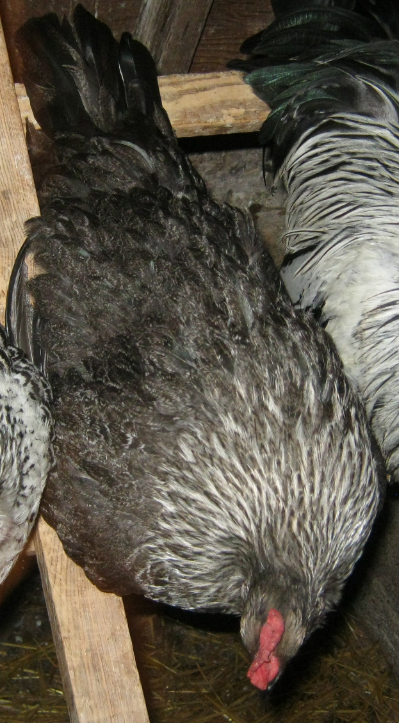 This isn't the best pic, and there is a "redness" to the pic due to the picture being taken after dark. My appologies. The male has been busy as well so her feathers are a bit rough....... for the most part this hen looks like a darker colored Silver Iowa. Her head has a beautiful metalic silver color instead of a bright crisp white as the Standard calls for. This is normal and to be expected when we try to create the Standard Silver coloration over the Er e-locus base.