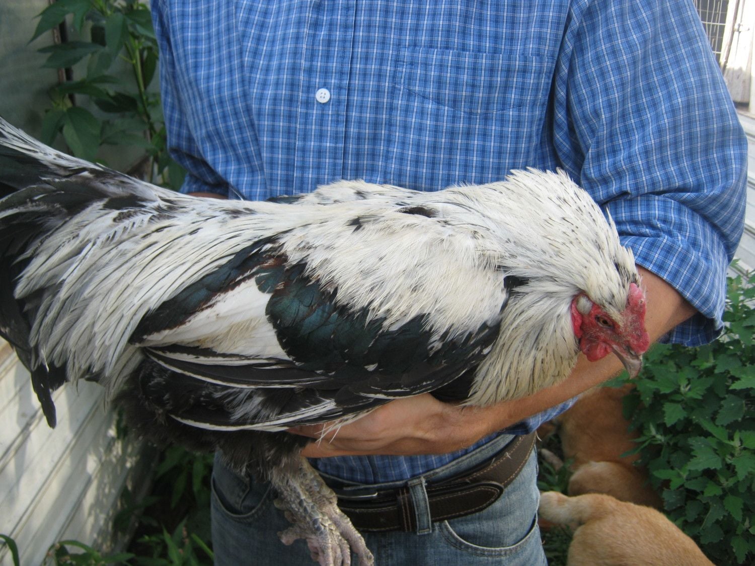 Here's an interesting picture. I was out to Glenn's place about three weeks ago to take some chicks to him. As a group of breeders, we're moving in the right direction. I had only 11 for him but he said they were the best group of chicks he'd seen in decades and that in the last 20 years he hadn't produced a group of chicks as nice as they were. That's encouraging! While I was there I asked him to take out his "best" Iowa. What I wanted was not necessarily the best colored individual, but the best bodied individual. He proceeded to pull out this very old male. Glenn was thinking he's about 10 years old or more. What was most interesting to me was that while this male had some weight to him, he wasn't particularly tall like we've been seeing in our males today. He was short and very stocky. Glenn mentioned that he remembered the original birds being short and stocky, but heavy. He felt his current flock is too "rangy" compared to what they used to look like. Thought I'd share his thoughts and this pic. Not the best pic of the male, but you'll get the idea. Color isn't quite right, you'll see that when you look at him. But he does seem to possess an attitude of "been there done that"...........maybe his age has something to do with it. I'm planning on taking a hen to Glenn's to put with this male and see if we can get anything out of him. Don't know if he's fertile anymore or not....slim chance, but just maybe......
