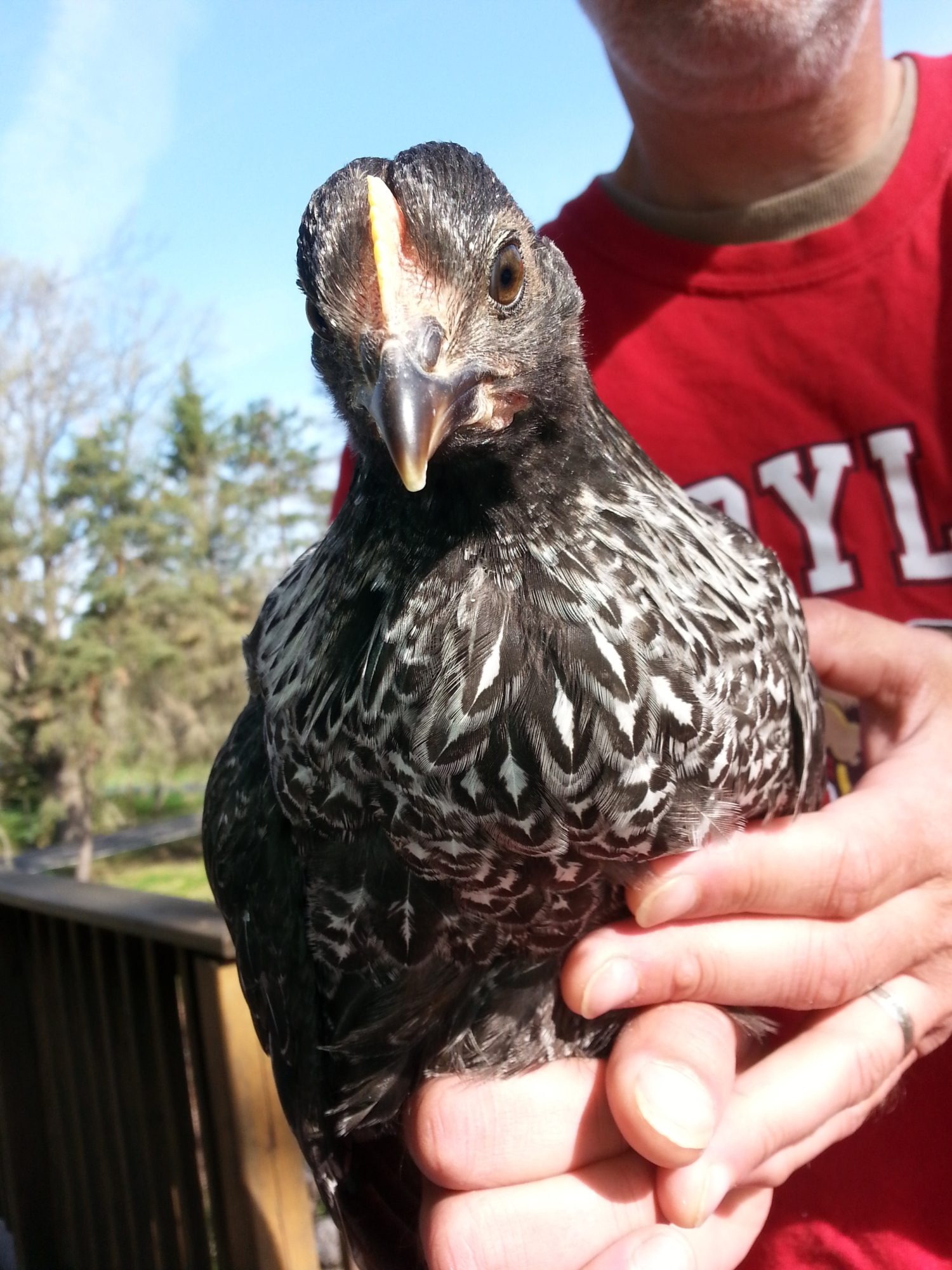 Thanks Connie :) We are real excited to see how she finishes with her feathering. But we want to do a photo journal of her especially because she was born a very dark brown/almost black chick. We got some interesting patterns out of the four I have. All of them are a nice size and that's what we are going to focus on with the first few generations while choosing the best color of the largest birds. Rollo, the smokey, is really big at 8 weeks already!