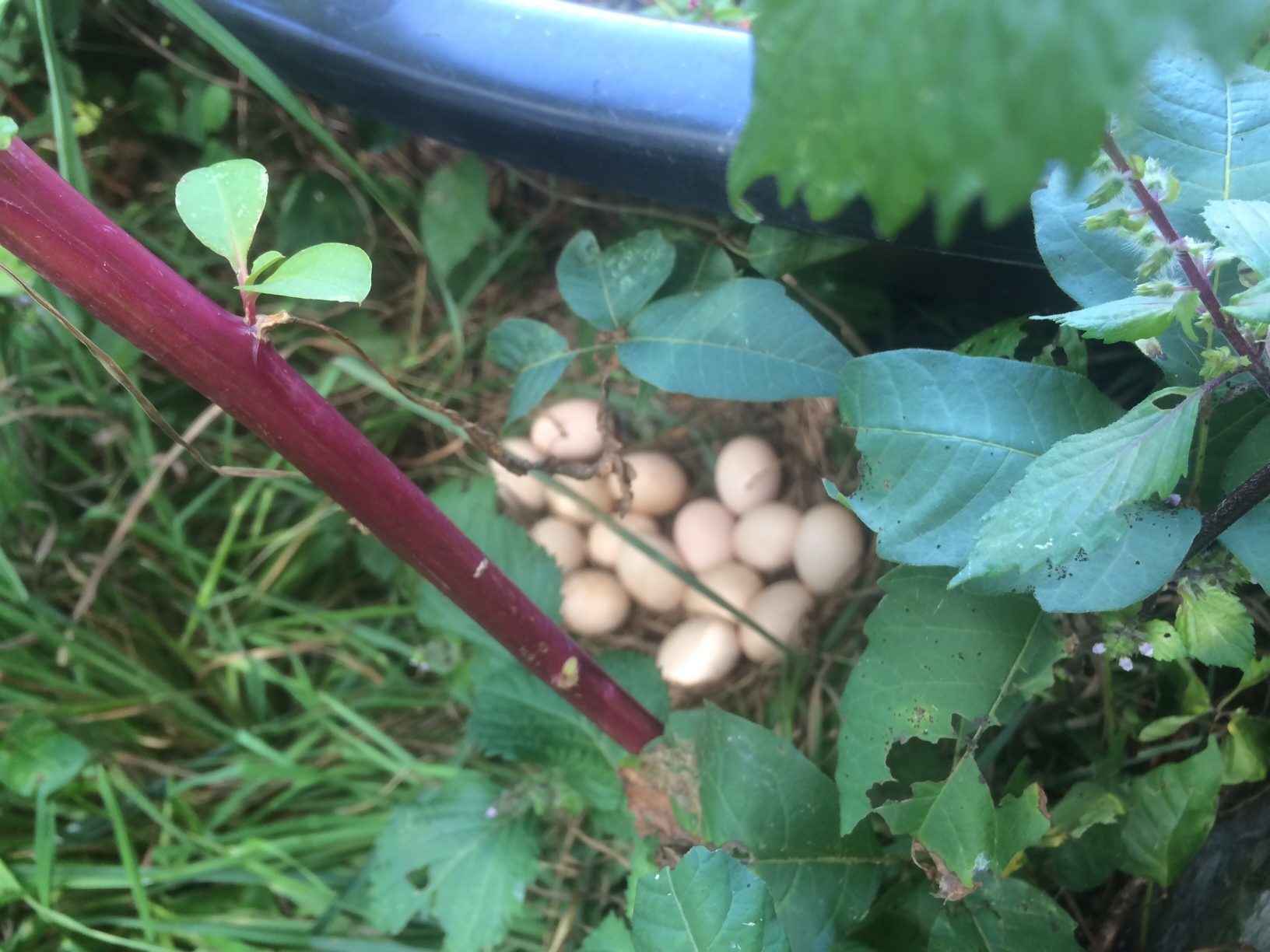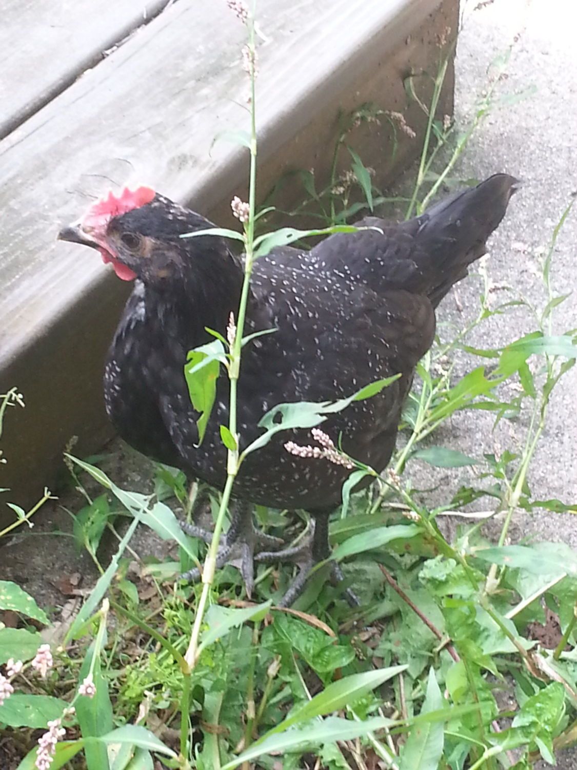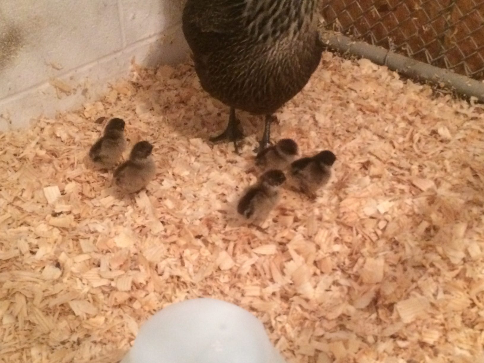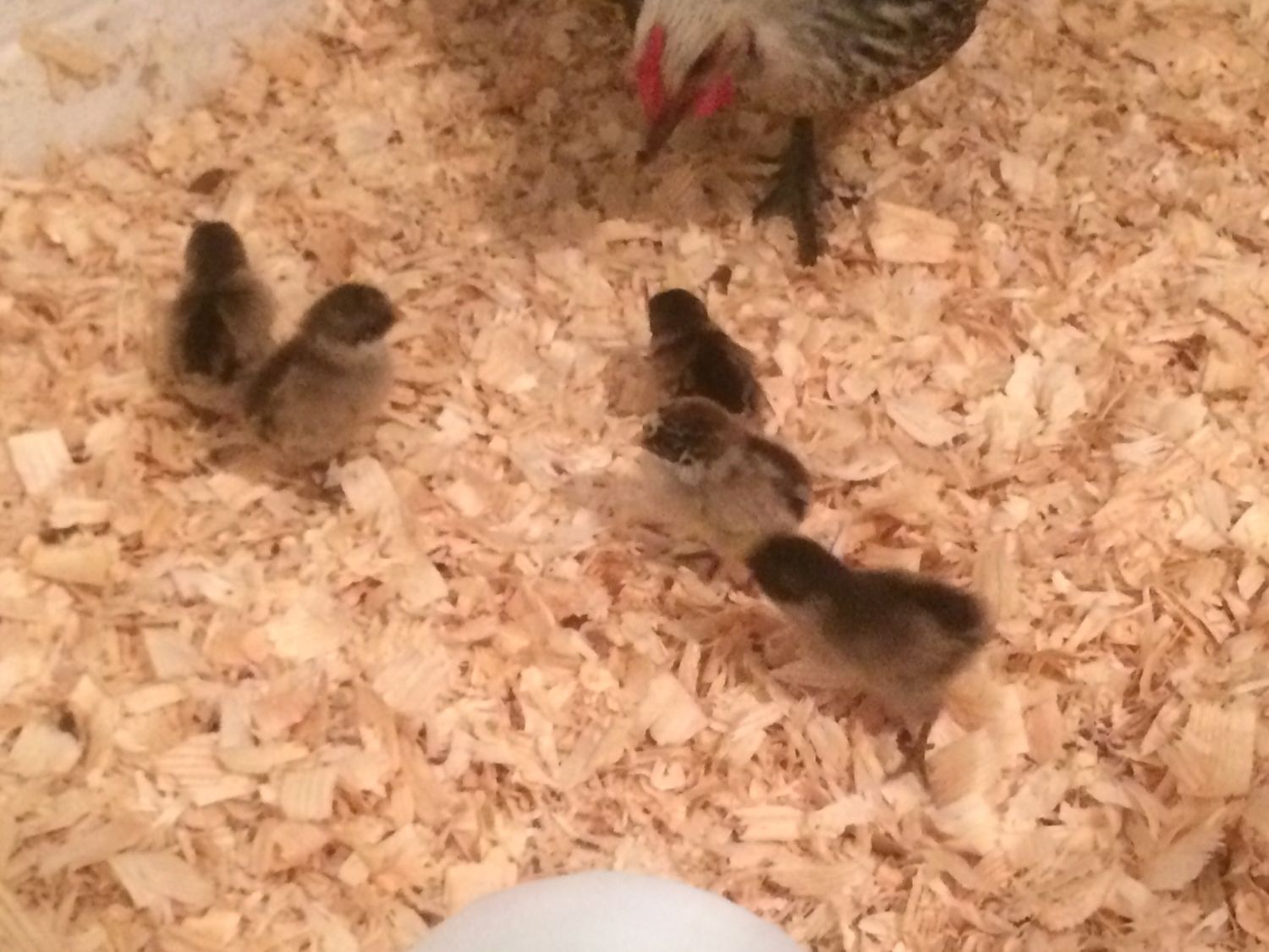 About a month ago some of my IaBs went missing. Eventually I found two nesting outback in the brush so every night I snatch them up and take them to the coop. Then I found another doing the same, but she has returned to the coop on her own. Still, I was one short of my original count and in time, I just figured I'd lost a pullet to a predator. That was until about ten days ago, I found a clutch of eggs carefully concealed in heavy brush. I worried about the pullet, but decided to keep at arms length and just keep checking on her. Well, this morning I was surprised to see the pullet hunkered down in the lush green grass completely out in the open. As I approached, she stood and out from under her sprinted five little puff balls! I found the nest and there were two that didn't make it and the rest of the eggs were cold. Now I have some wild IaBs that were probably sired by a wild pheasant or turkey! Just Kidding! I placed a crate nearby with a bit of food and in no time they were in there eating,
