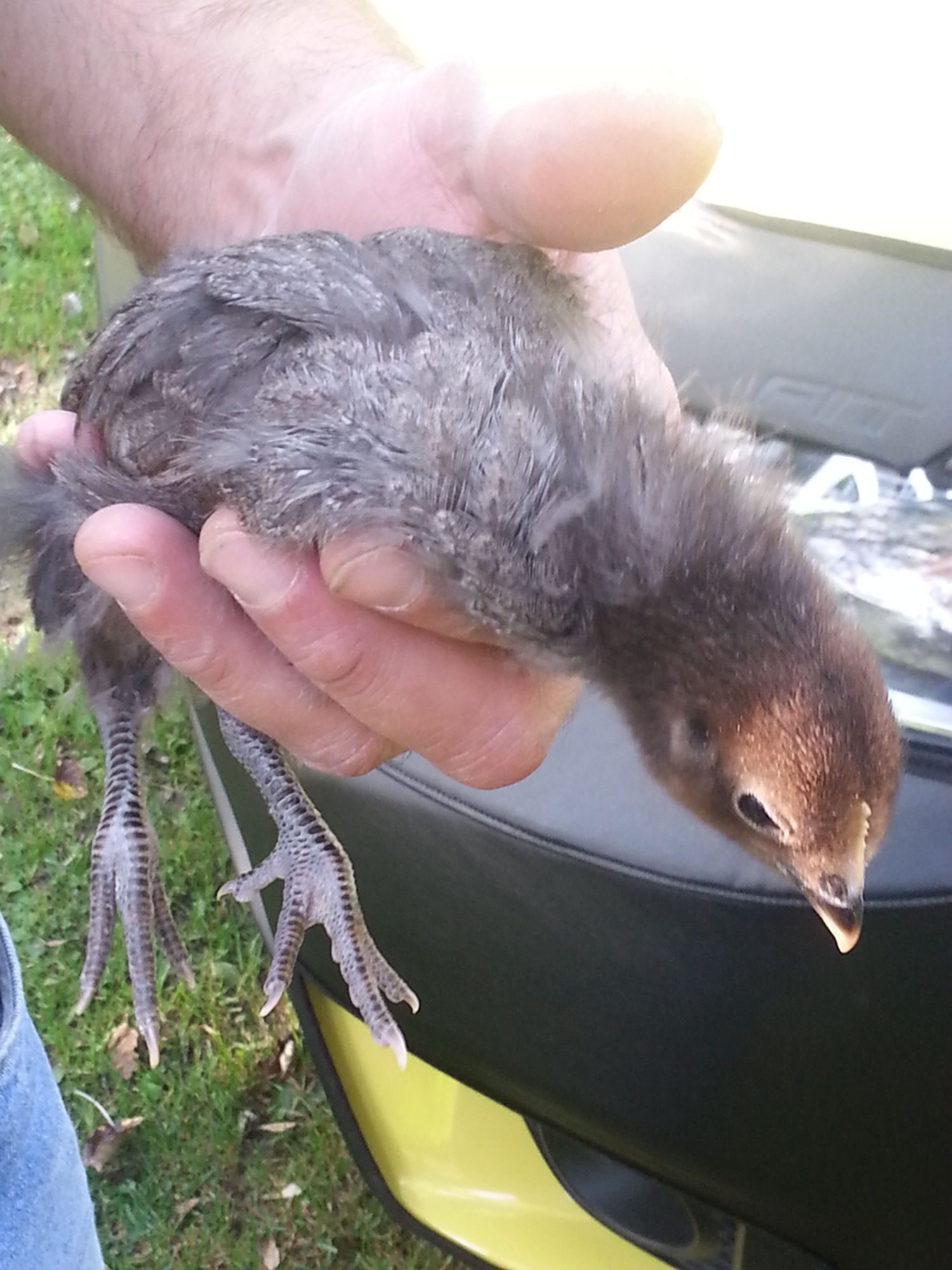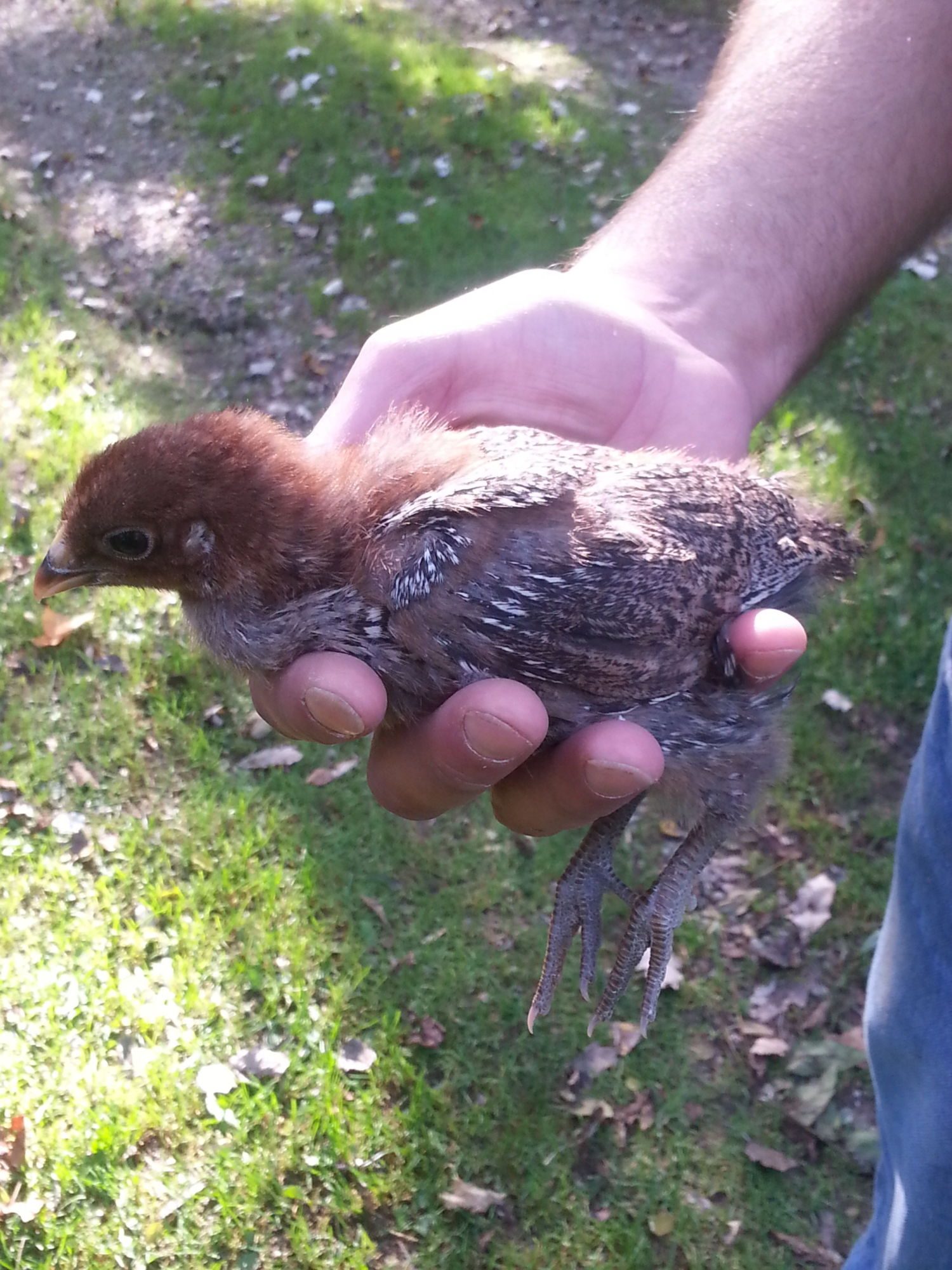 Our broody Iowa hatched two babies last Tuesday. JB is the dad, not sure which hens these are from, think they both are charcoals?