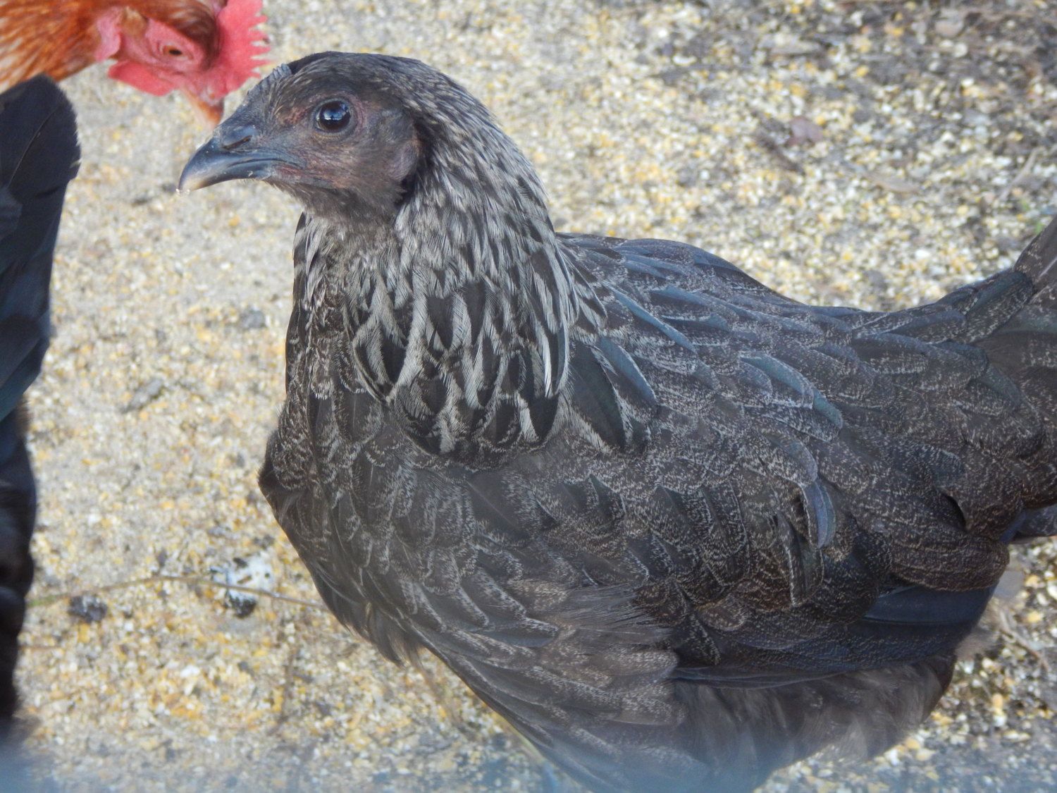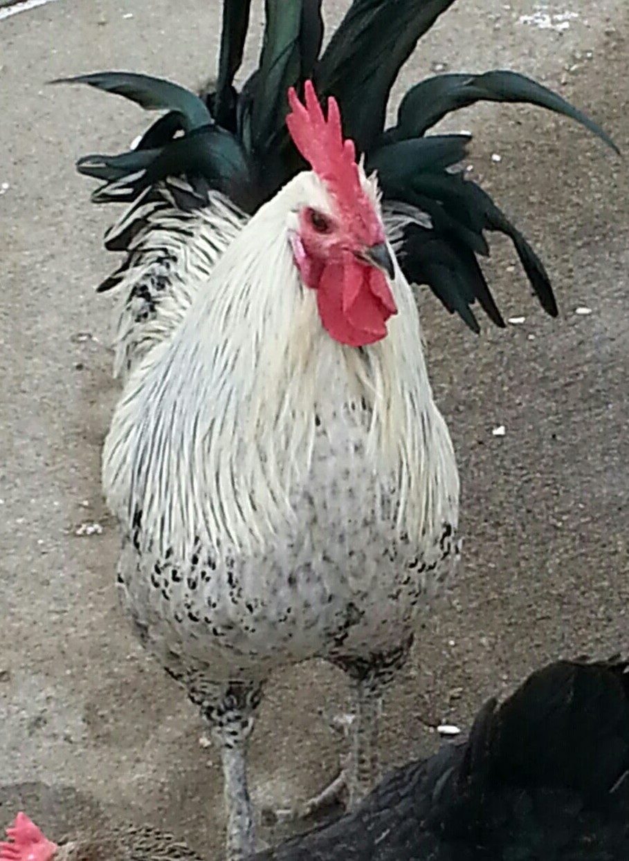 Photos of pullet and rooster from original line. We are trying to get back to the dark gray blue appearance of the feathers :)