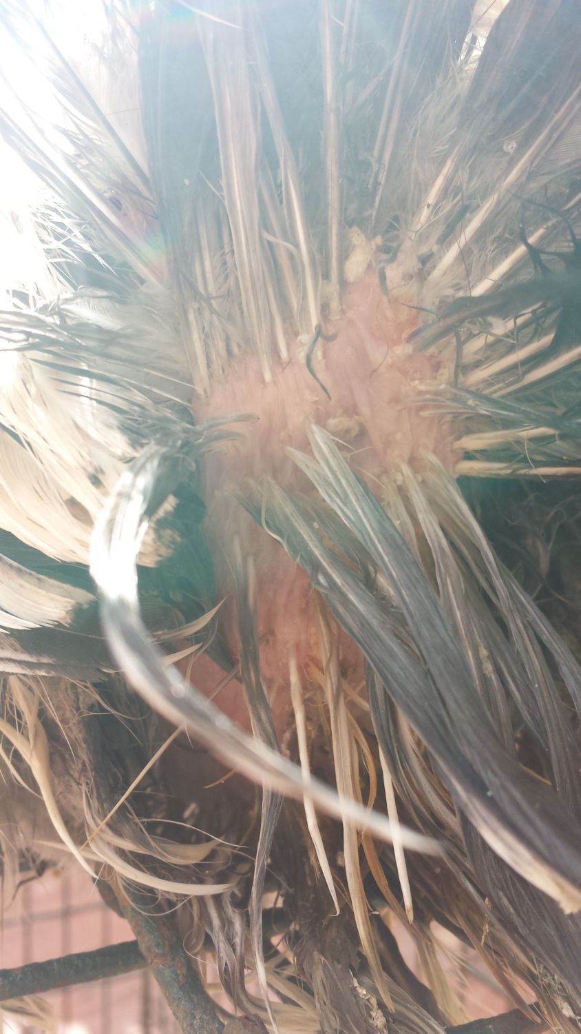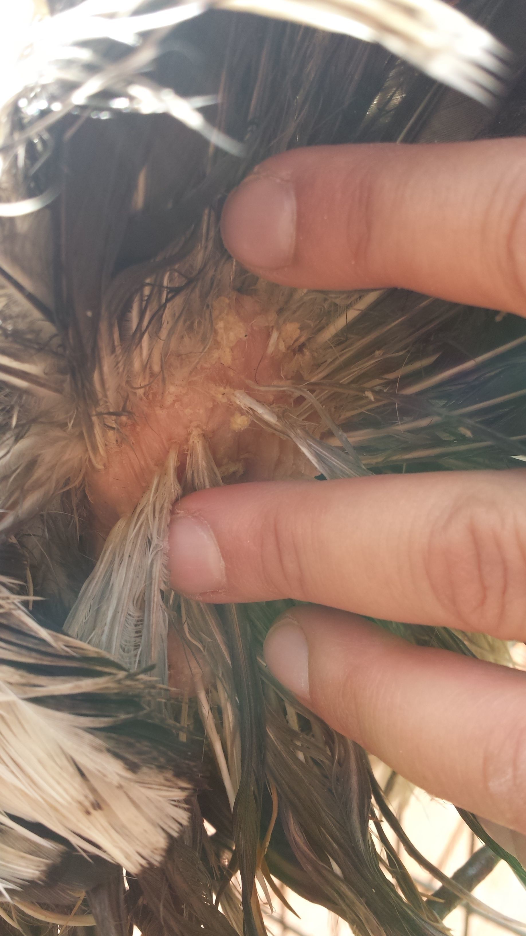 We gave her a bath today (the second since we noticed her drooping tail) and noticed some white soft and grainy substances around the base of her feathers near her vent once we washed her (pictures of this too).