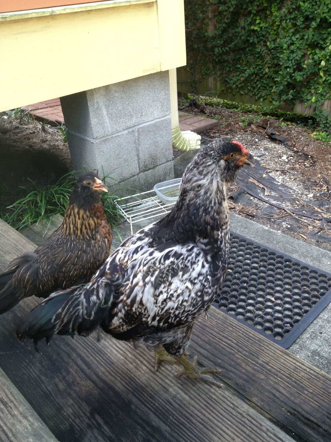 The black, white and grey Araucana is Pippie. Due to the Parish laws, we are hoping that it is a she. Pippie is approximately 9 weeks but has huge feet and is much bigger than Dottie (who is the same age and are fairly confident is a she). Any guesses? Much appreciated.