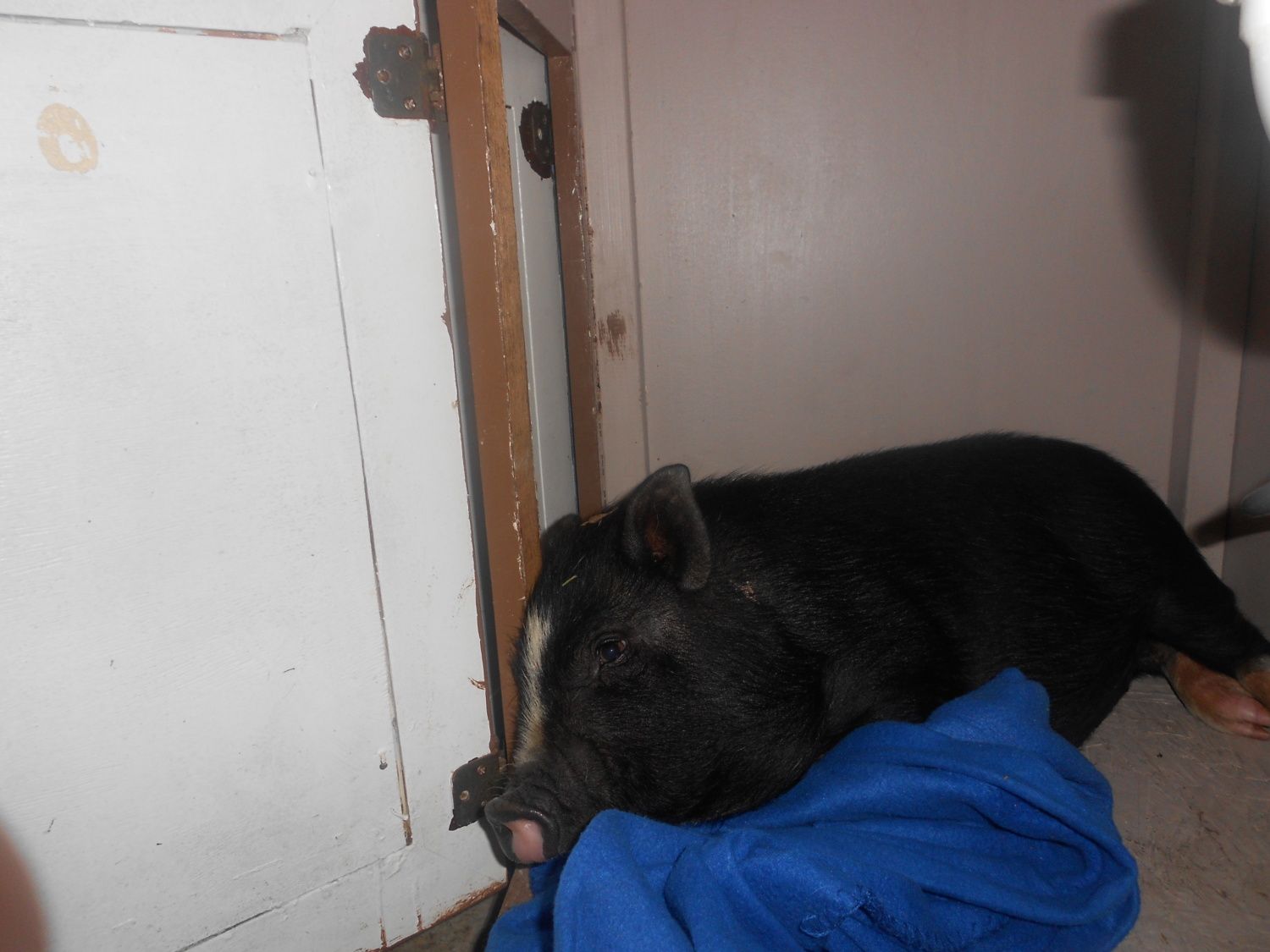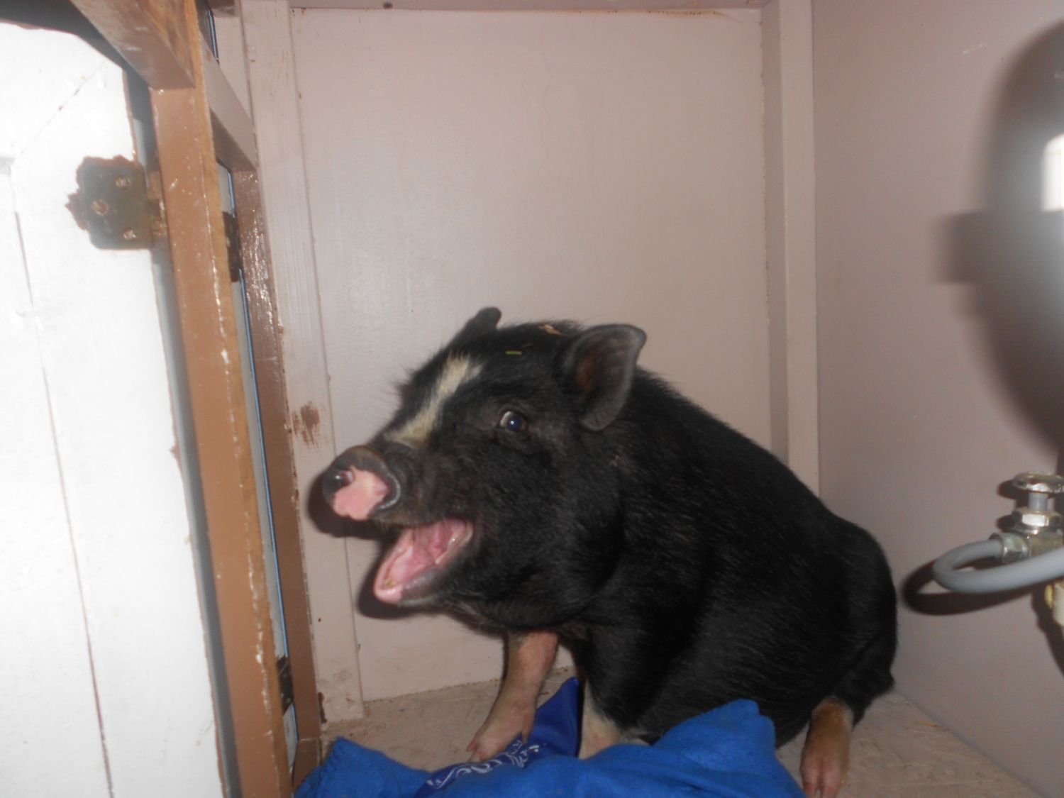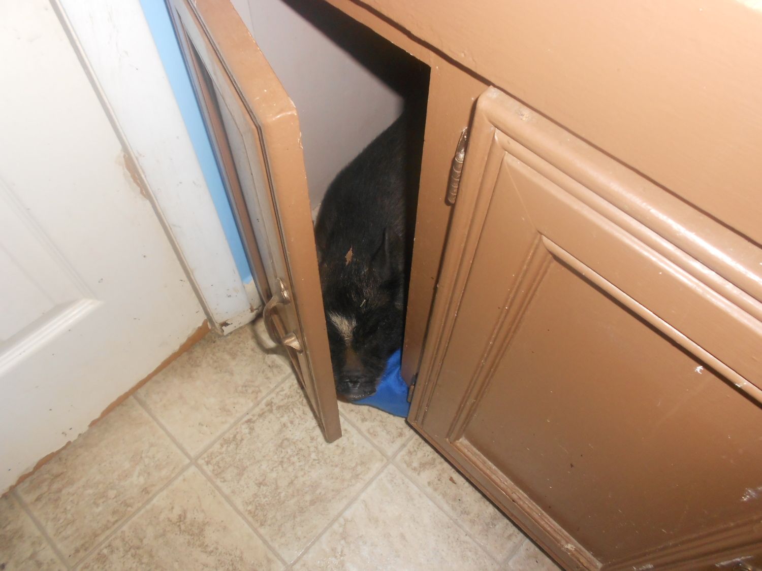 Oh my gosh! That is the best pig picture ever! She looks like she is laughing at you.Thank you I have been talking with my vet and since I have kept her confined the amount of blood in the urine has decreased dramatically we are just going to watch and monitor her at home. We both agreed that trying to get her to the vet would stress her out bad. I think she has picked a nesting spot. yesterday we had my daughters first birthday party. I cam home and she had pulled everything out from under my sink. She then realized she could by-pass the baby gate by going under the sink. She has now got her blanket and pillow under my sink and doesn't seem to want to leave. I don't know if this is a night time bed or a nest. Here are some pics I got of her.Peek-a-boo