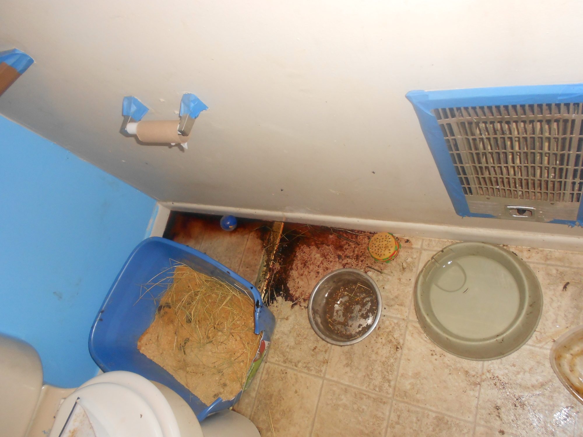 Okay I have a vet coming out today or tomorrow. She is still not acting sick but I am worried. Mamajojo can account for that.lol I am going to post a couple of pictures so everyone can get an idea of how much blood I have seen. remember I had her in my house for two days before this and saw no blood. I let her outside to graze she didn't do a lot of running but she did take a mud bath. I brought her in that night and she peed blood not a lot but she did. The next morning this is what was in my bathroom.....since then she has been inside and there has not been any more blood!