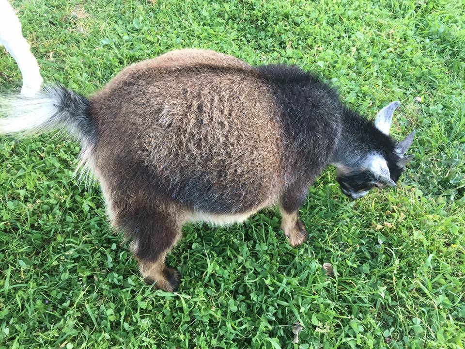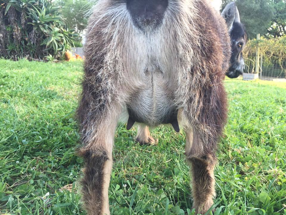 I got my pygmy goat about 3 months ago. She was probably exposed to bucks before I picked her up from her previous home. She now lives with 2 wethers, so they are definitely not the baby daddy! We are about 70% sure she's pregnant, because she's been swelling in her stomach, and now her udders are showing, her vulva does look like it's swelling as well. But, I've never had a pregnant doe, so I can't say for sure. She definitely gorges herself on food, always rejects our wethers' advances and we always just thought she was a really chill goat, but it could just be that she's been pregnant this whole time!