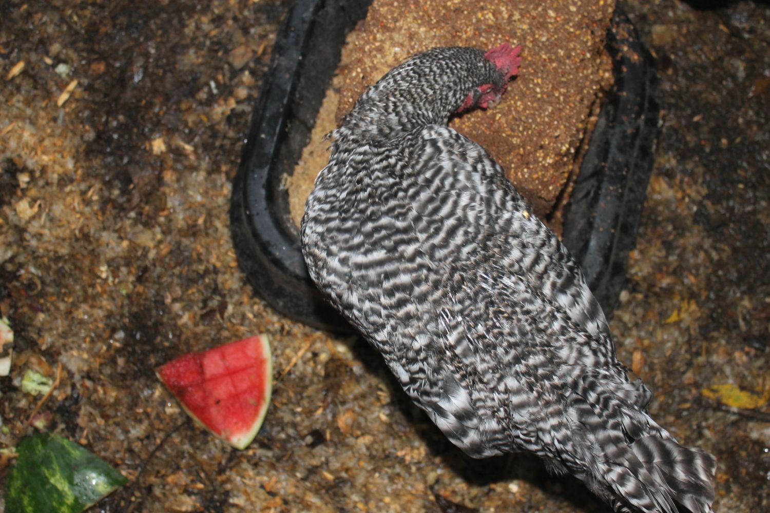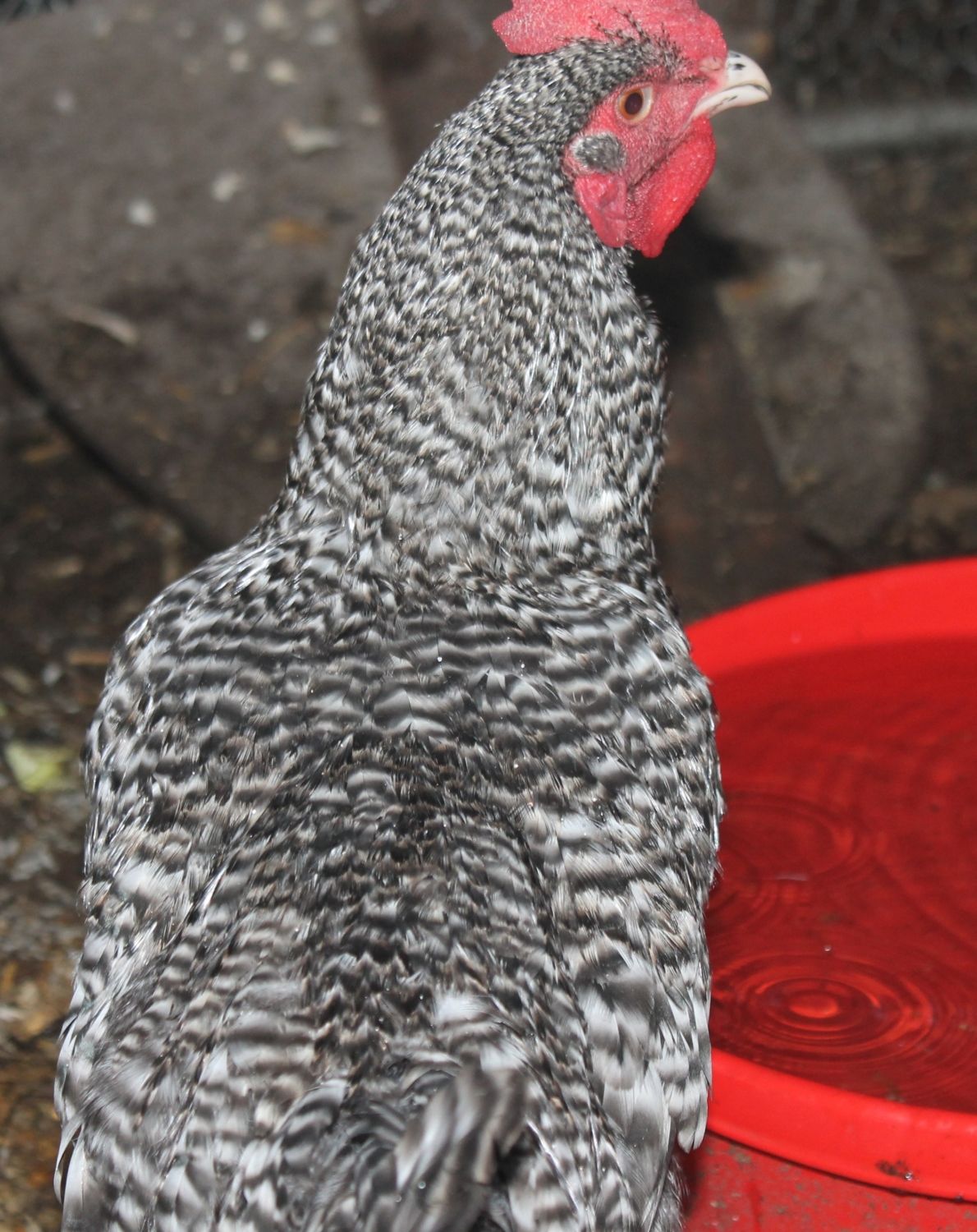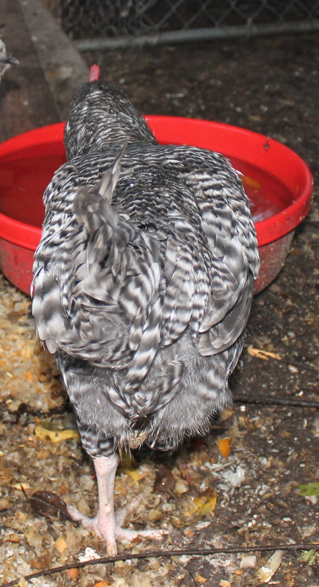 I did get more pictures this morning - and WOW I see a huge difference in the comb (which makes me think it's a boy)... But I also got another picture where it looks like there sort of are "stripes" of color BUT only across her/his shoulders - no where else.
