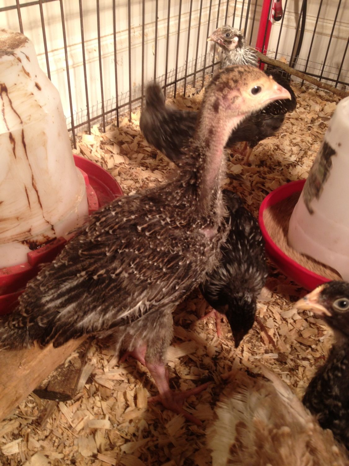 Our poults grow slow, but are healthy nonetheless, if you want it as a pet then chicken food will help it not get overweight so fast. If its a Tom you will HAVE to butcher. They just get too big, will end up breaking their legs from their weight. With BBBs telling hens from toms can be a pain since they don't get brilliant tails or beautiful feathers, but will be more aggressive and have a longer snood (the fleshy thing on its nose), and have more 'pimples' on its neck. Females won't get overweight so fast. Depending where you go it from, some tend to be very leggy and sleek, while other strands will be more square and plump. We've had both, and it might just be age, since in the first year (never kept turkeys past it) they're very leggy like yours, but we have a white BBB (BBW) and she's very square, unknown on age but is laying and has done so for 2 years.