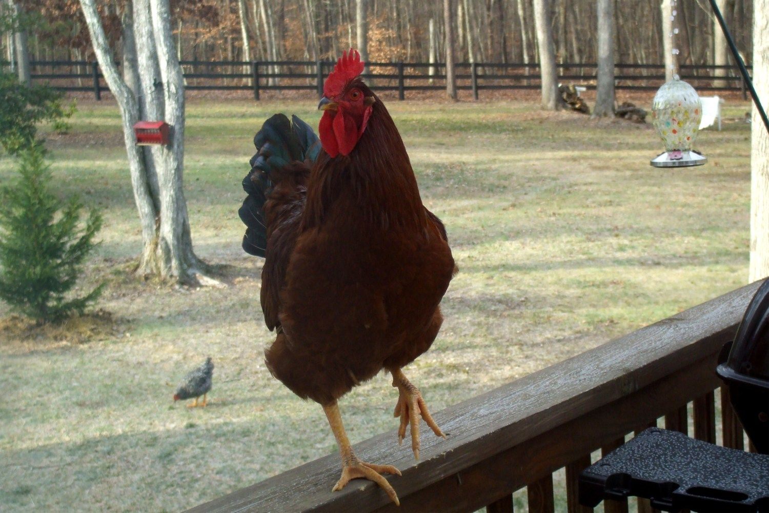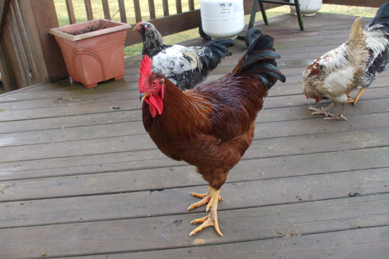 I hatched this boy from an egg I got from my husbands friend. He didn't know what breed chickens he had and I am confused when it comes to RIR, NHR, and Red SL. He is a beautiful boy and was a light brownish red when he was a chick. He is now a deep rust/burgundy color w/ a beetle green tail. His hackle feathers have a very slight gold or light rust lacing but it is very subtle.