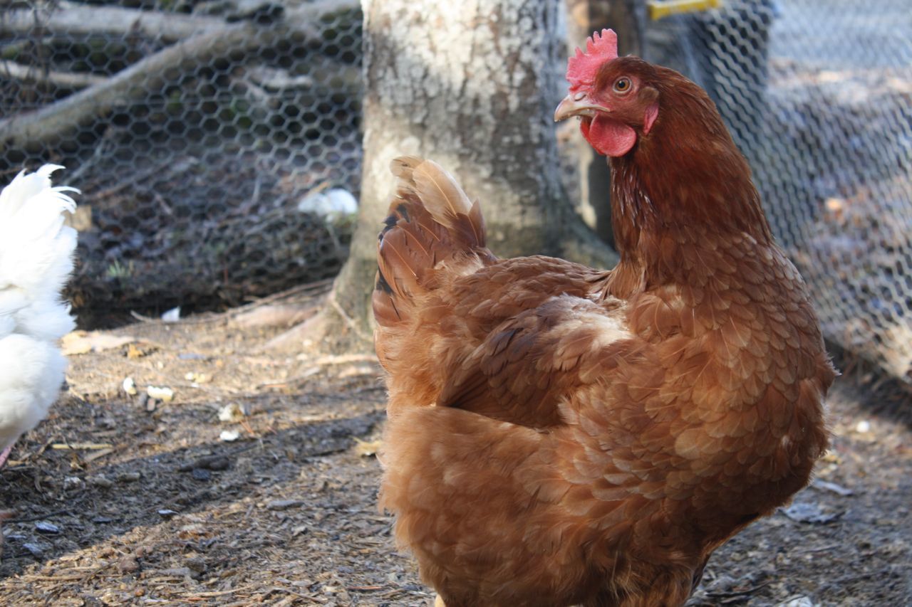 This is Nugget. She is about 3 years old. We got her in a mixed handful of pullets from our neighbor. We really like this chicken and want more. I thought she was a RIR... however, looking them up, she's not that dark, and she is certainly not aggressive. She is a big chicken. We have a few golden comets, so I know for sure she is not one.