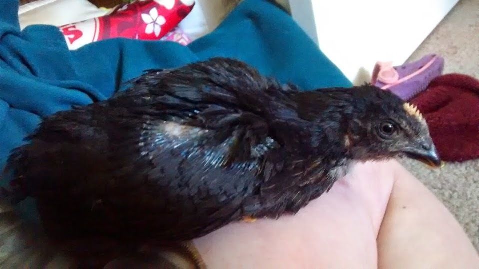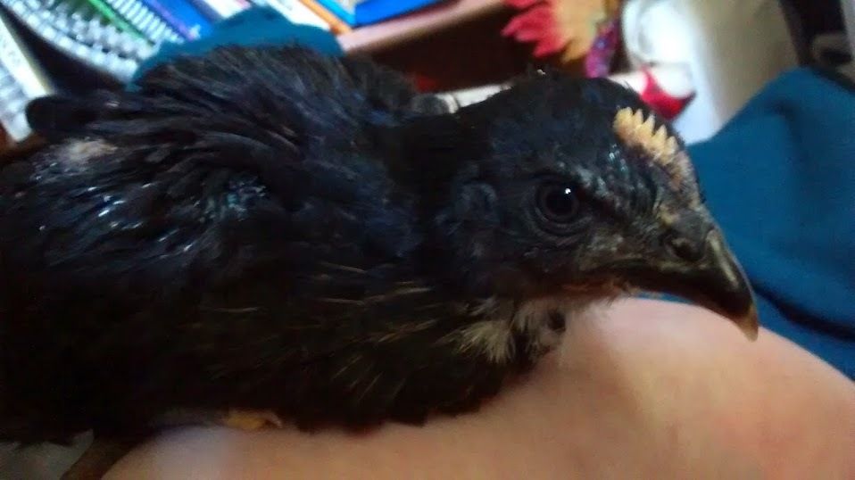 Other chick: All black, save for some white feathers under the chin. The comb is in very distinct ridges.