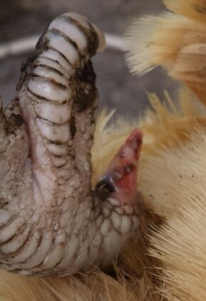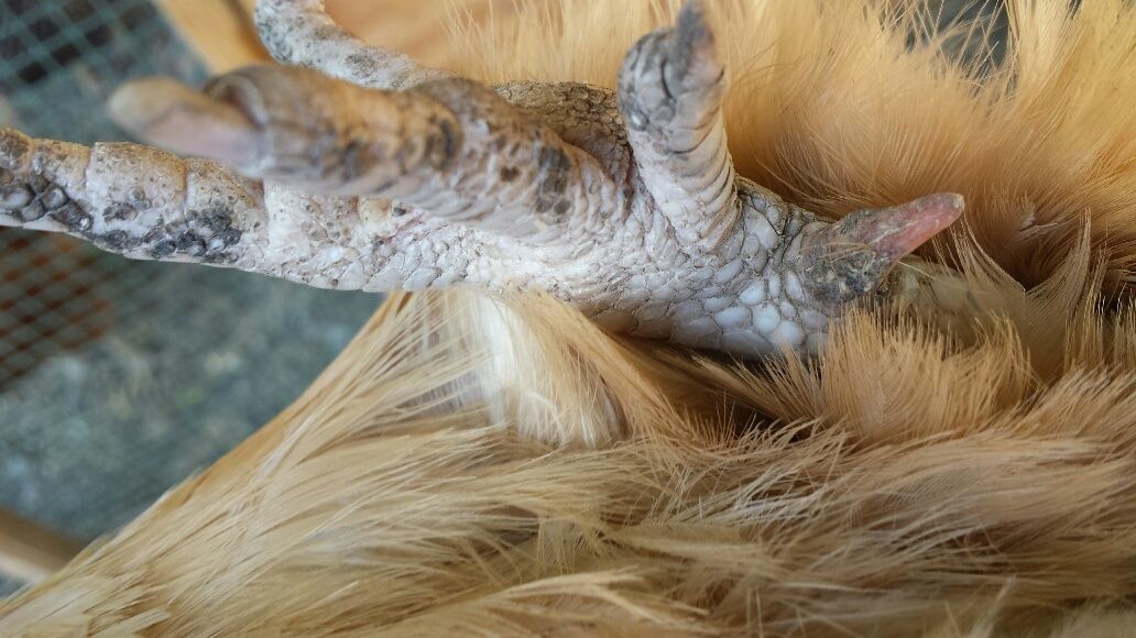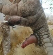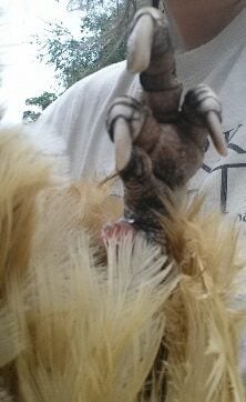 Cradle your bird in your arms and grasp the lower leg just above the spur, and saw away. Set the saw down and change hands with the chicken. You can do it in one movement. The other leg should now be the lowest, take a hold of the ankle and saw away at the spur.