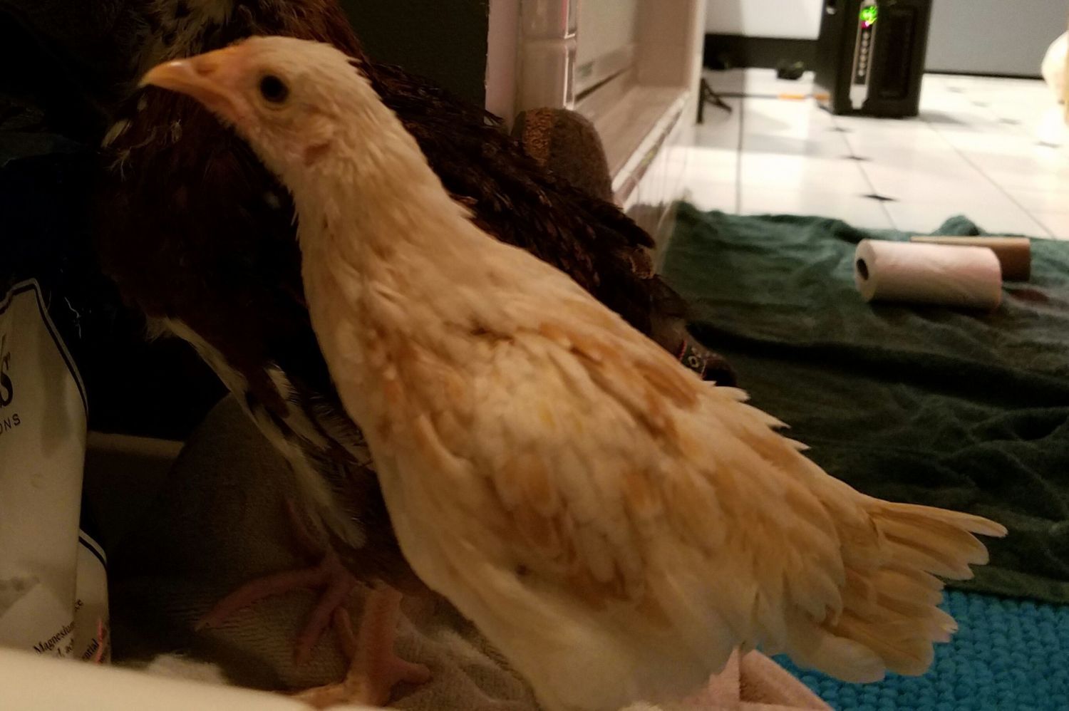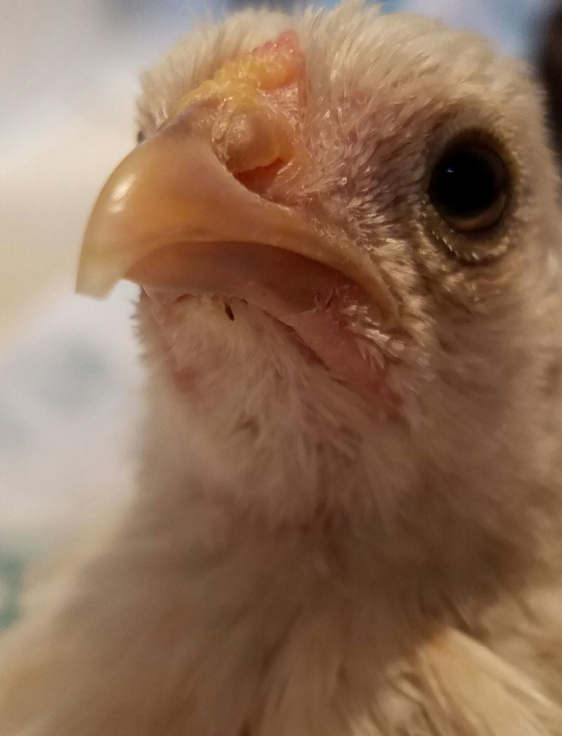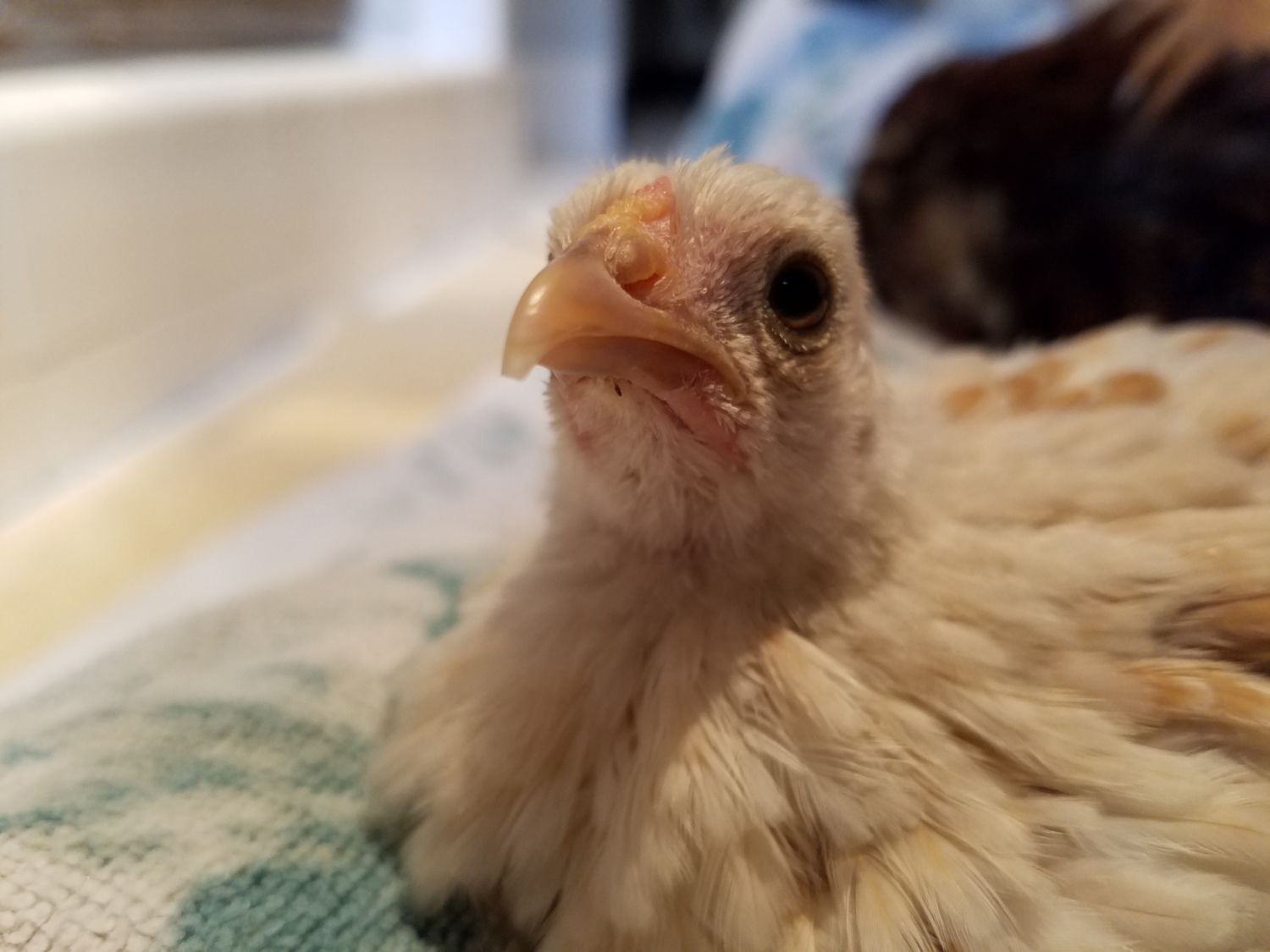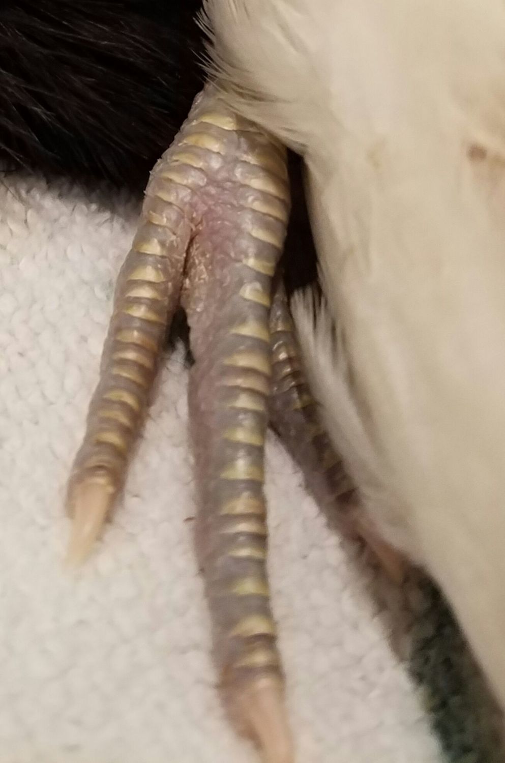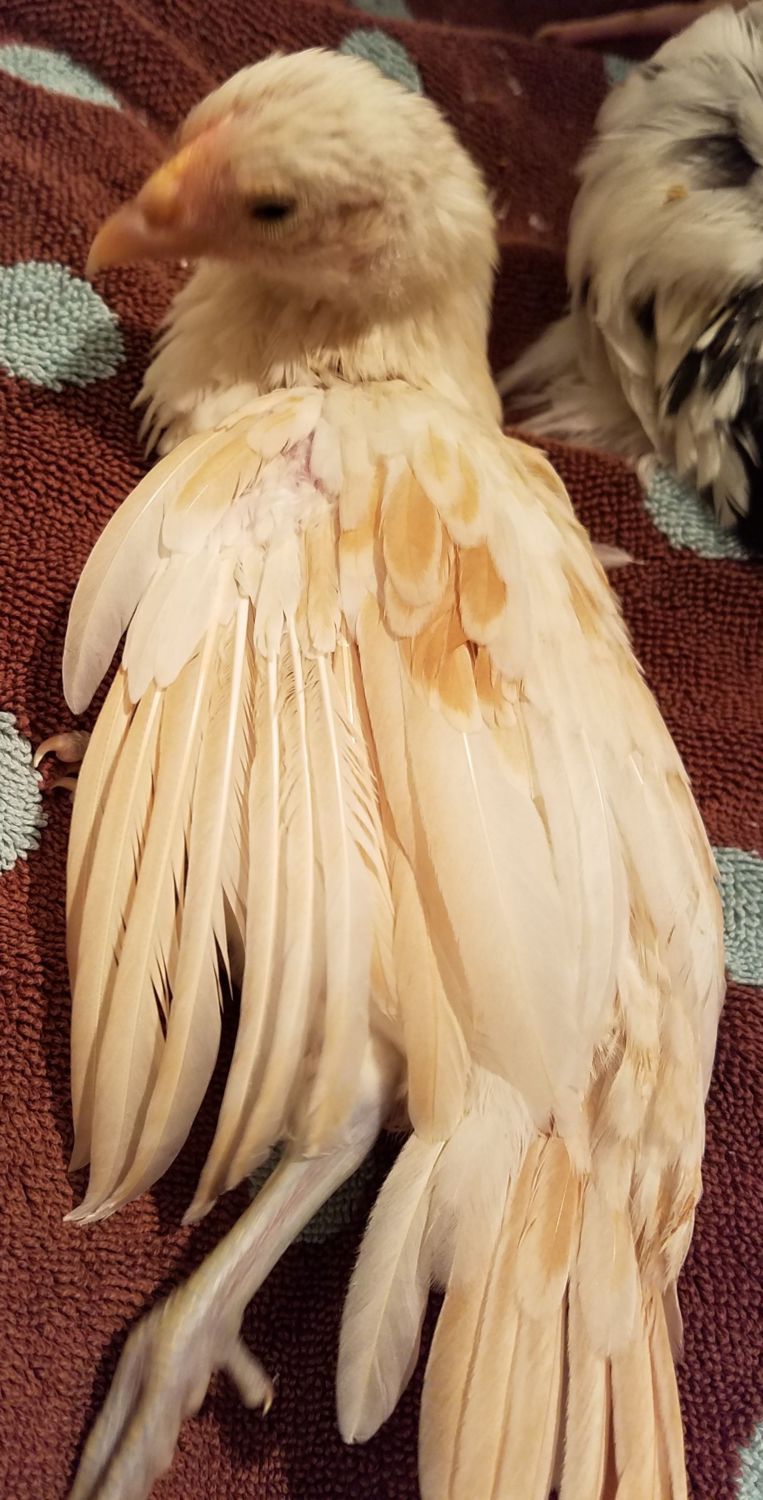 It has been really difficult to tell what sort of comb...the area where a comb will form is very wide and had a lot of little bumps for quite a few weeks until one little triangle formed in the back. Just one...LOL! The comb area is a little pink now but not much comb formation and no wattles....I'm hoping that at 8 weeks and little to no comb/wattle formation, I can feel comfortable that she is a girl?? She feathered out very quickly with the feathers reaching all the way beyond her tail. Her eyes are quite round but each lower lid sags ever so slightly which gives her an almost sad expression. I just love this chicken...she is so incredibly friendly, content to sit in my lap and be petted. VERY vocal...very loud, especially when I leave the brooder area. She has been taking short flights...always to my shoulder since 6 weeks old. She is in the brooder with a mottled cochin roo (I'm pretty sure) and a Speckled Sussex. She and the roo play quite rambunctiously. So she is both easy to handle and high energy. I think she is a darling mutt! Some info. I've read say that OEB can have a variety of leg colors while others say just white??