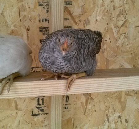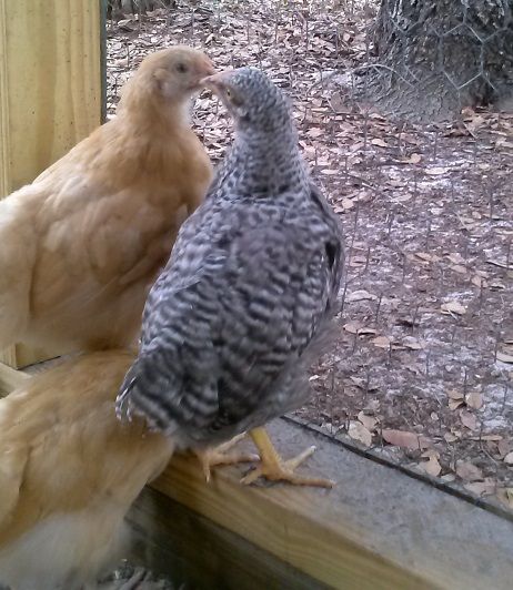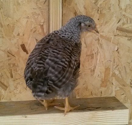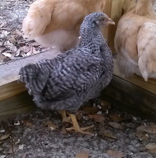 I posted pics of this chick at 3 weeks a while back, now it is 5 1/2 weeks old. Everyone thinks it is a barred rock mix. I agree, the neck feathers really look "laced" instead of barred now. Very pretty. It is the same size as the BOs of the same age in the pics. Still hoping for a hen! What do y'all think?