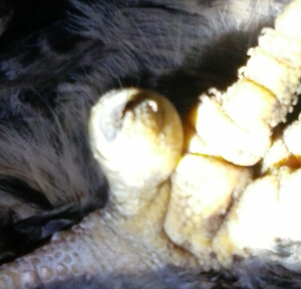 did you take any pictures? could have been some sort of gangrene from her toenail infectionI went ahead and cut into it. It wasn't a white/yellow puss. It was more a brown/black chunky substance. That might be puss. I don't know. My knowledge of puss is limited.
