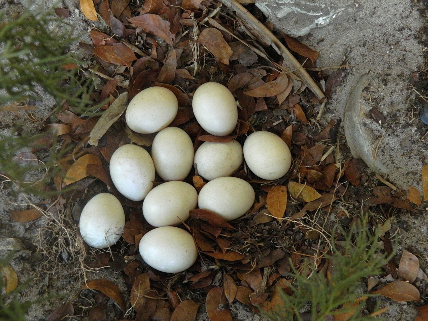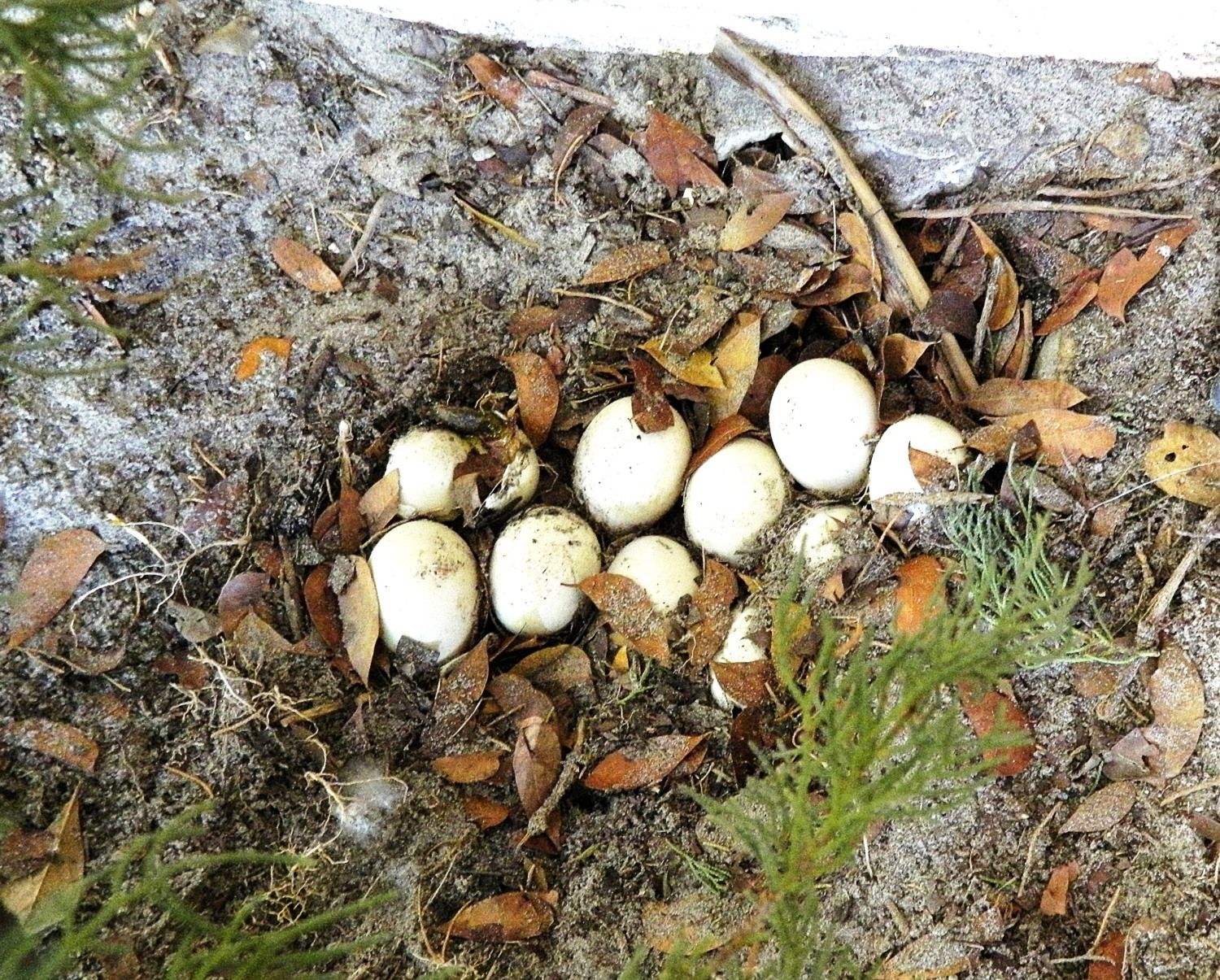 One of the backyard Muscovy females (not sure which one) started laying eggs in a nest under my front window and returned religiously for 10 straight days, laying one egg a day. The nest was a little odd in that it had no feathers to soften it, it was just an indentation in the sand with leaves and twigs to line it. She rearranged the eggs each day, sometimes covering them with the leaves and sometimes just leaving them all out in the open.