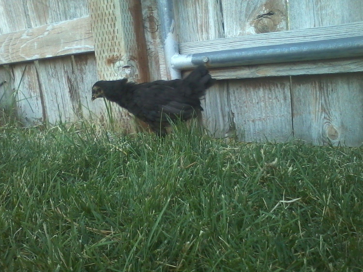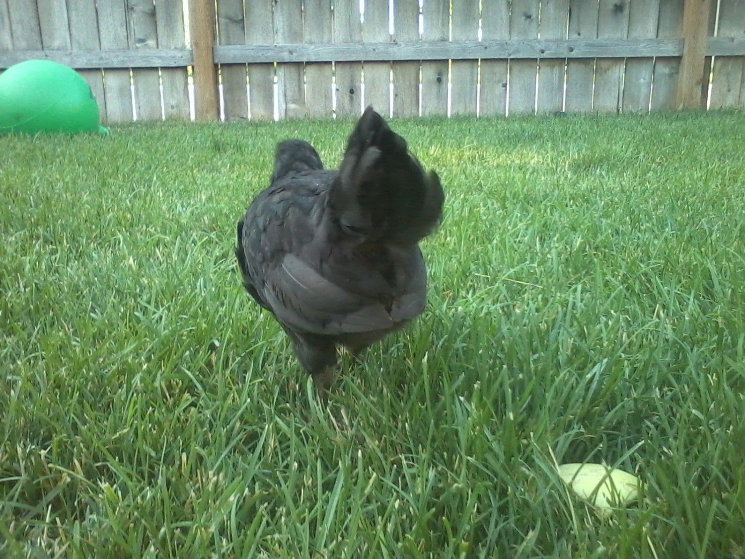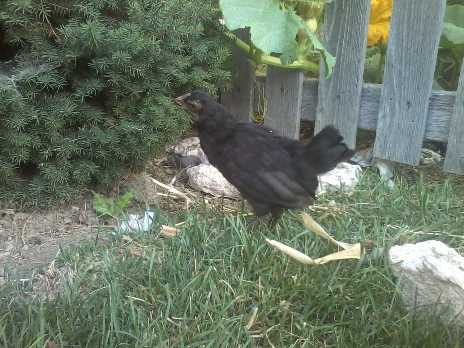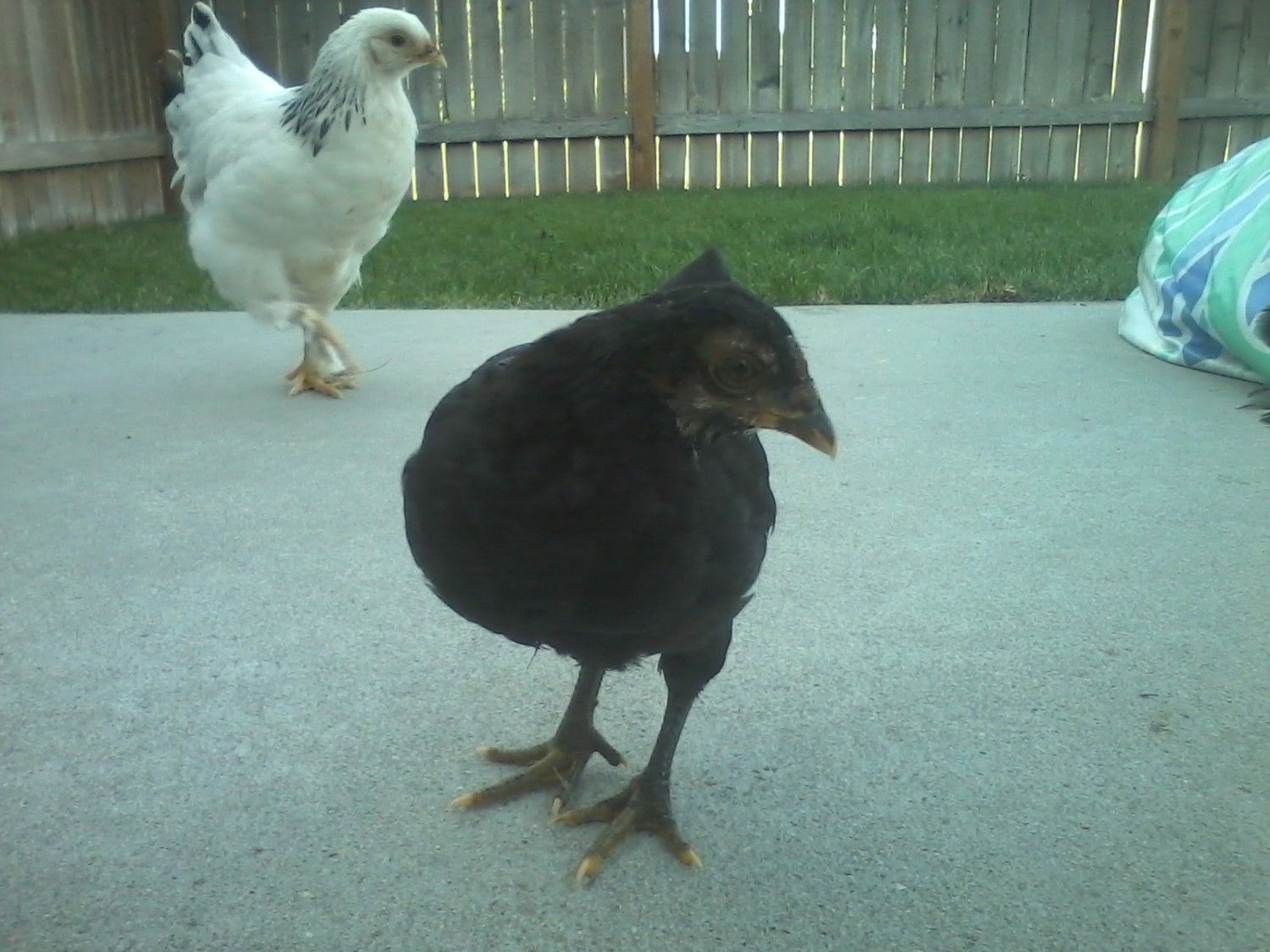 I bought this chick at three weeks old and was told they had gotten it from a hatchery and that it was a Black Australop. Well, on a different thread someone pointed out that this chick looks more like a Black Sumatra. She is half the size of all the other chicks of the same age, and twice as brave and spunky. She had a big patch of white on her chest at 3 weeks old, but now at 7.5 weeks she has almost no white left except a little fluff under her beak. She is quick and hard to photograph, but she usually has a very erect head and tail carriage. The bottoms of her feet are a bright yellow, and I think she has a rose comb.