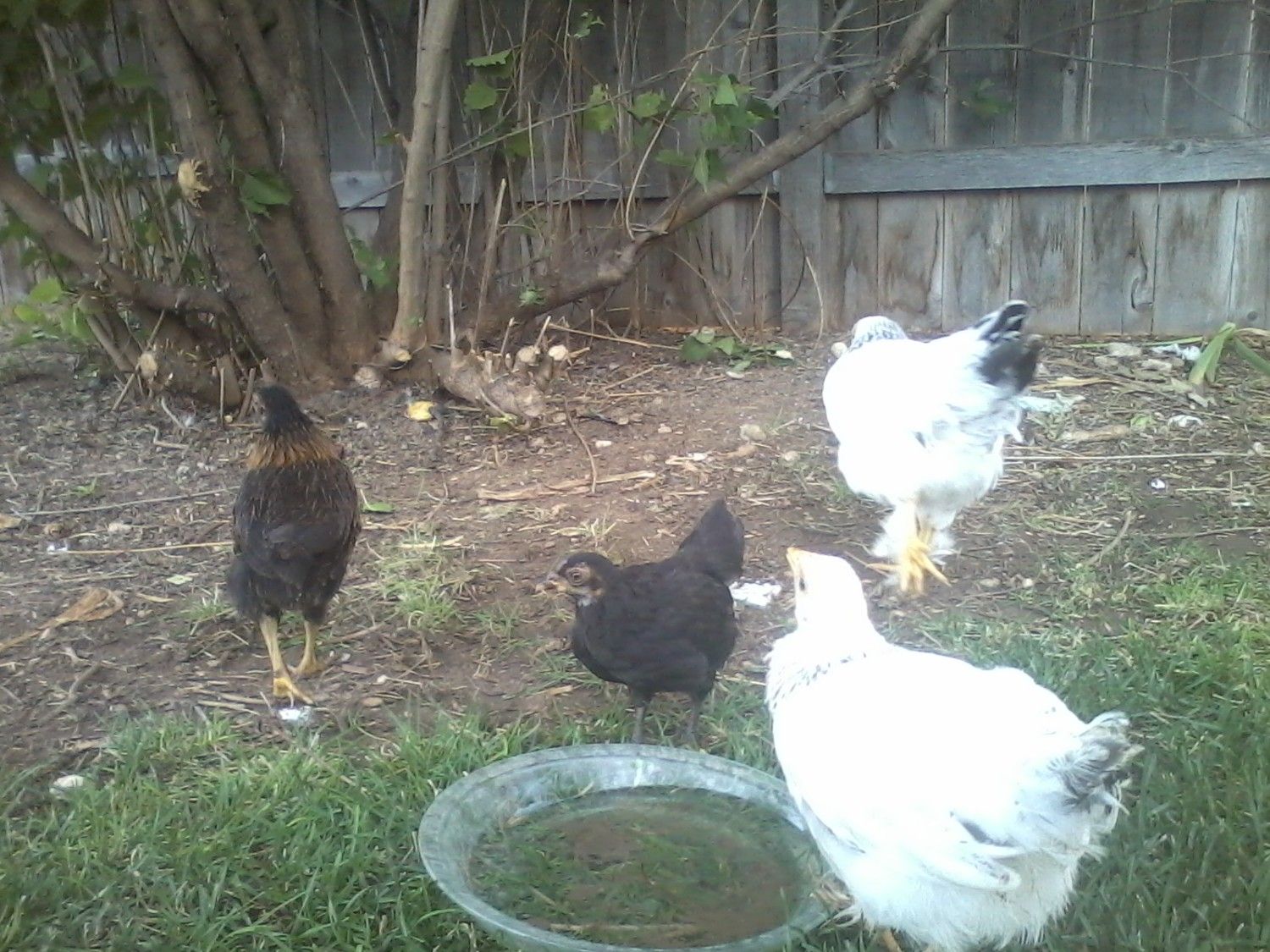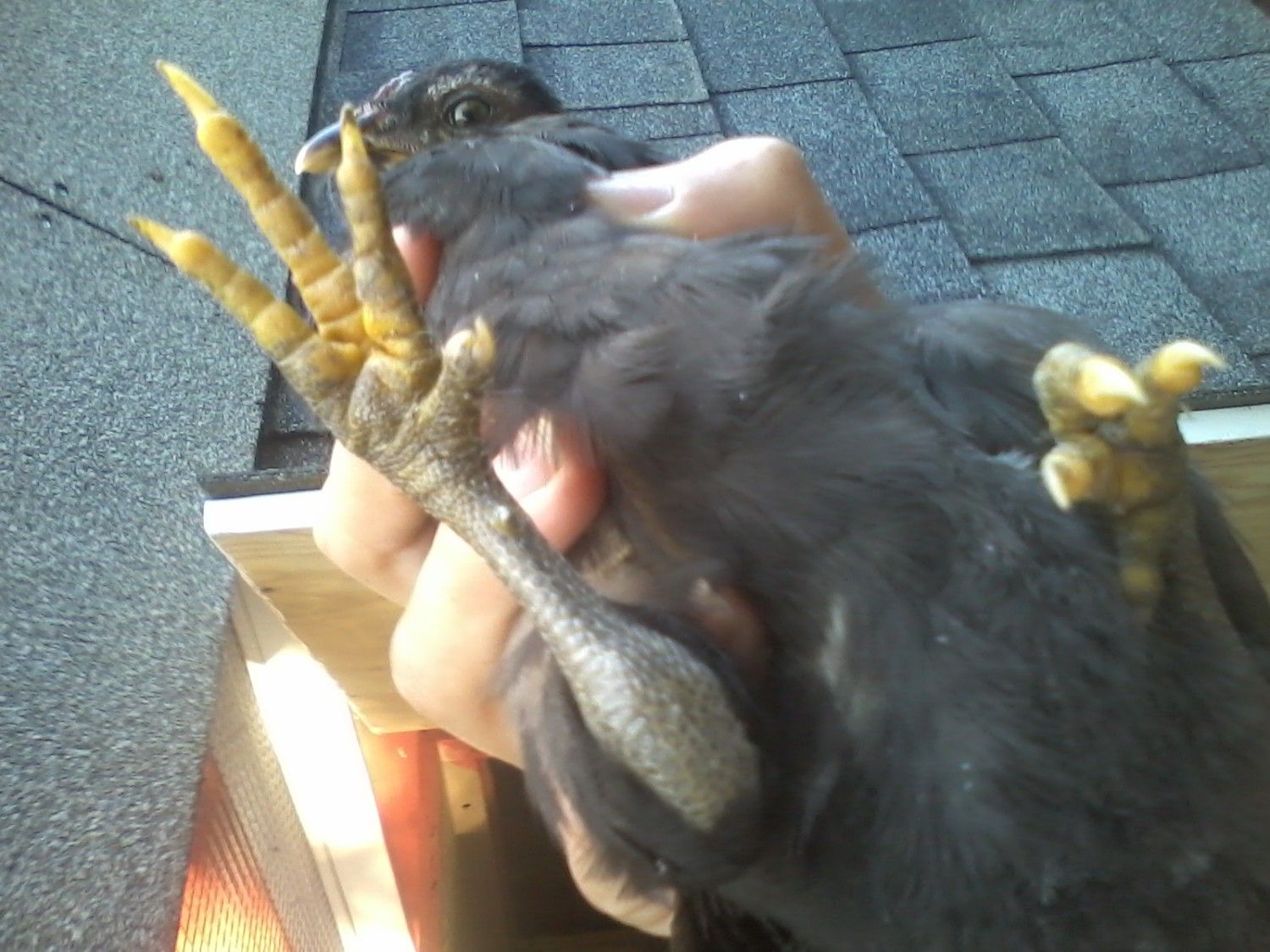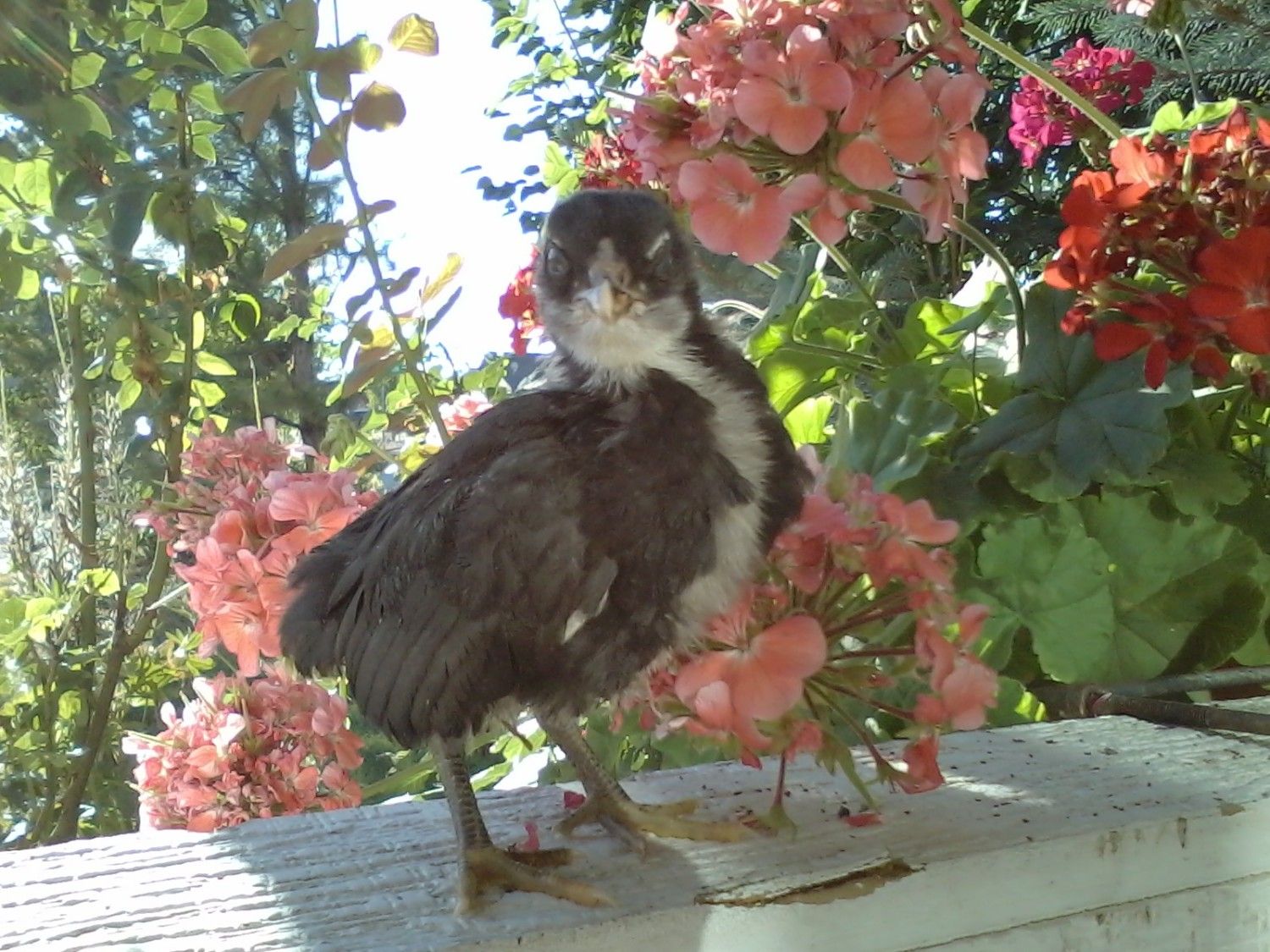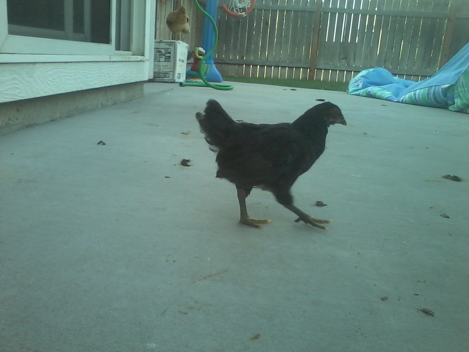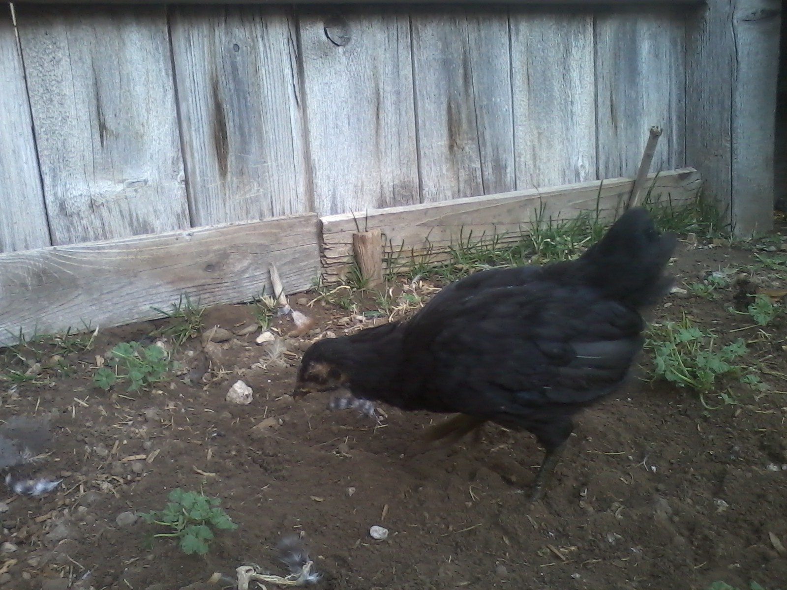 I bought this chick at three weeks old and was told they had gotten it from a hatchery and that it was a Black Australop. Well, on a different thread someone pointed out that this chick looks more like a Black Sumatra. She is half the size of all the other chicks of the same age, and twice as brave and spunky. She had a big patch of white on her chest at 3 weeks old, but now at 7.5 weeks she has almost no white left except a little fluff under her beak. She is quick and hard to photograph, but she usually has a very erect head and tail carriage. The bottoms of her feet are a bright yellow, and I think she has a rose comb.
