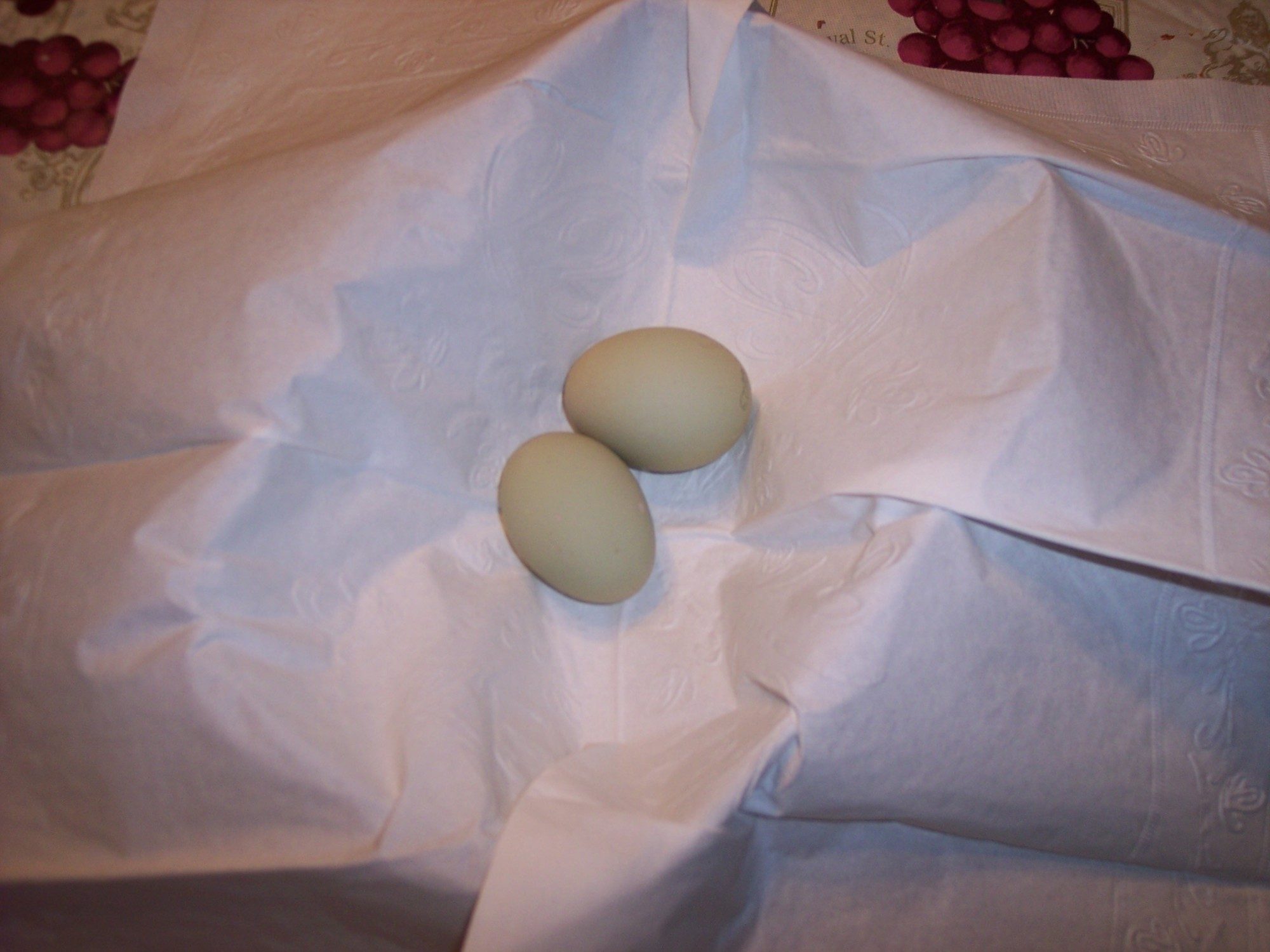 Here are some that my two pullets have laid. These are pullet eggs, definitely "small" grade. They are slightly more blue than the ones they hatched from but still definitely green.