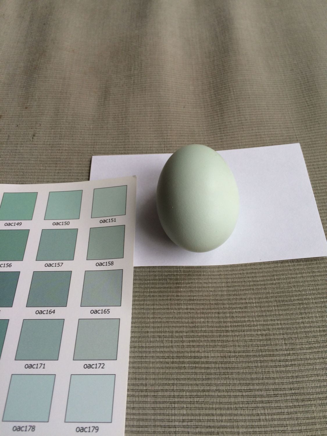 I found this Google Doc conversion from The Ameraucana Breeders Club "Egg Color Reference Chart" to the Online Auction Color (OAC) Chart and vice versa.It is "The Online Auction Color Chart". I got mine off Ebay, but I don't see any on there now.Helpful if enough people use the same thing, but I'm not sure how many of these are out there.![]()