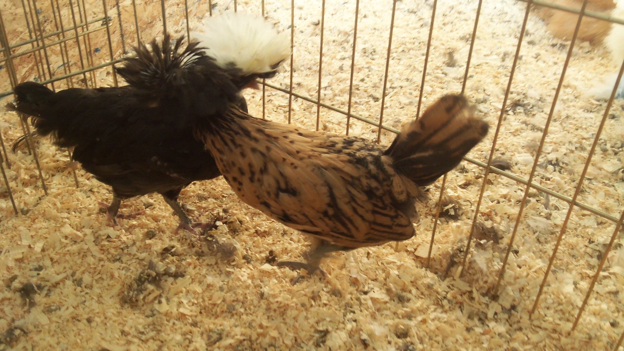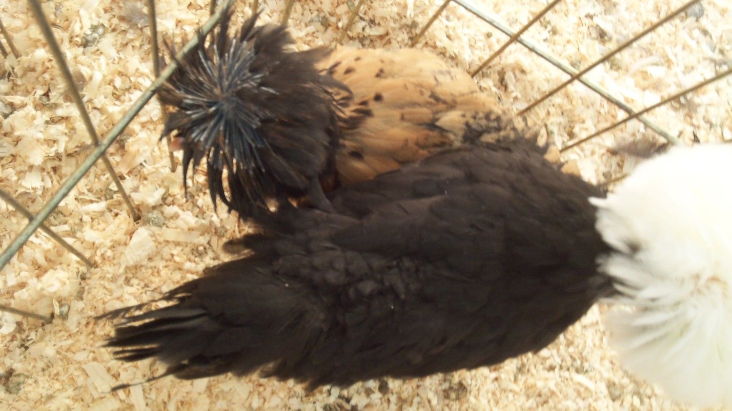 Delilah is the white crested black one, and Shenzi is the golden polish. It's hard to see, but Shenzi is missing almost all the feathers on the top of her head!