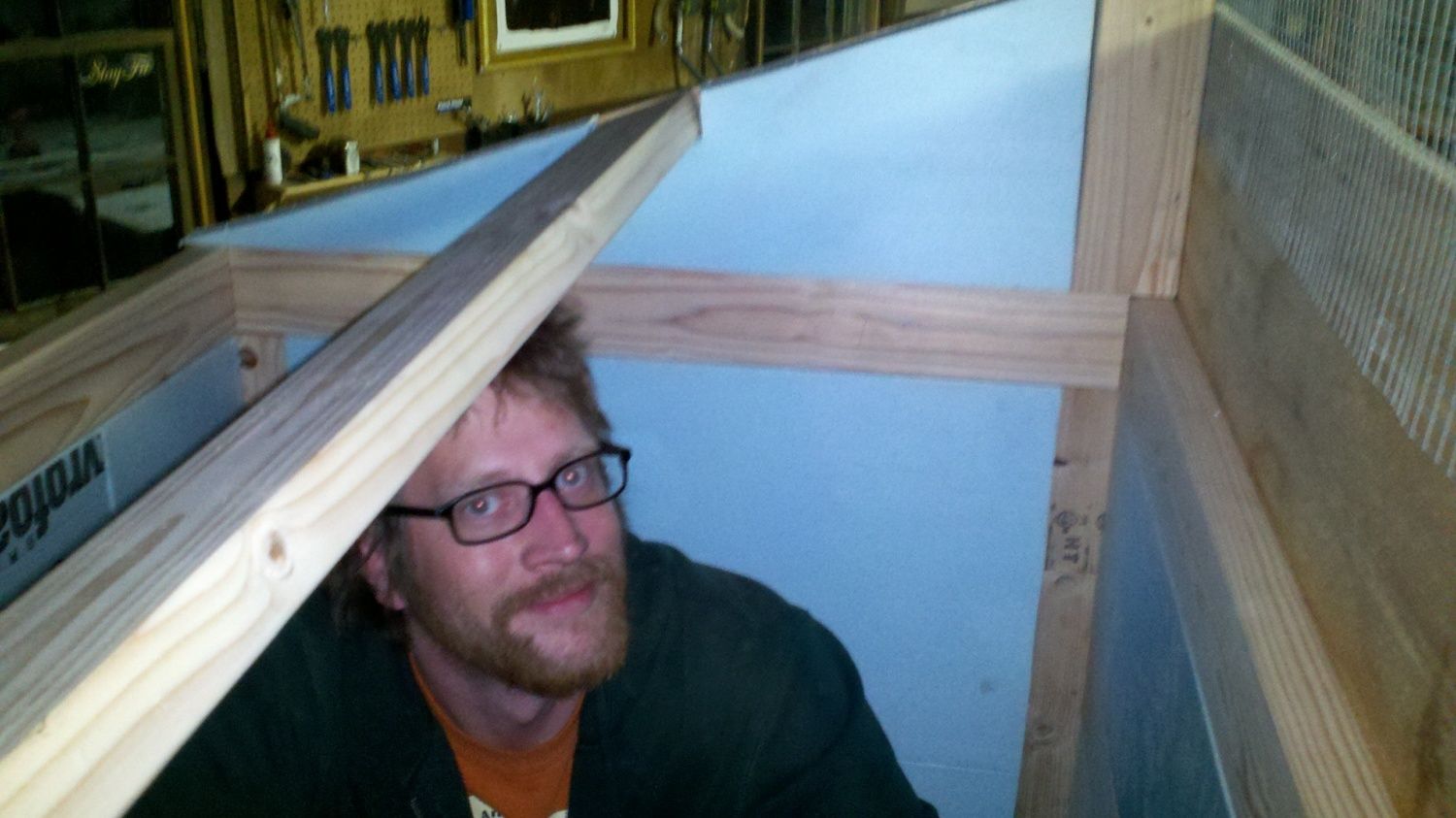 And here is my 6'5" man inside the coop stapling the hardware cloth