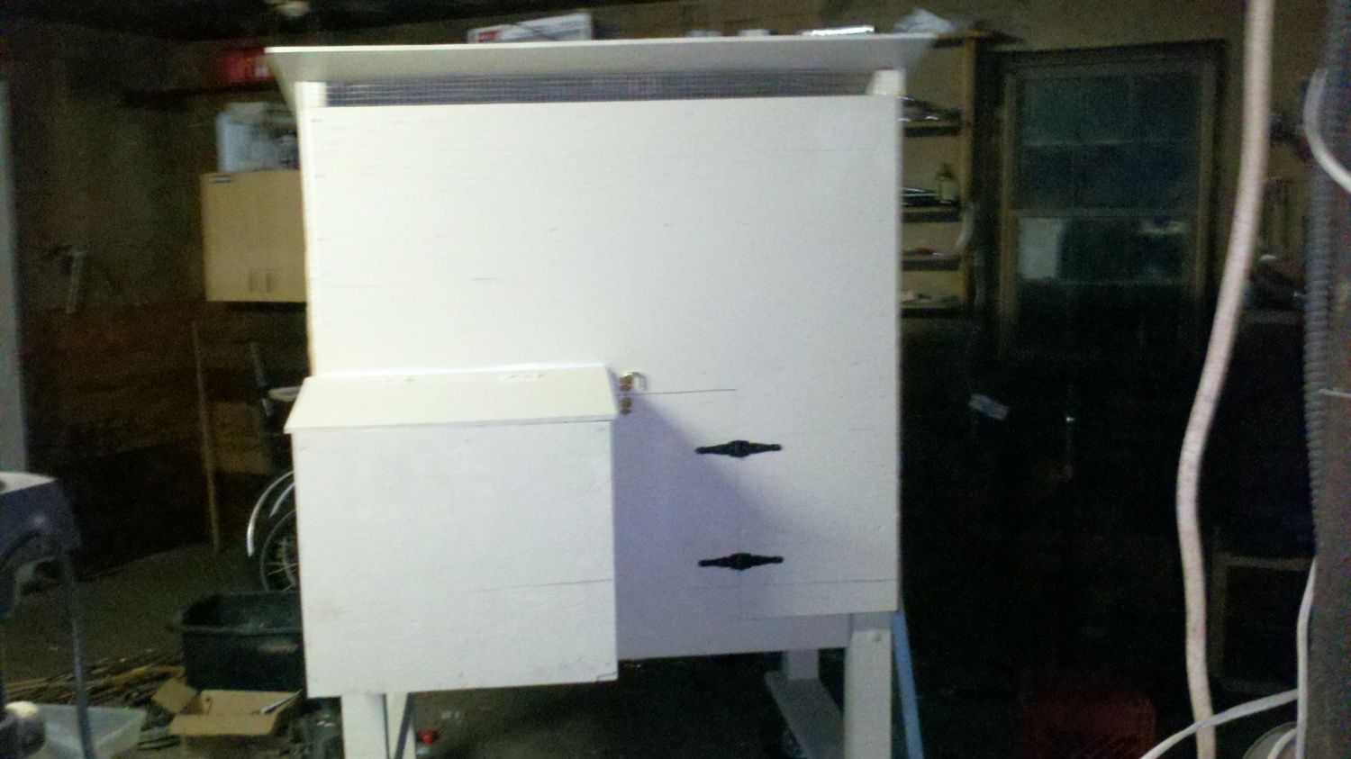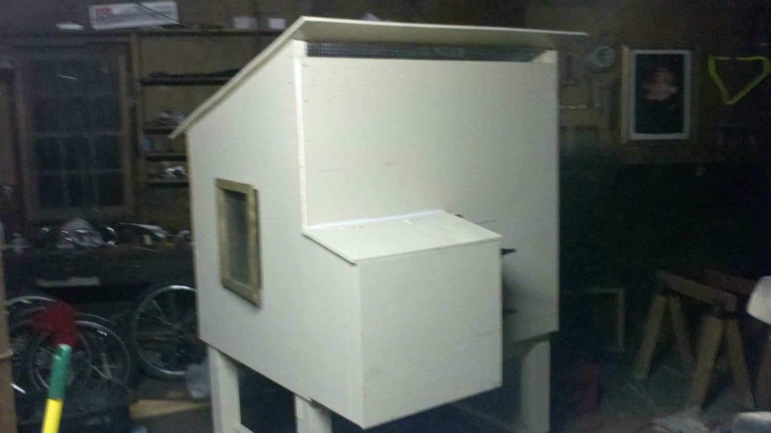 Here is the front view - nesting box on the left and front door in the middle. Big vent along the top and a window on the side.
