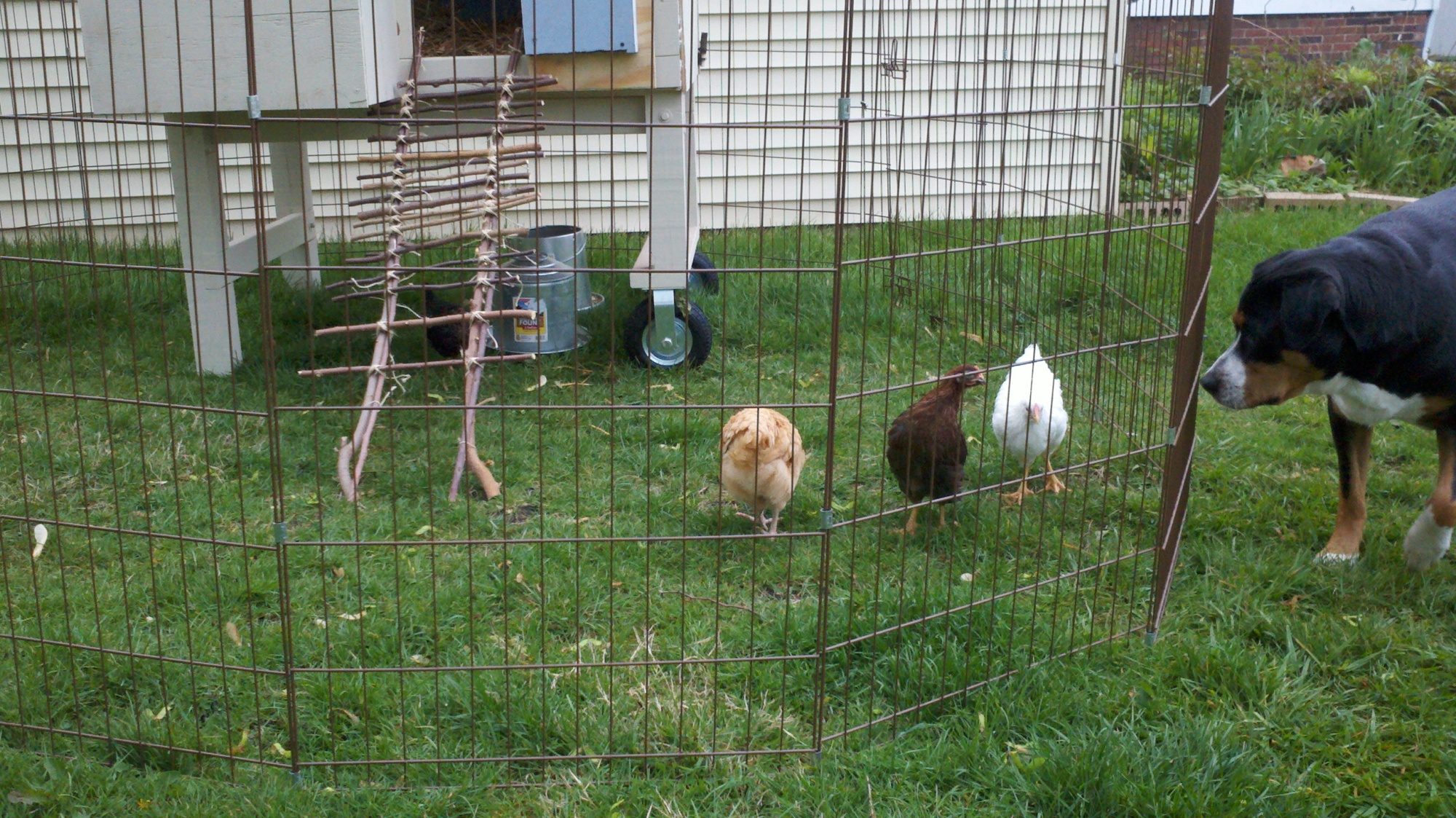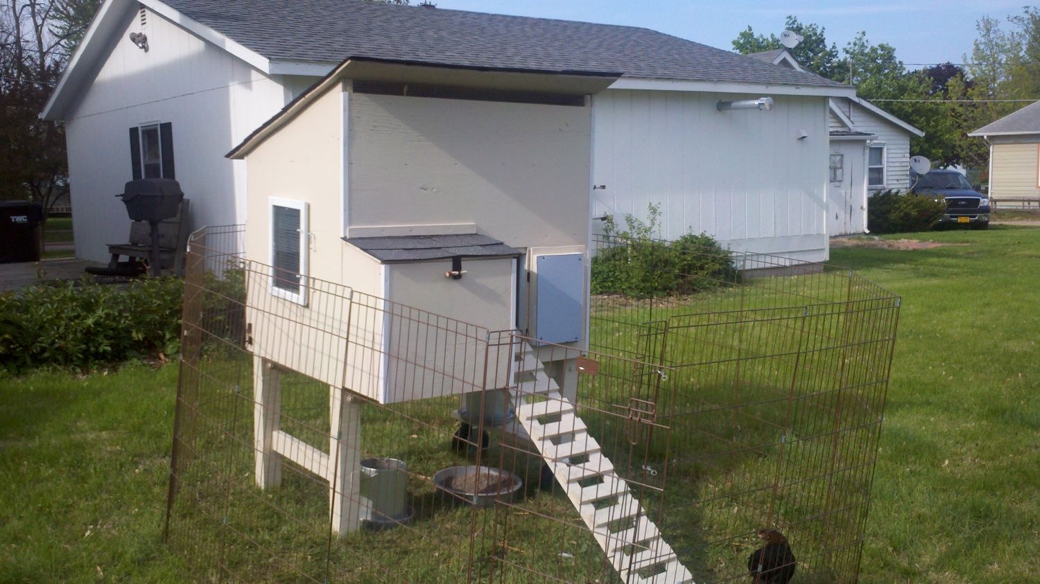 Well, it's all finished now. Since I took these pictures, I've added one more 8 foot length of fence. So they have a lot of room to run around. We move the coop once a week to a new spot in the yard, and so far it is going great. The chicks eat up my weeds and help fertilize and airate my lawn, yay!
