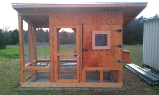 It's 5' X 10' , 7' high in the front 6' high in the back. I used 73 2"X4"X8' , 4 sheets of 3/4" plywood for the box and nest boxes, 3 sheets of 1/2" plywood on the roof , 5 pieces of sheet metal on the roof , 3 sticks of drip ledge, 5lbs of 16d sinkers, 5lbs of screws, 100' roll of wire cloth, 2 pieces of 1/4" plexiglass, 20- 1"X4"s to cover stapelled mesh , 2 gallons of deck sealer, 22 cinder blocks, 22 8"X16"X2" concrete caps, 2"X4" heavy gage wire for run floor, scrap carpet over that then about 3" of sand from the back yard, 4 sets of hinges [one used], piece of vinyl flooring [ left over from friends work ] for coup floor, 3- 2"X6"X10' treated for base,