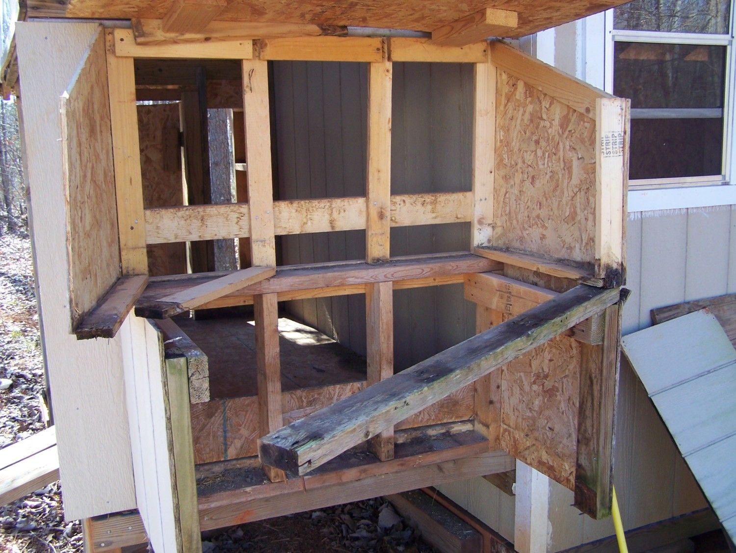 I started by fixing up the coop. Had to pull the bedding out, replace some rotten boards, and fix the nesting box doors...among a few other odds and ends like replacing the roost (which was just a long tree branch balanced on nesting boxes) and installing locks on all the doors.