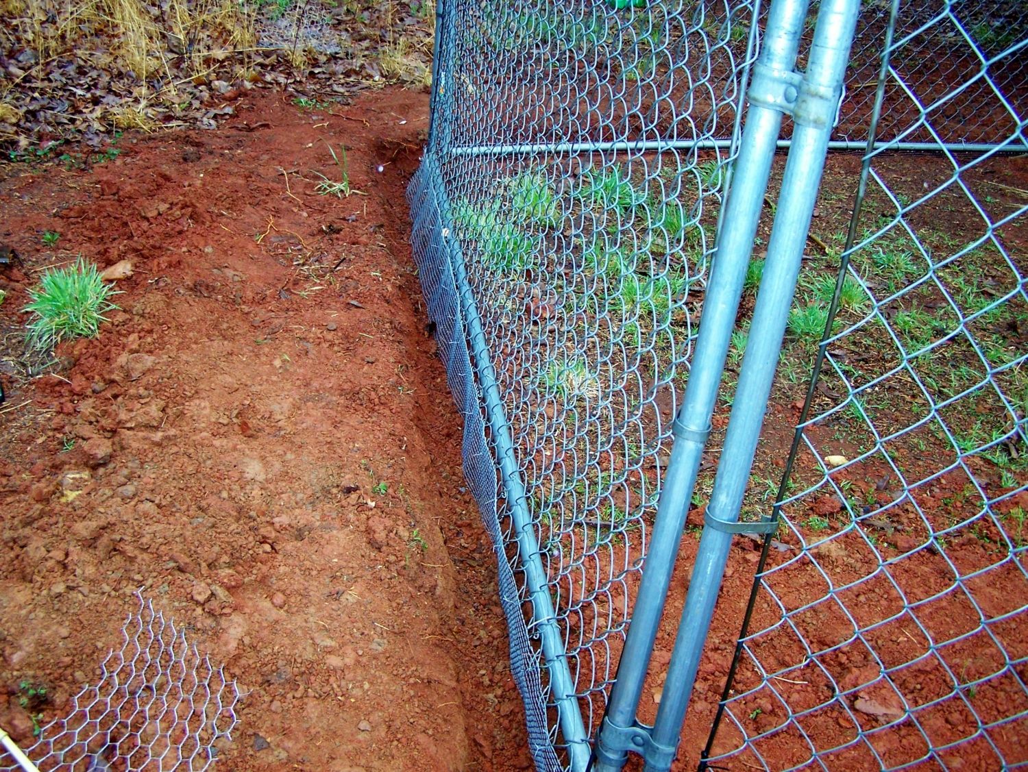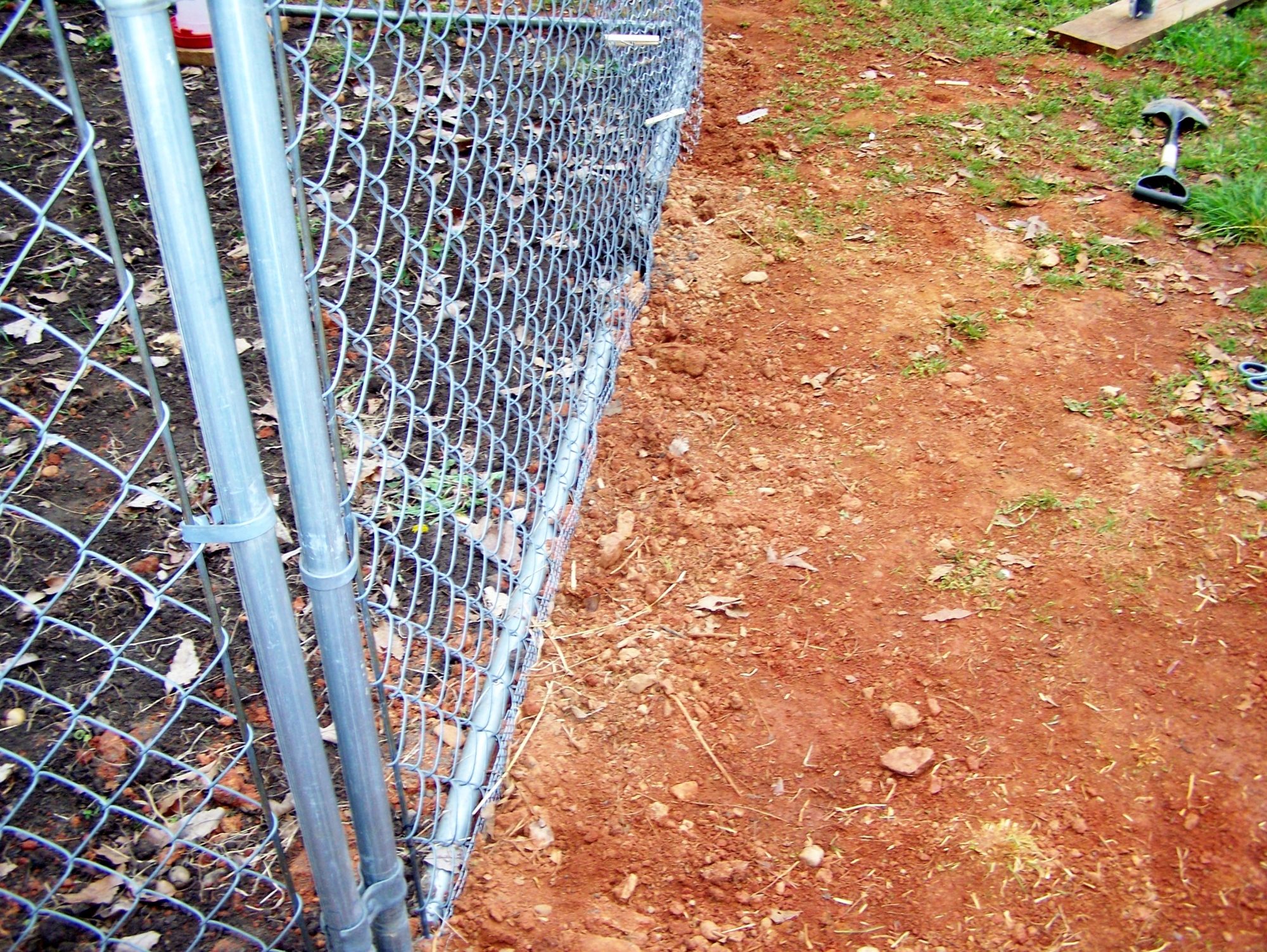 Next came the run. I knew that it had to be secure so no predators could get to my babies. I decided to use a dog kennel that was given to us by a friend. It had 4 chain link sides that were ten feet long by four feet high. I positioned the pieces around the front of the coop so that when I pulled the rope to the run door, the chicks can walk down the ramp into a nice area free of threats. I dug a trench around the circumference and secured hardware cloth. The coop is raised and decided to keep the area under the coop as a place for the chicks to go for shelter against the sun, so I buried hardware cloth under there as well, a piece on each side. Then I used chicken wire to close up each end.