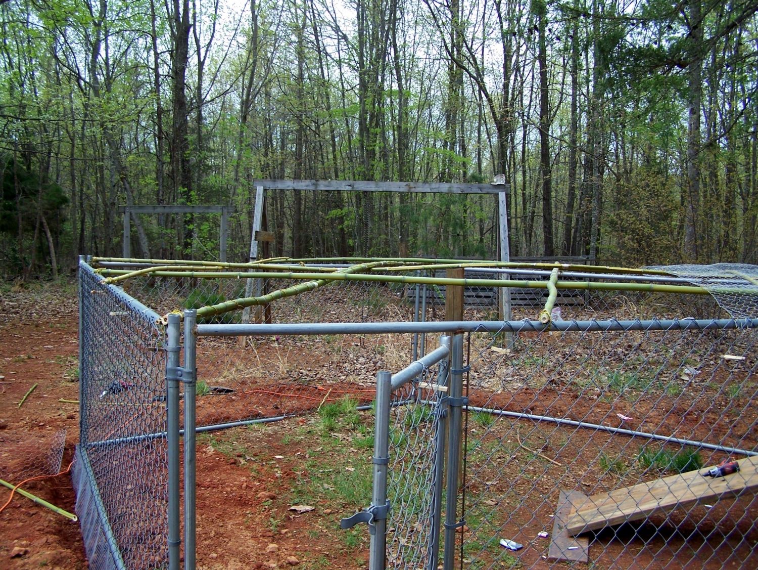Next came the top. Have to keep those hawks and owls away! I used bamboo cut down from my property, and weaved it in a checkerboard pattern across the top so it would add stability to the chicken wire. Then I cut, placed, and secured the chicken wire over the entire top of the run.