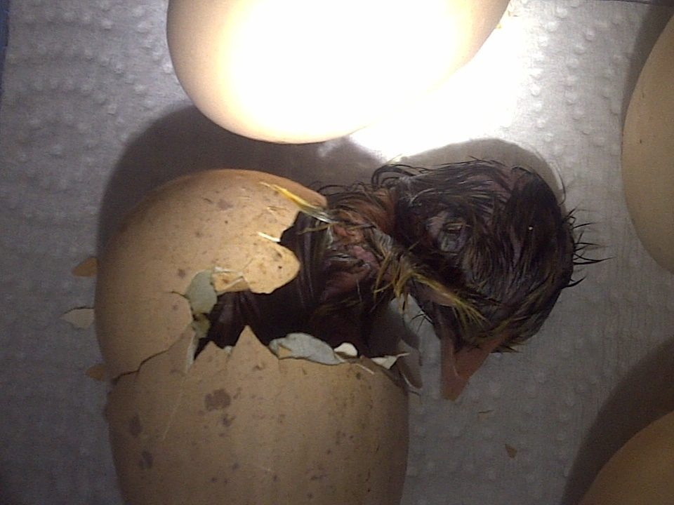 Ok, I know I heard the peeps!!! SO exciting!! I had my ear to the bator and sure enough, I hear three little chirps. I was starting to think it was the evil wild birds outside toying with me. LOLOL